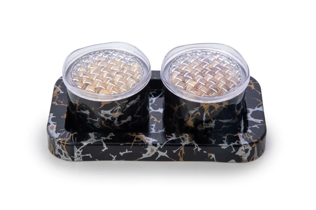Design: A stylish and modern snack serving set featuring a black and gold marble pattern. The set includes two small, round containers that fit neatly onto a matching rectangular tray.
