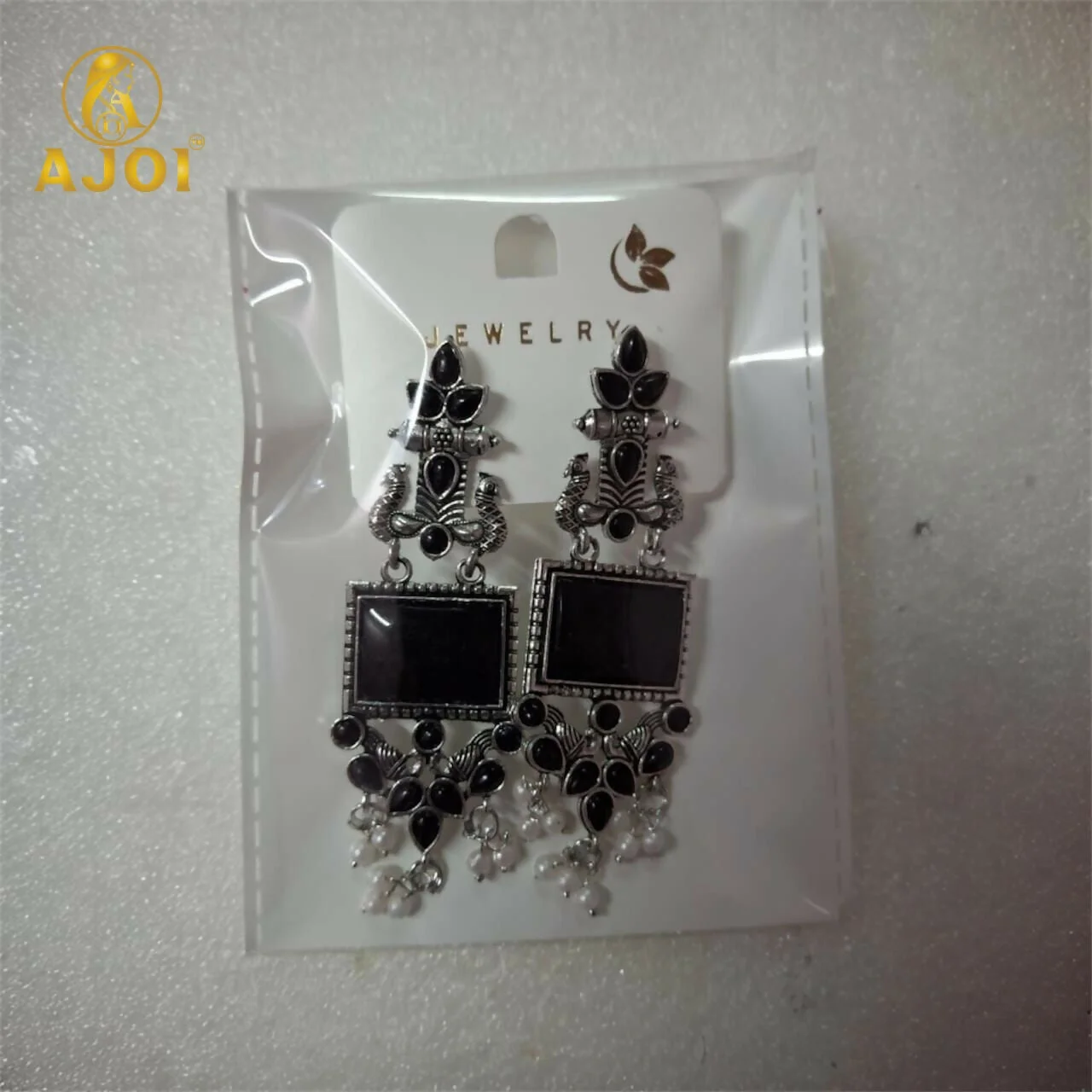 Below the square stone lies a charming arrangement of leaf-style black beads, arranged in a floral drop formation that enhances the earring’s ethnic beauty. These stones add movement, shine, and artistic depth to the overall design.