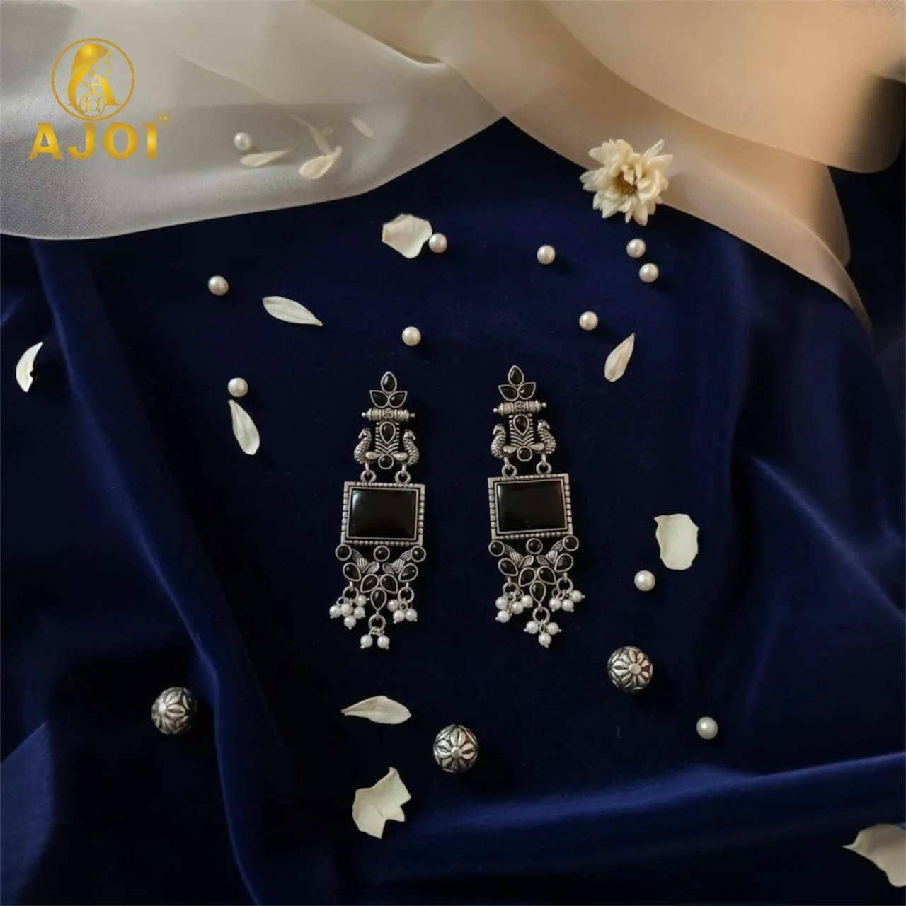 The earrings are finished with clusters of soft white pearl drops, creating a gentle sway with every step you take. These pearls beautifully contrast the dark black stones, giving the earrings a balanced, graceful, and luxurious feel.