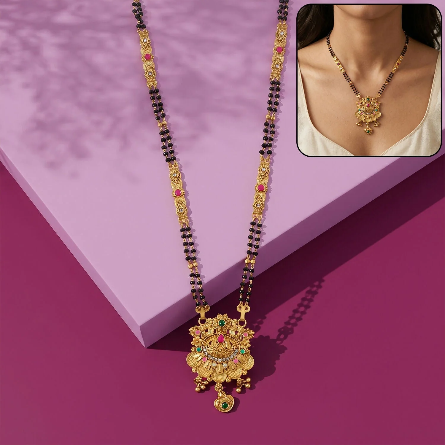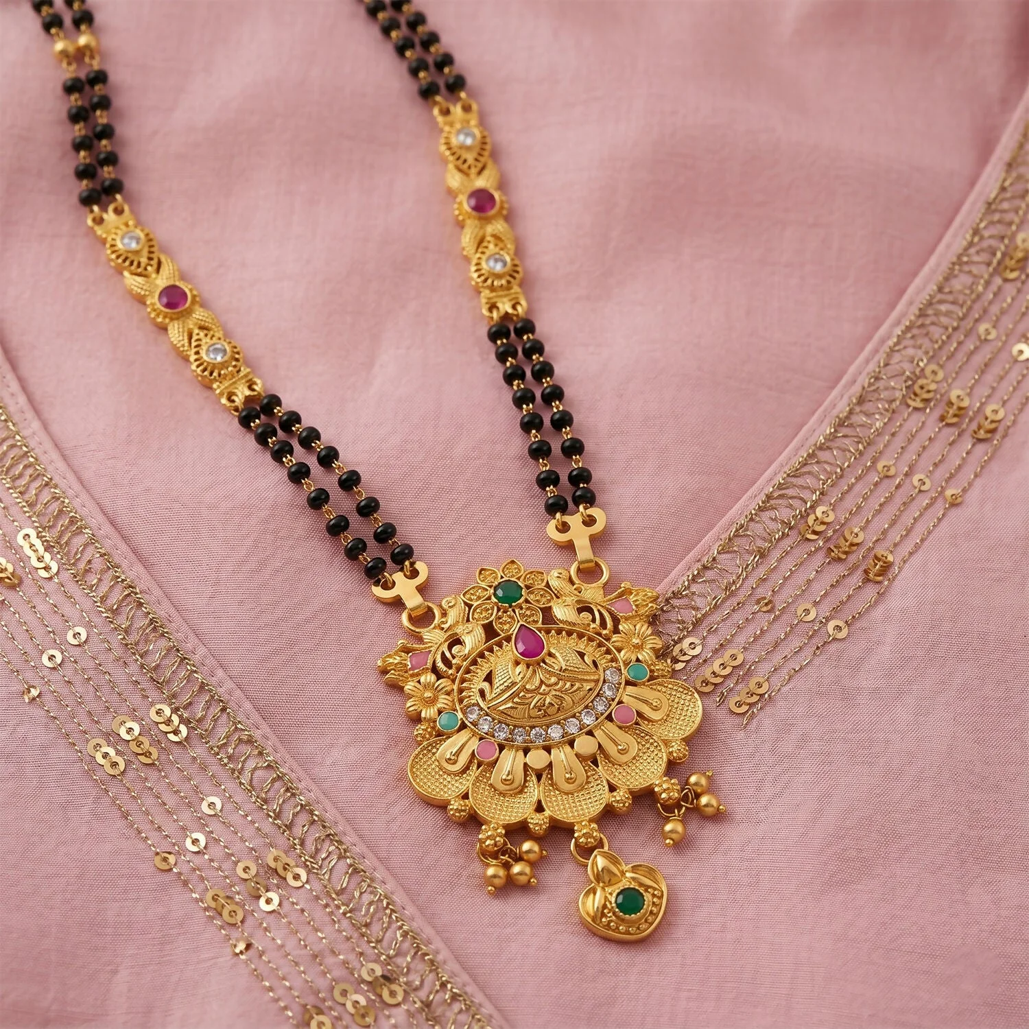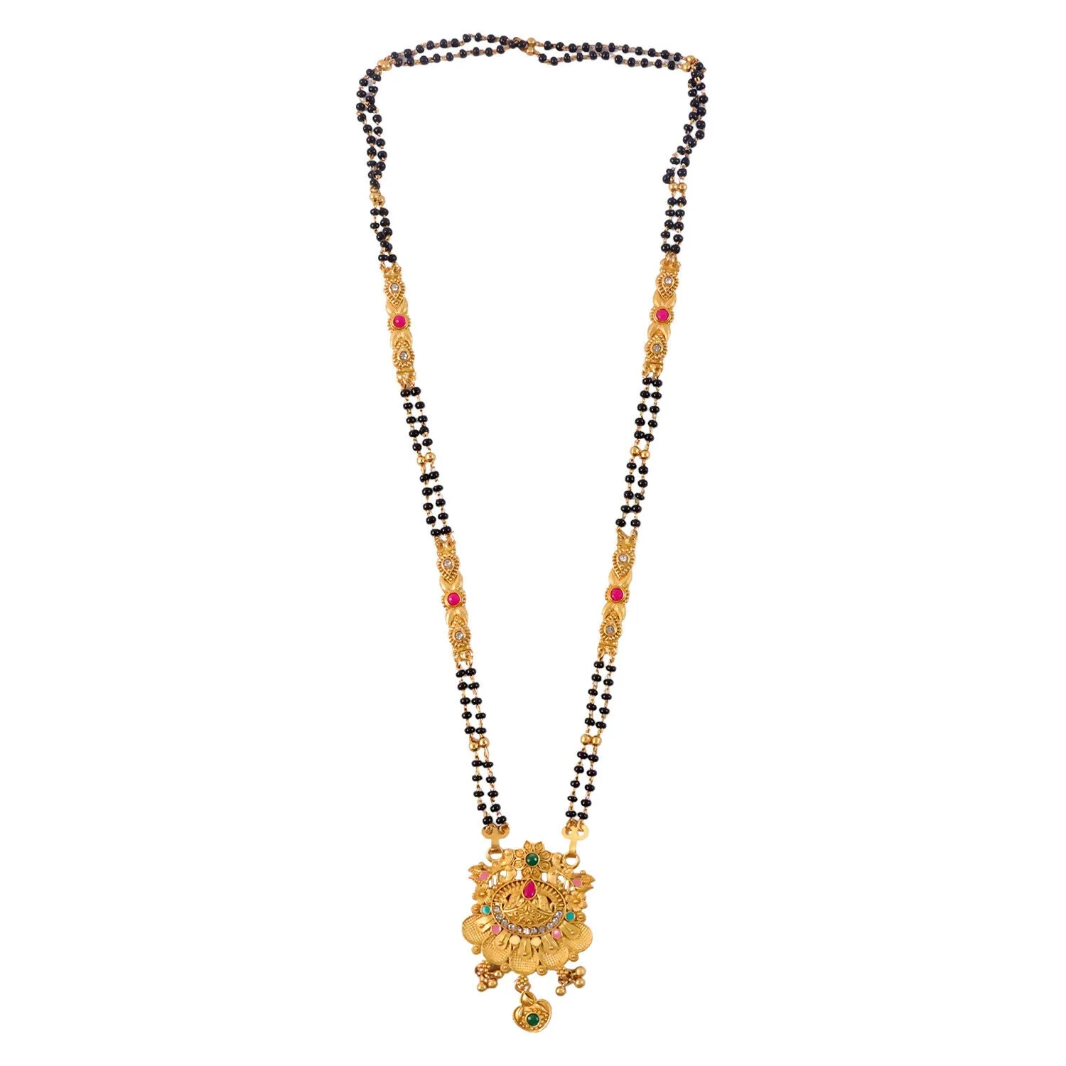 Be the first to review Antique Finish Floral Crown Lotus Pendant with Pink Enamel Petals Long Double Strand Mangalsutra!