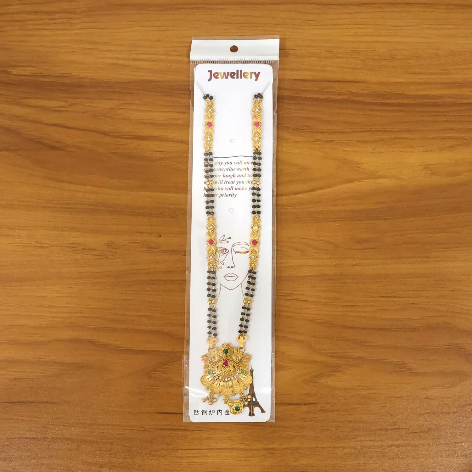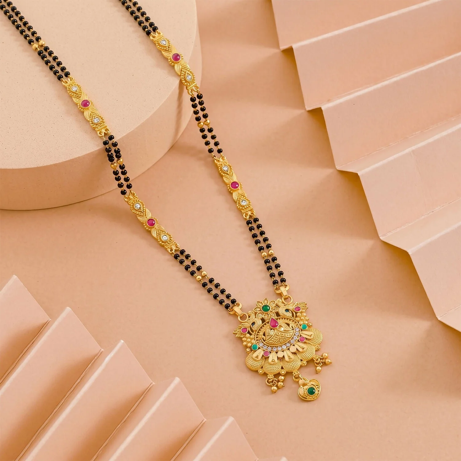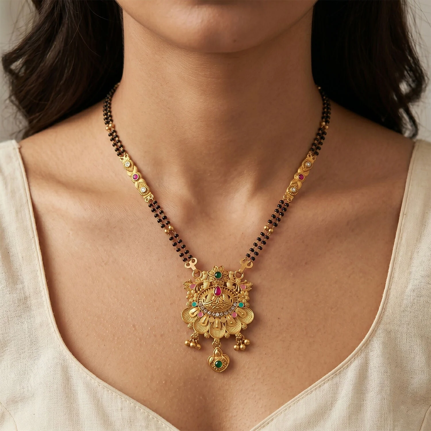 Be the first to review Antique Finish Floral Crown Lotus Pendant with Pink Enamel Petals Long Double Strand Mangalsutra!