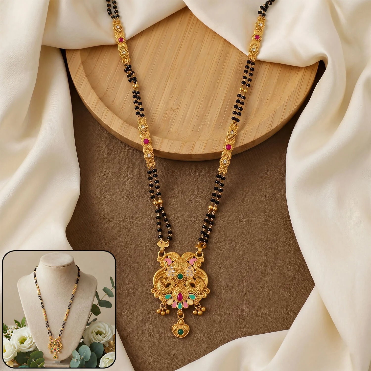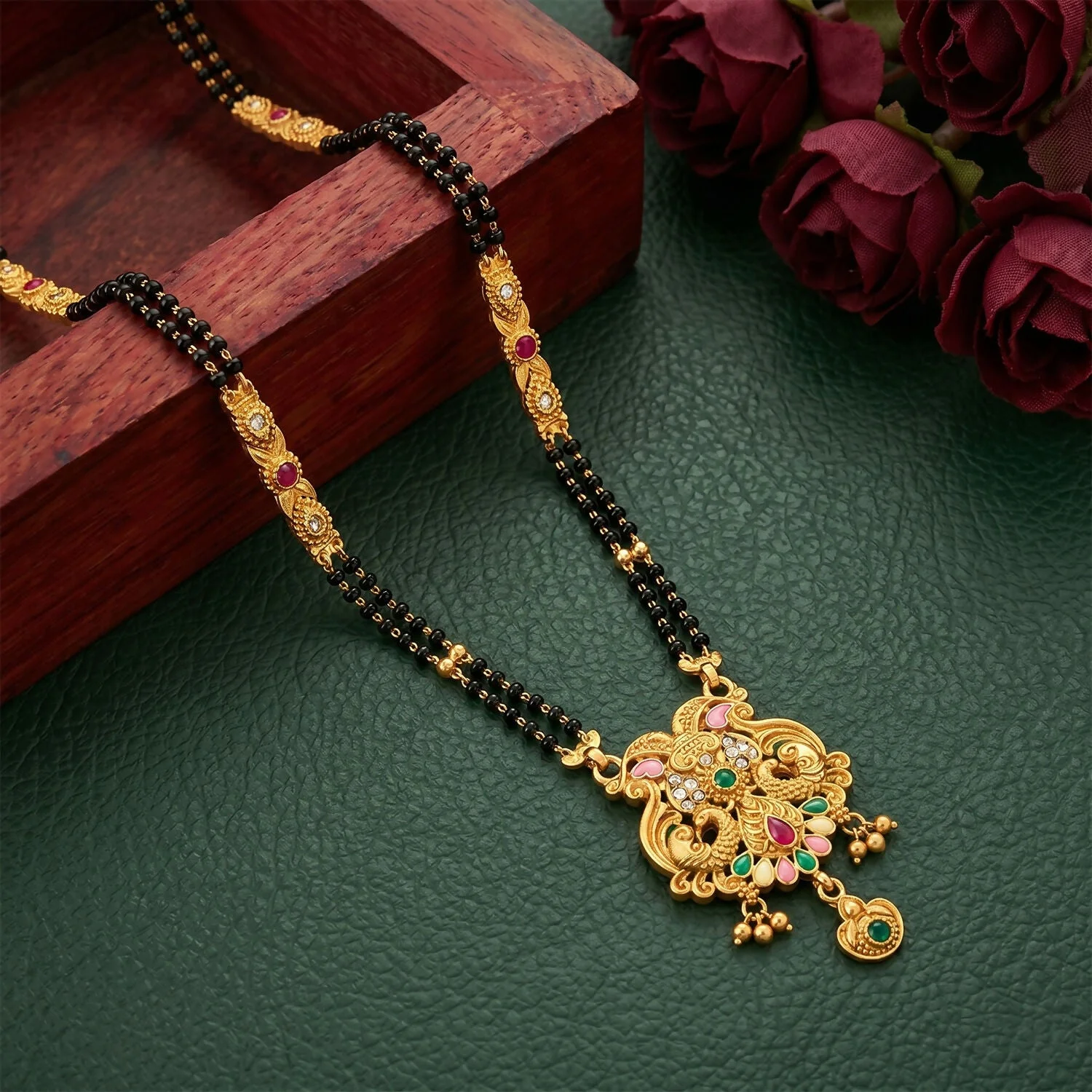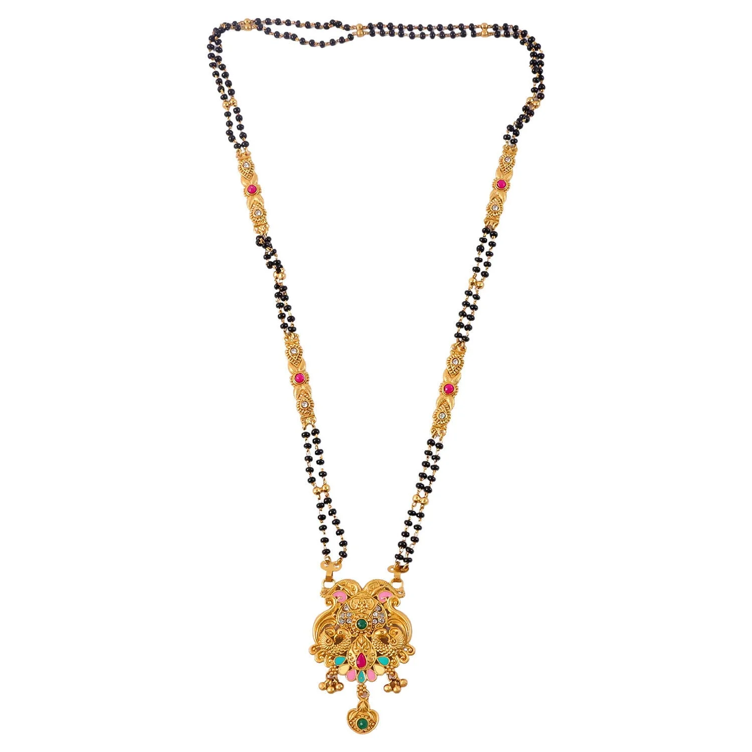 Be the first to review Antique Finish Makara Dragon Scroll Pendant with Fan Enamel Base Long Double Strand Mangalsutra!