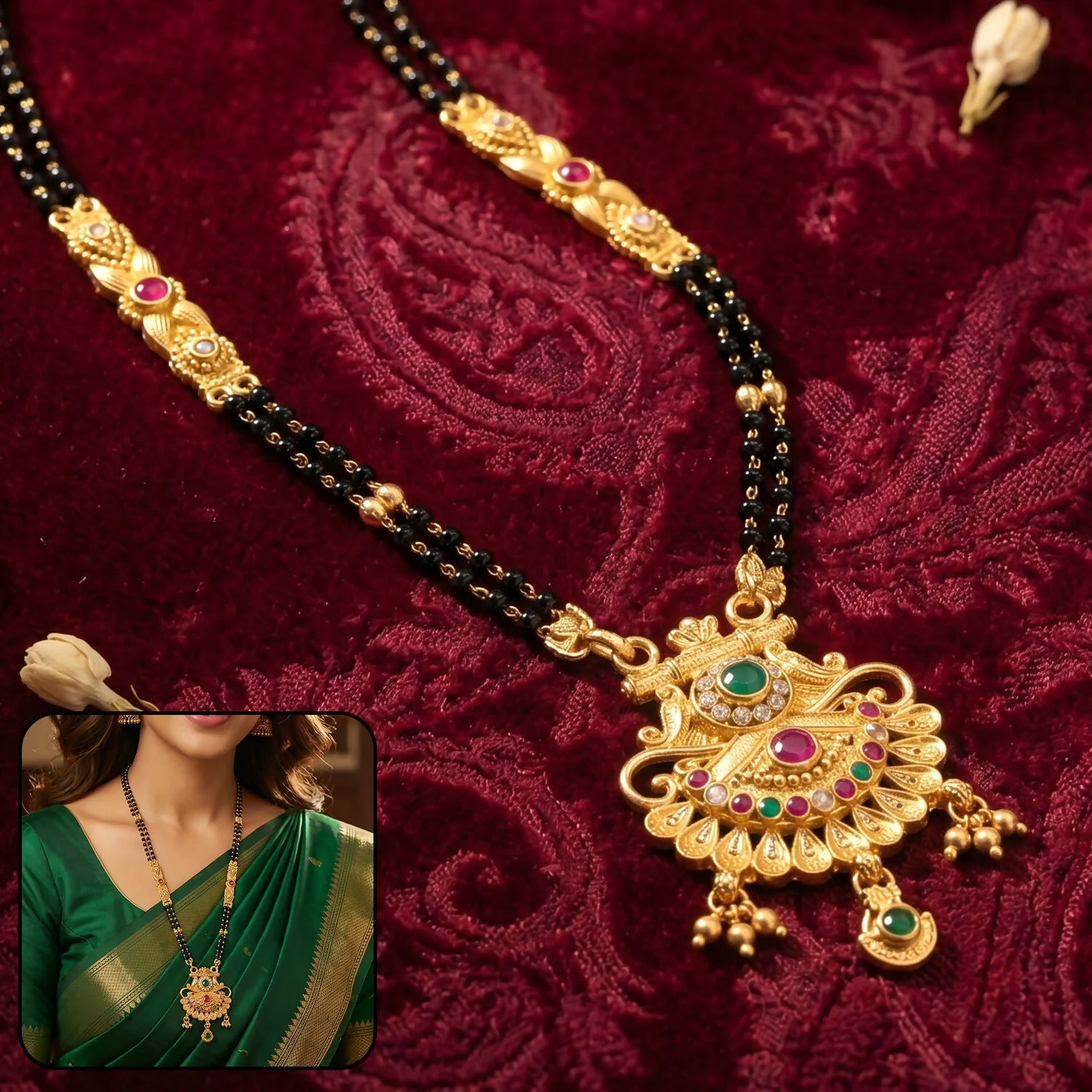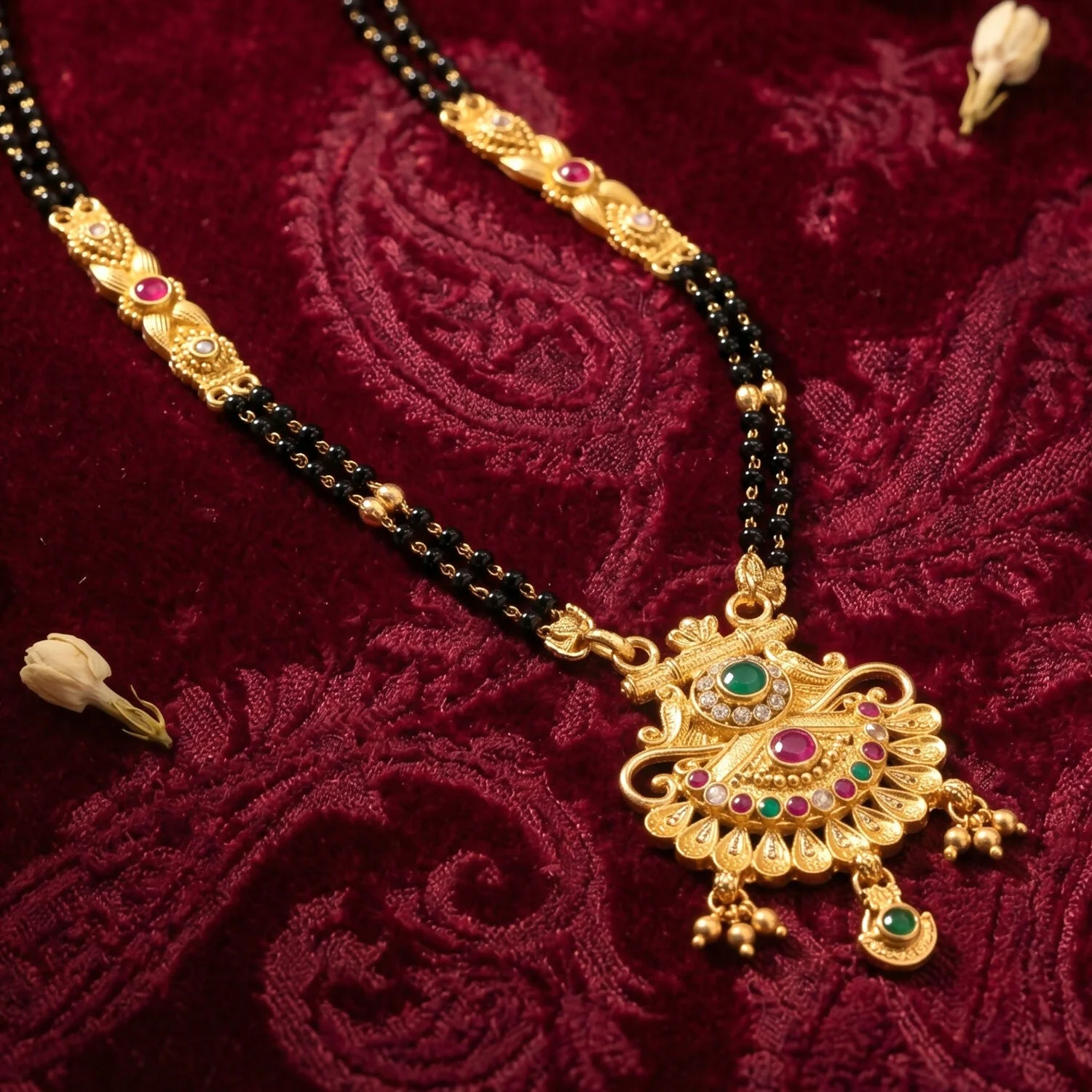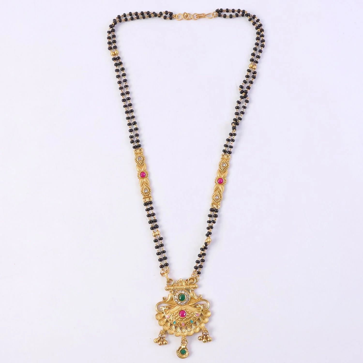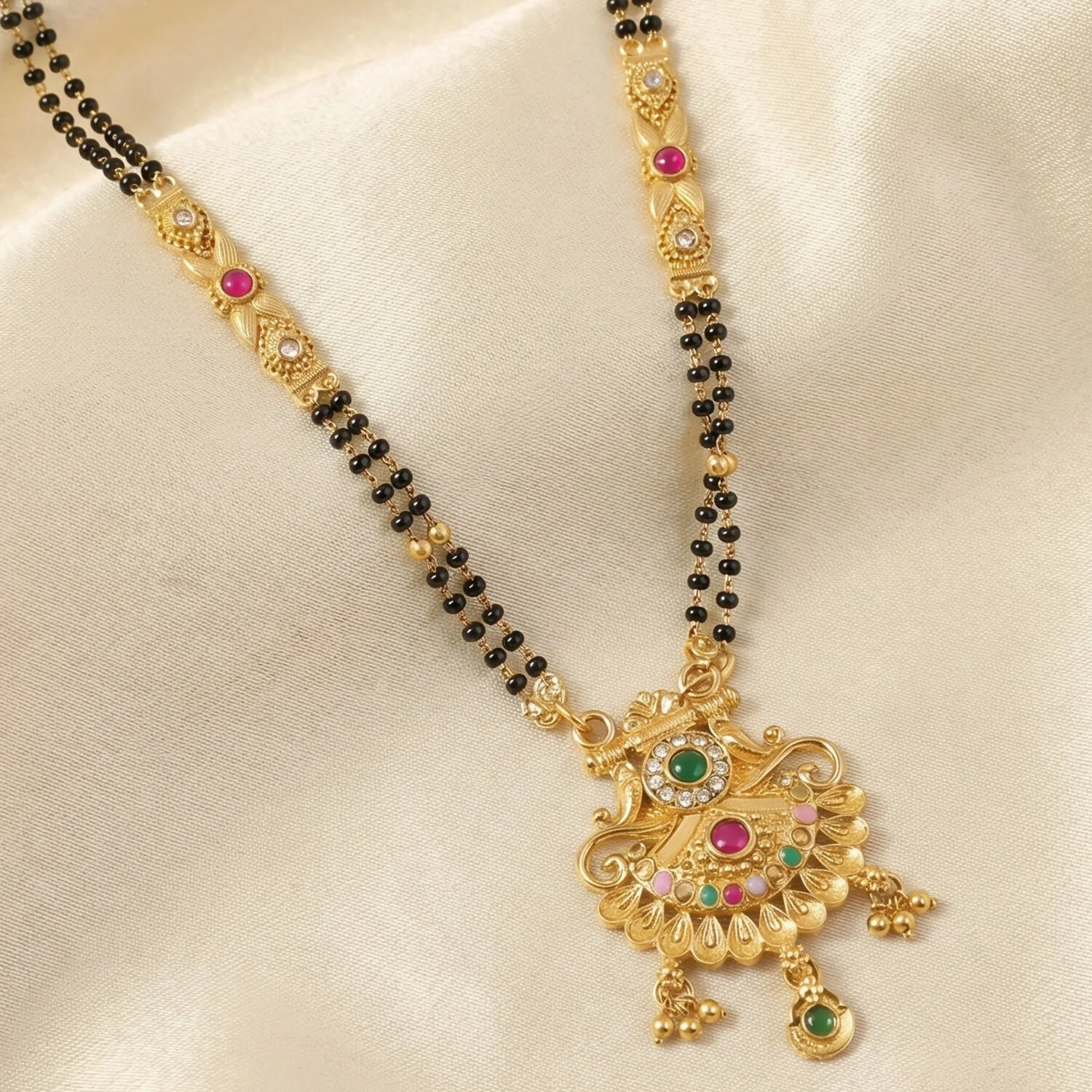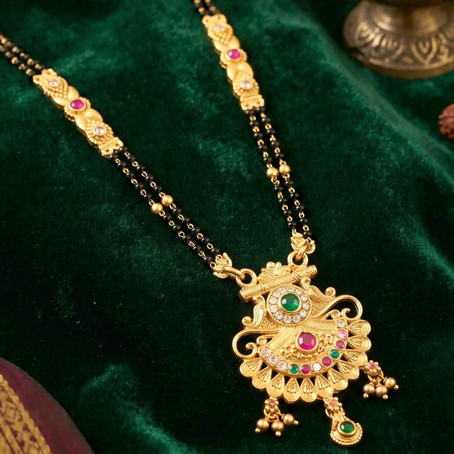 Be the first to review Antique Finish Navaratna Peacock Feather Fan with Multi-Stone Rows Extra Long Double Strand Mangalsutra!