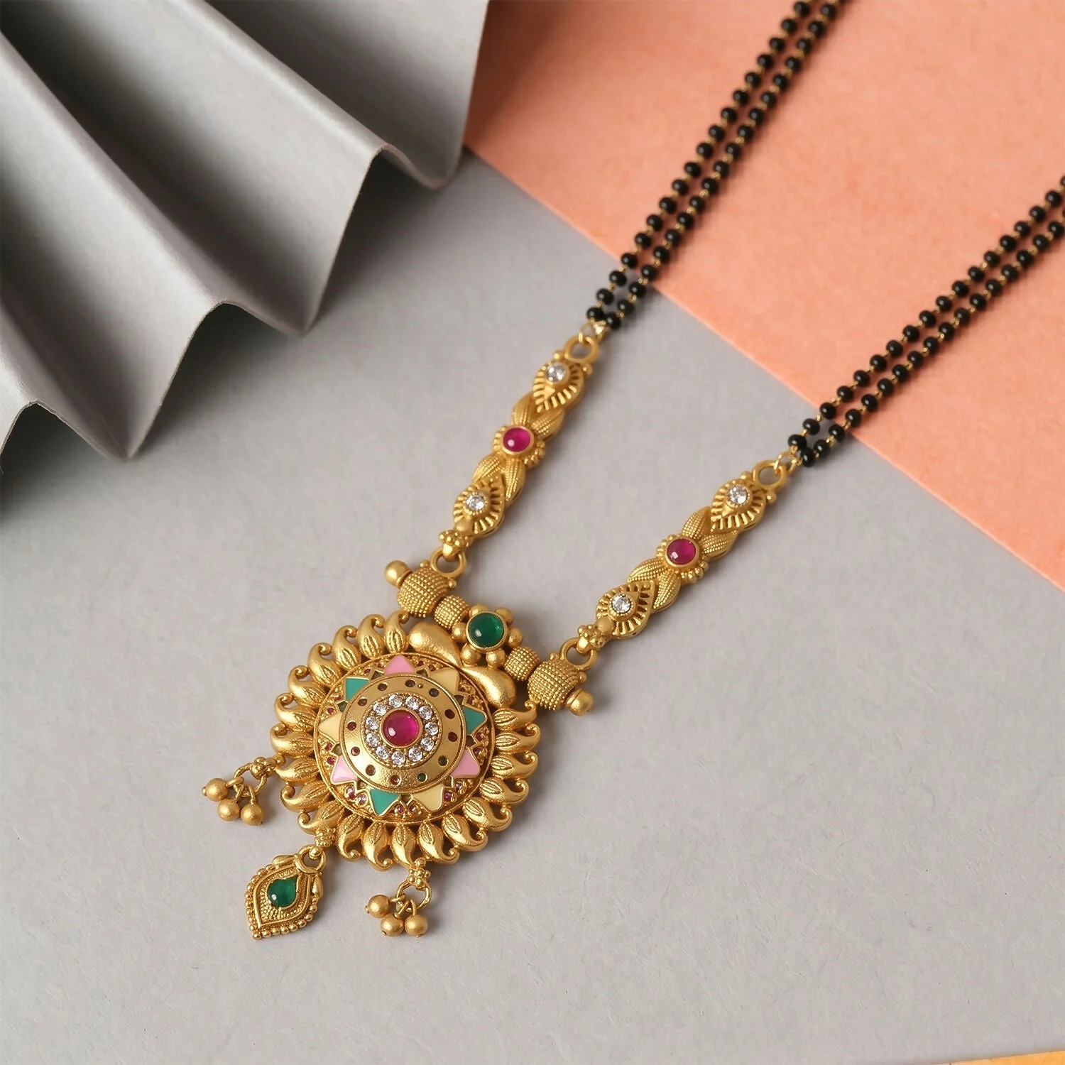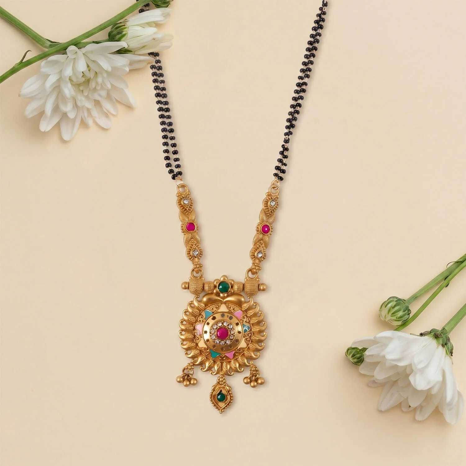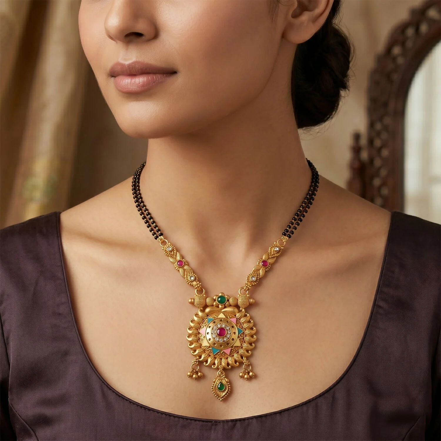 Be the first to review Antique Finish Sun Wheel Pendant with Multi-Petal Enamel Double Strand Mangalsutra!
