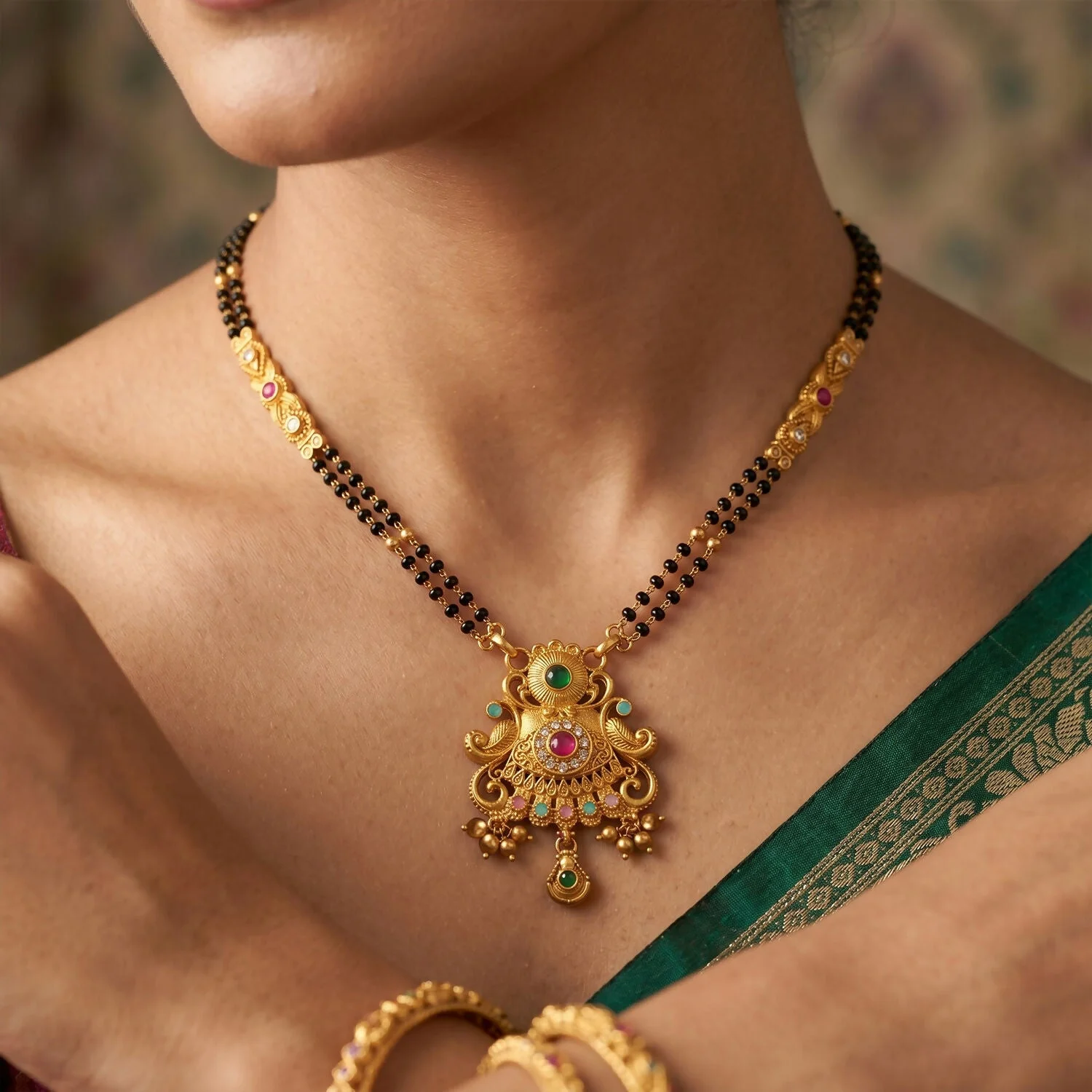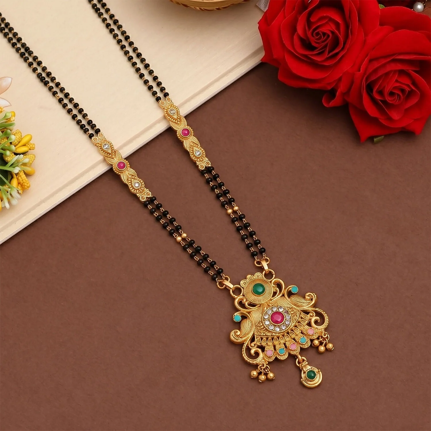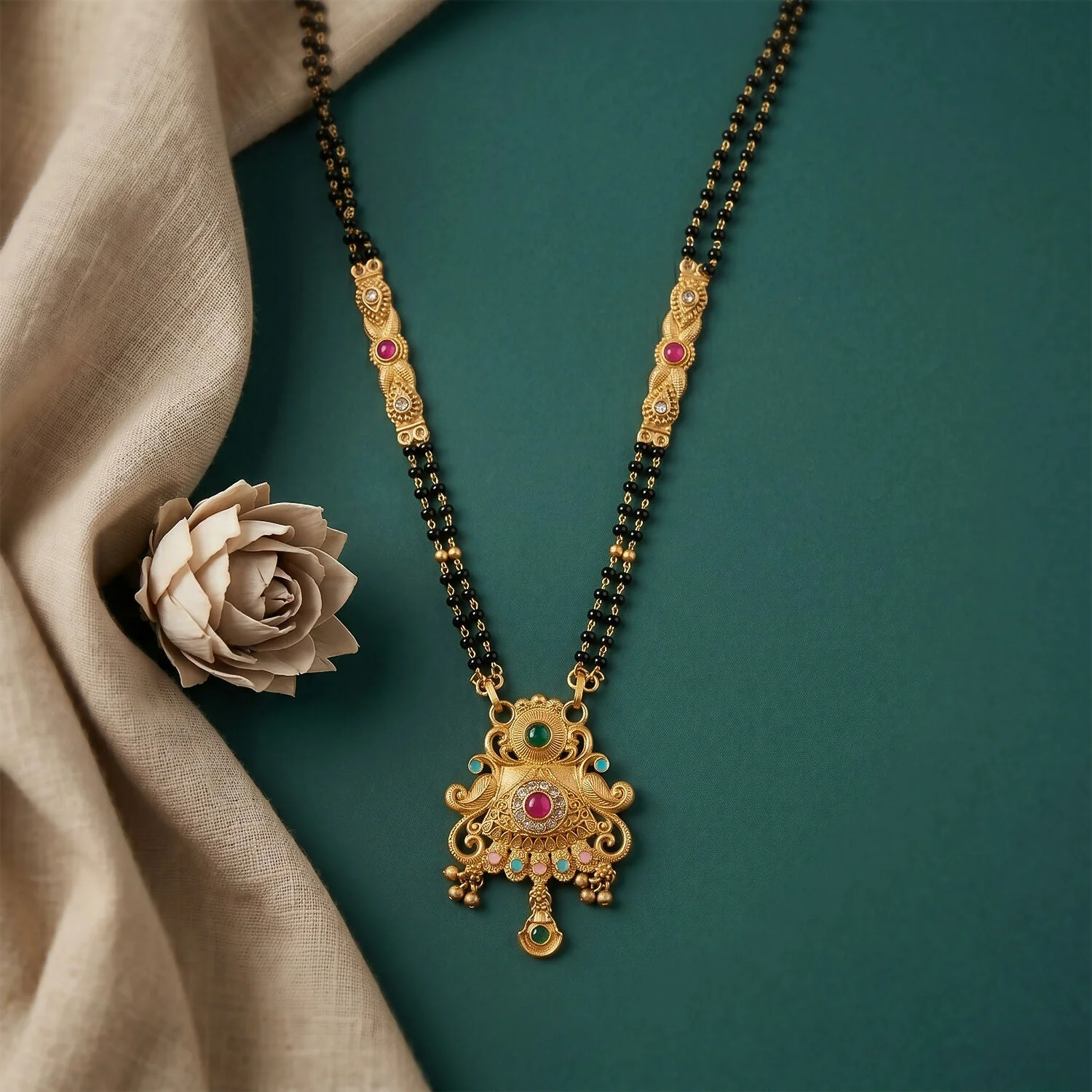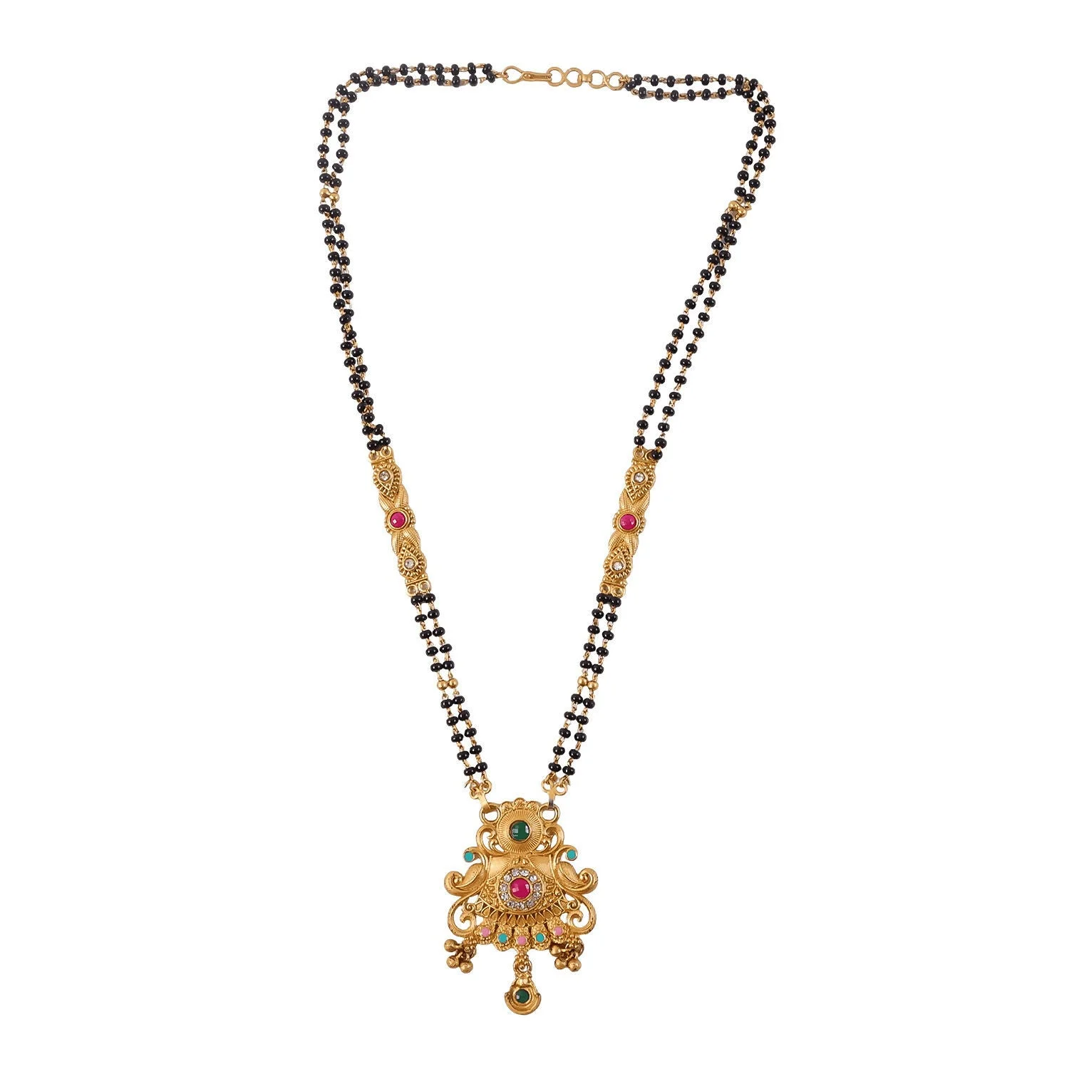 Be the first to review Antique Finish Sunburst Filigree Pendant with Rainbow Bead Cascade Double Strand Mangalsutra!