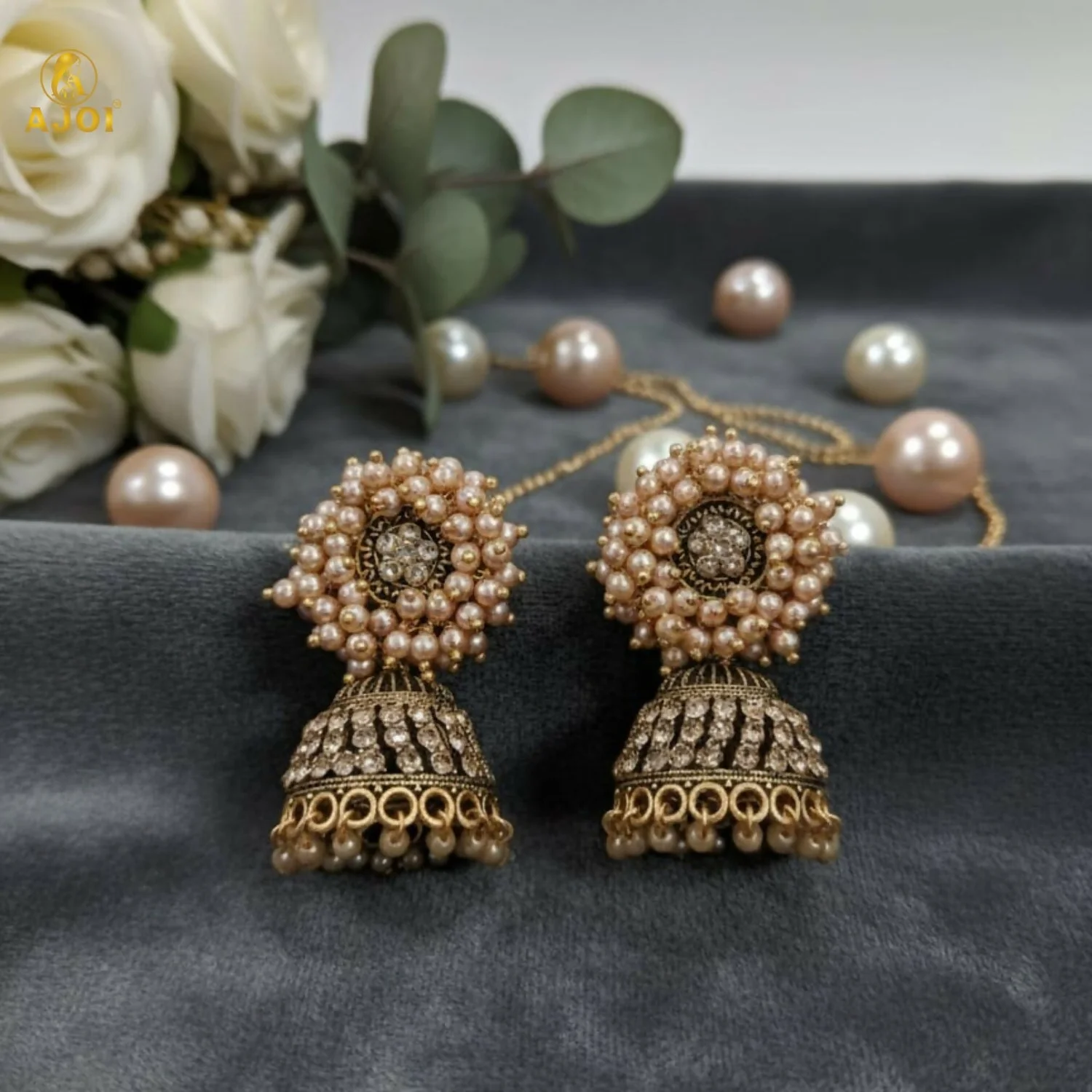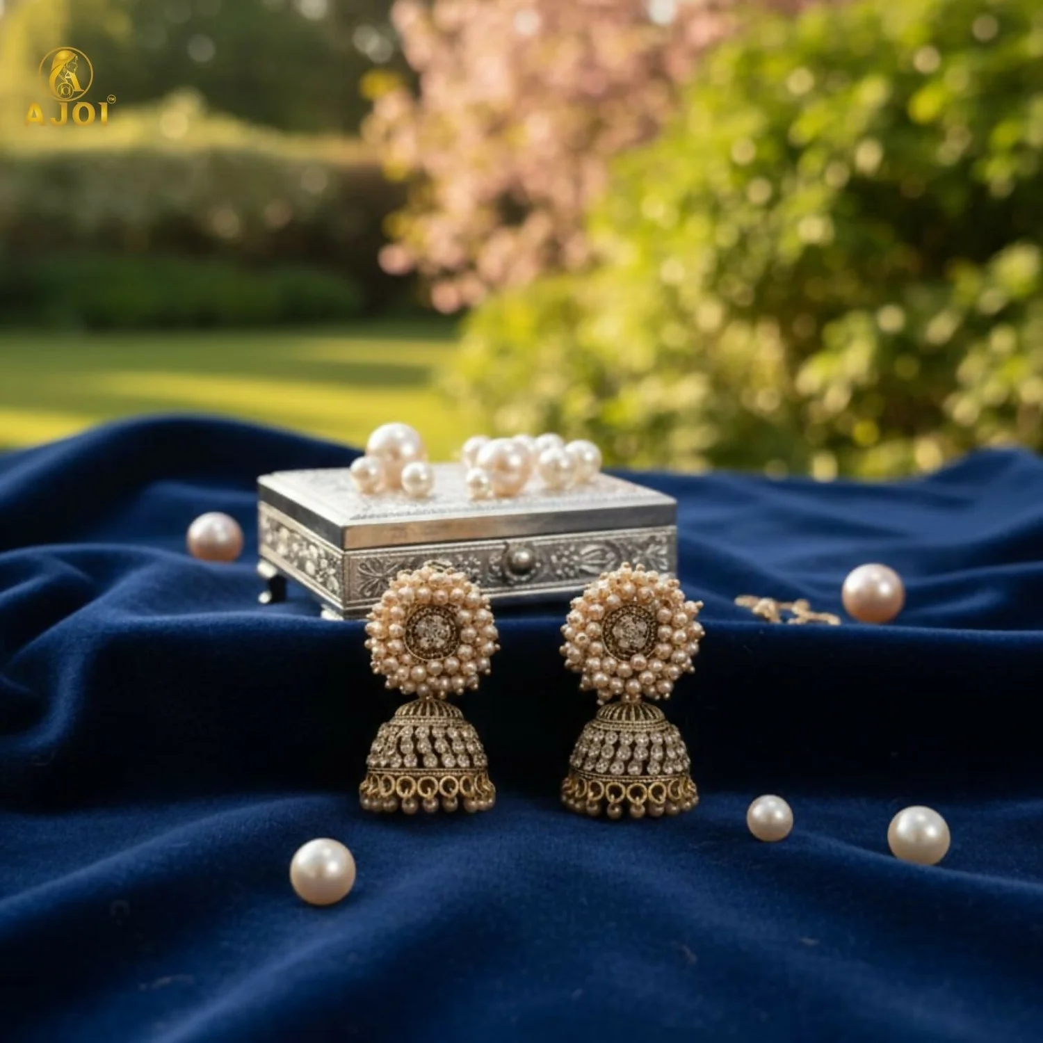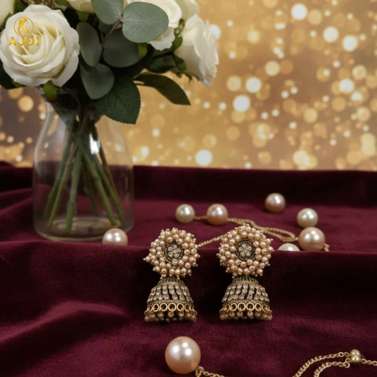 The intricately detailed jhumka is enhanced with delicate pearl danglers that add graceful movement and a soft, luxurious charm. Perfectly balanced between tradition and elegance, these earrings are lightweight yet striking—ideal for weddings, festive celebrations, and special occasions.