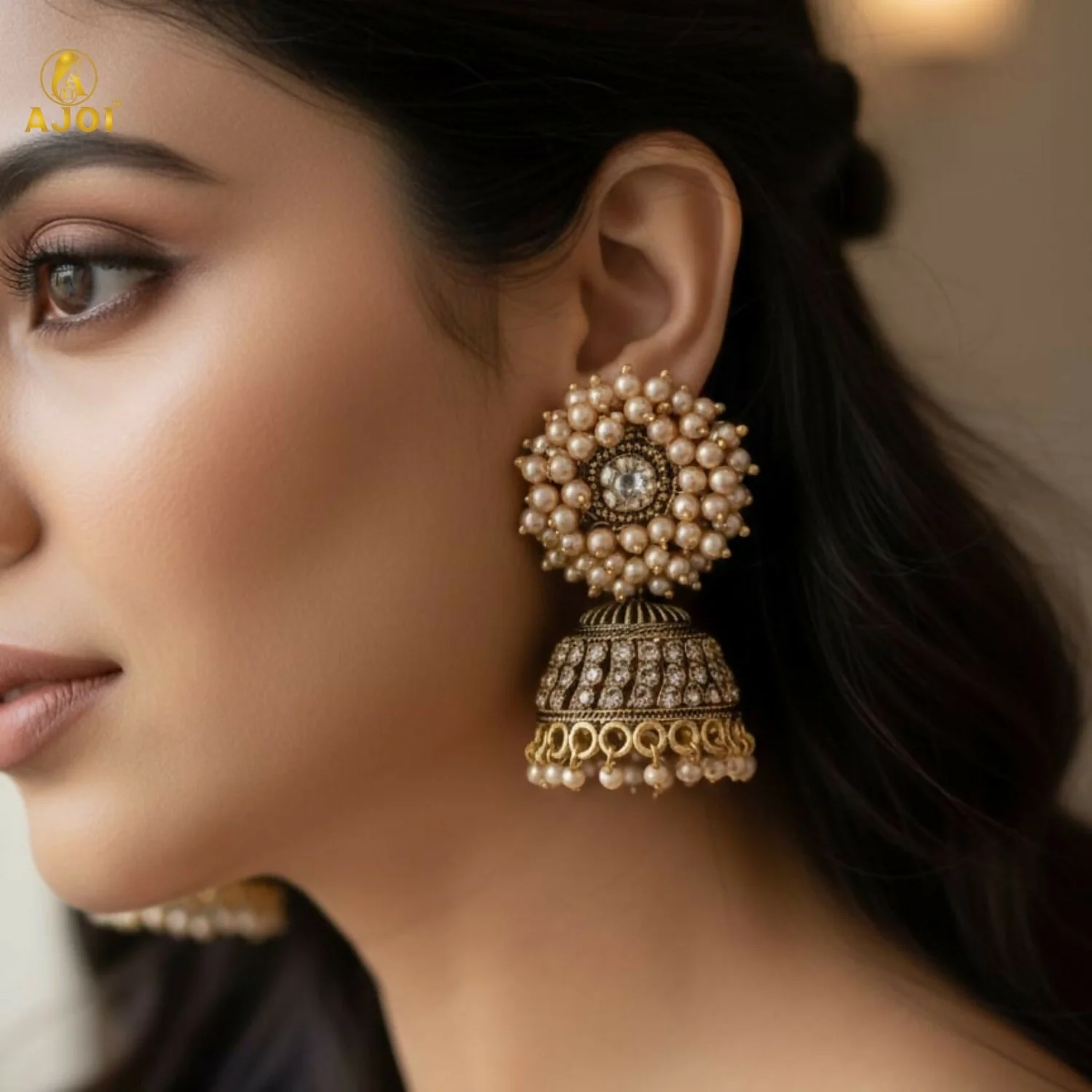Indulge in timeless elegance with these exquisitely crafted Royal Pearl Bloom Jhumka Earrings, designed to embody grace and sophistication. Featuring a radiant gold-tone antique finish, the floral stud is beautifully adorned with clustered pearls and a shimmering crystal center, creating a refined and regal appeal.