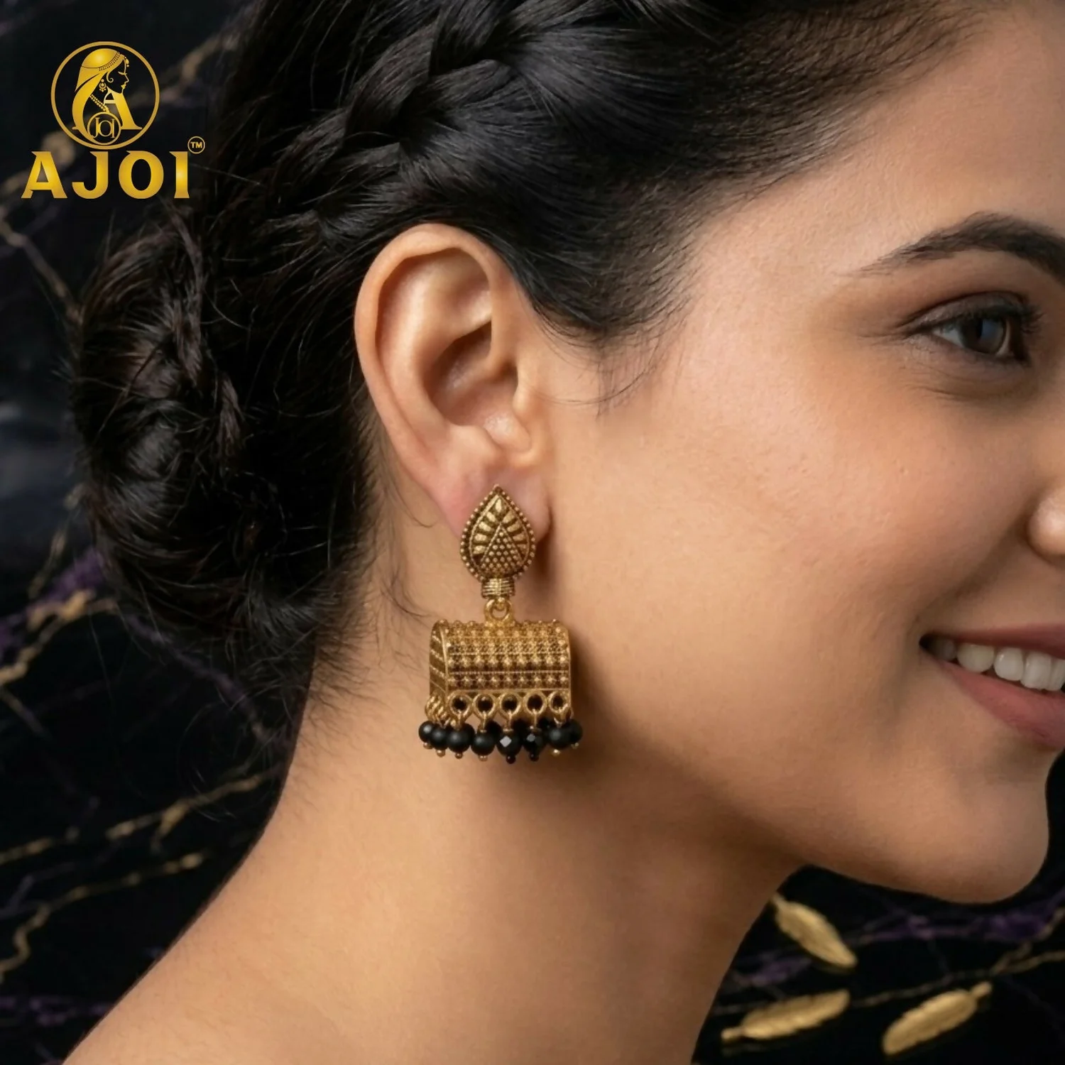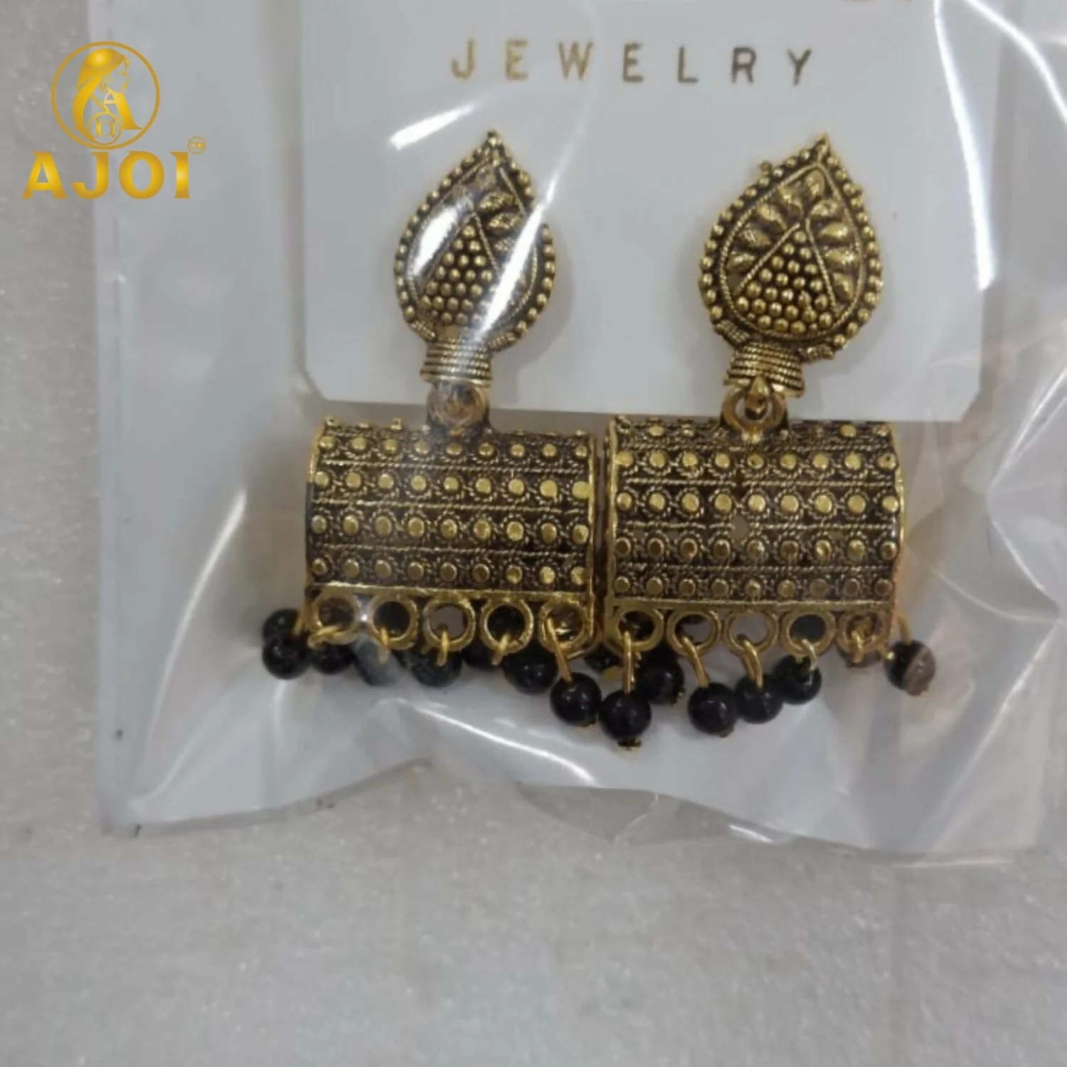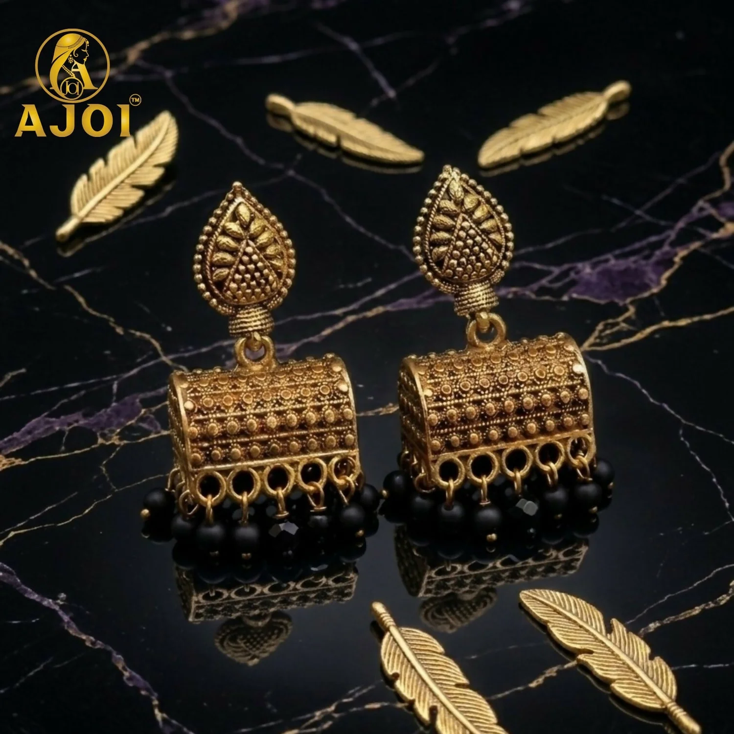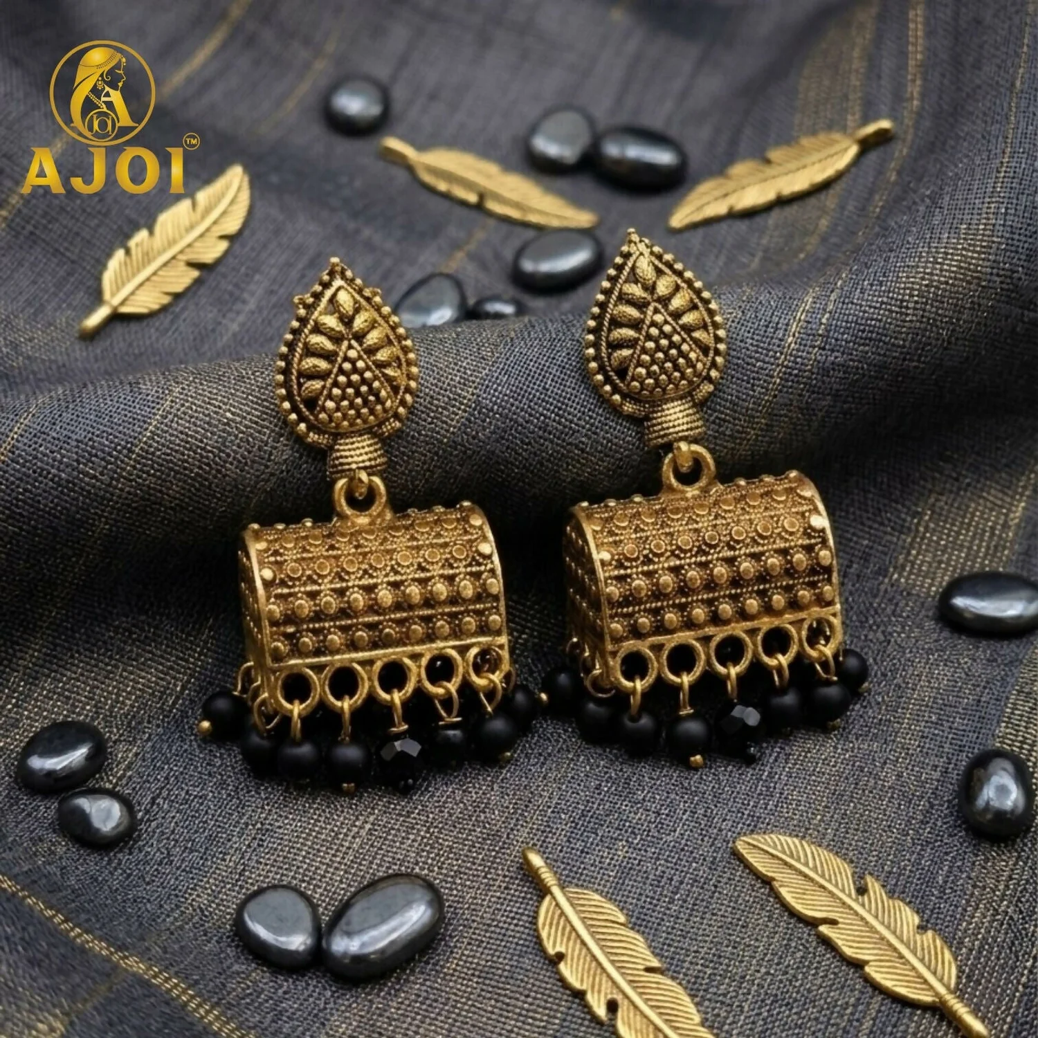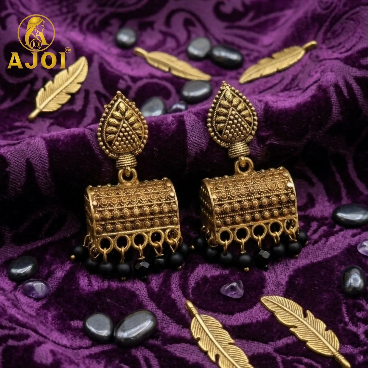 Be the first to review Antique Gold-Plated Leaf Design Jhumka Earrings with Black Bead Drops!