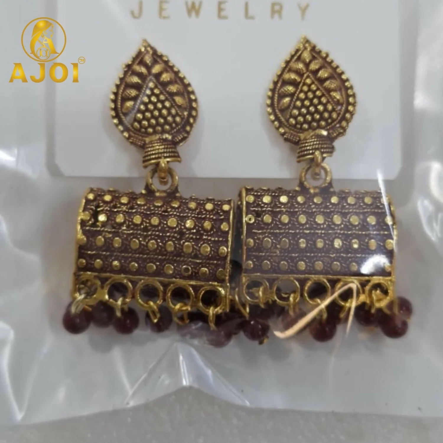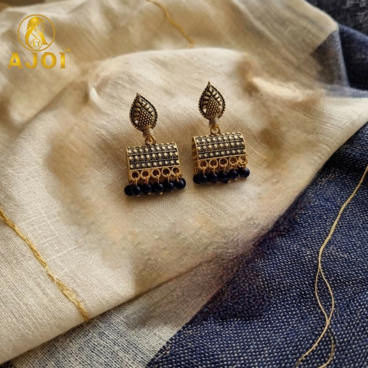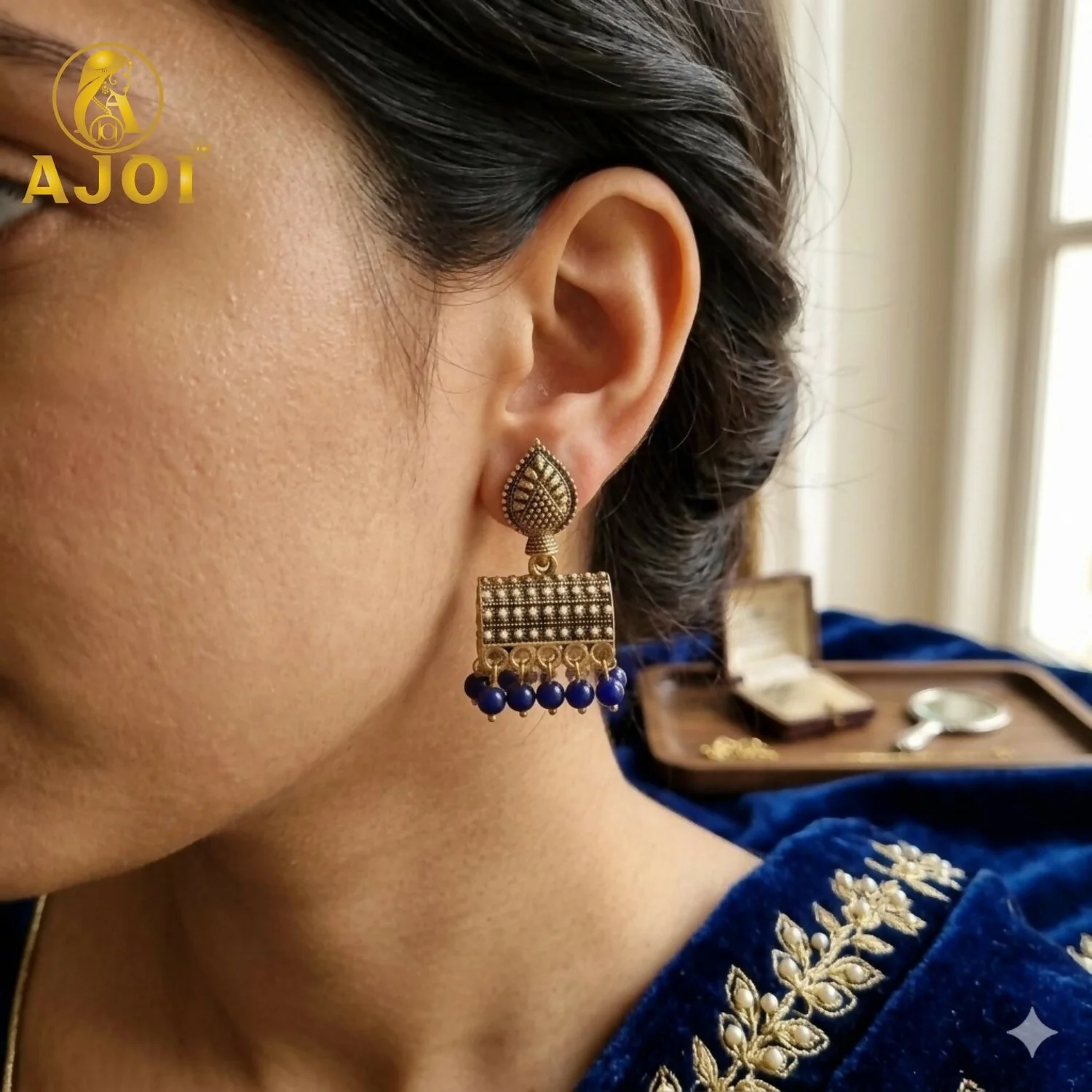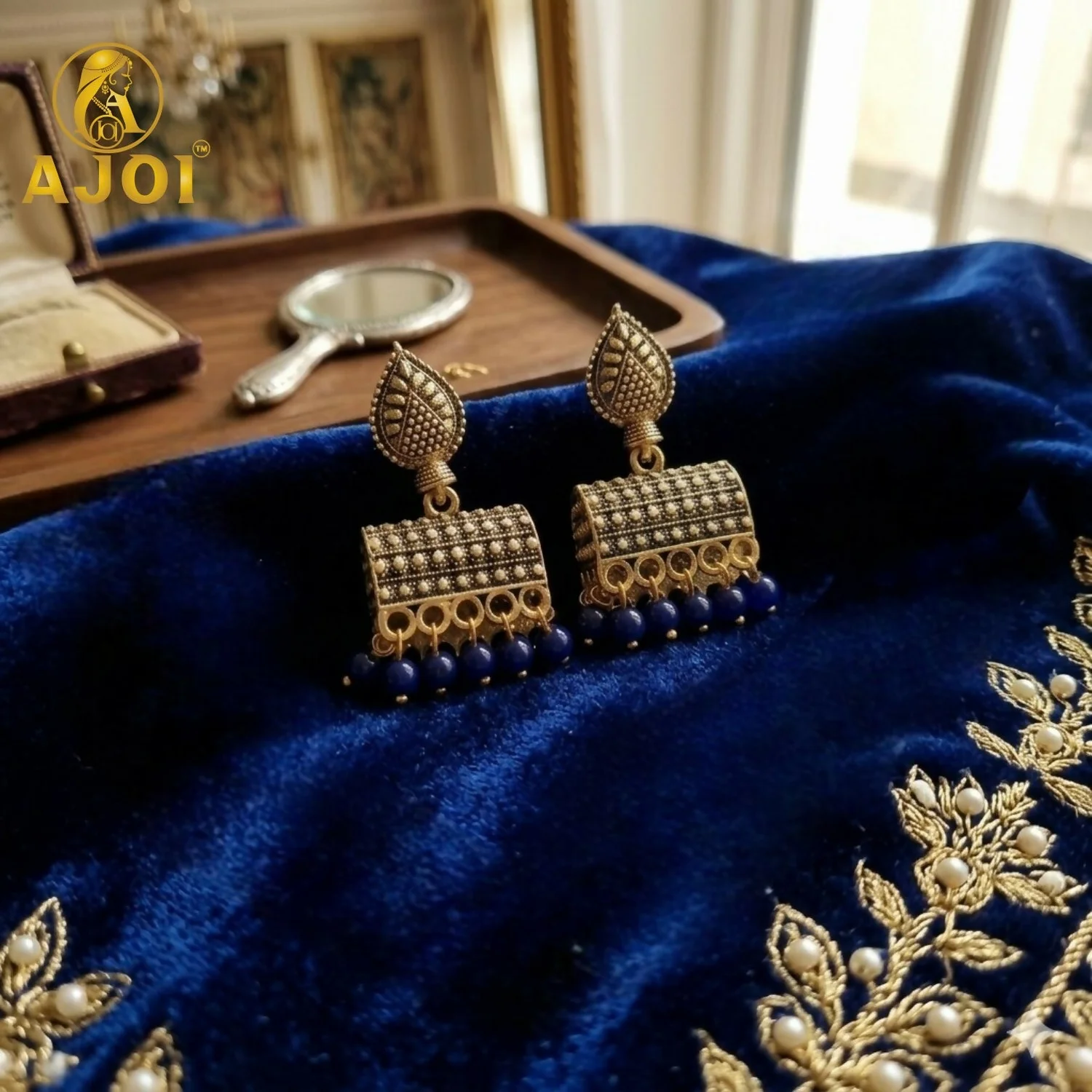 Be the first to review Antique Gold-Plated Leaf Design Jhumka Earrings with Blue Beads!