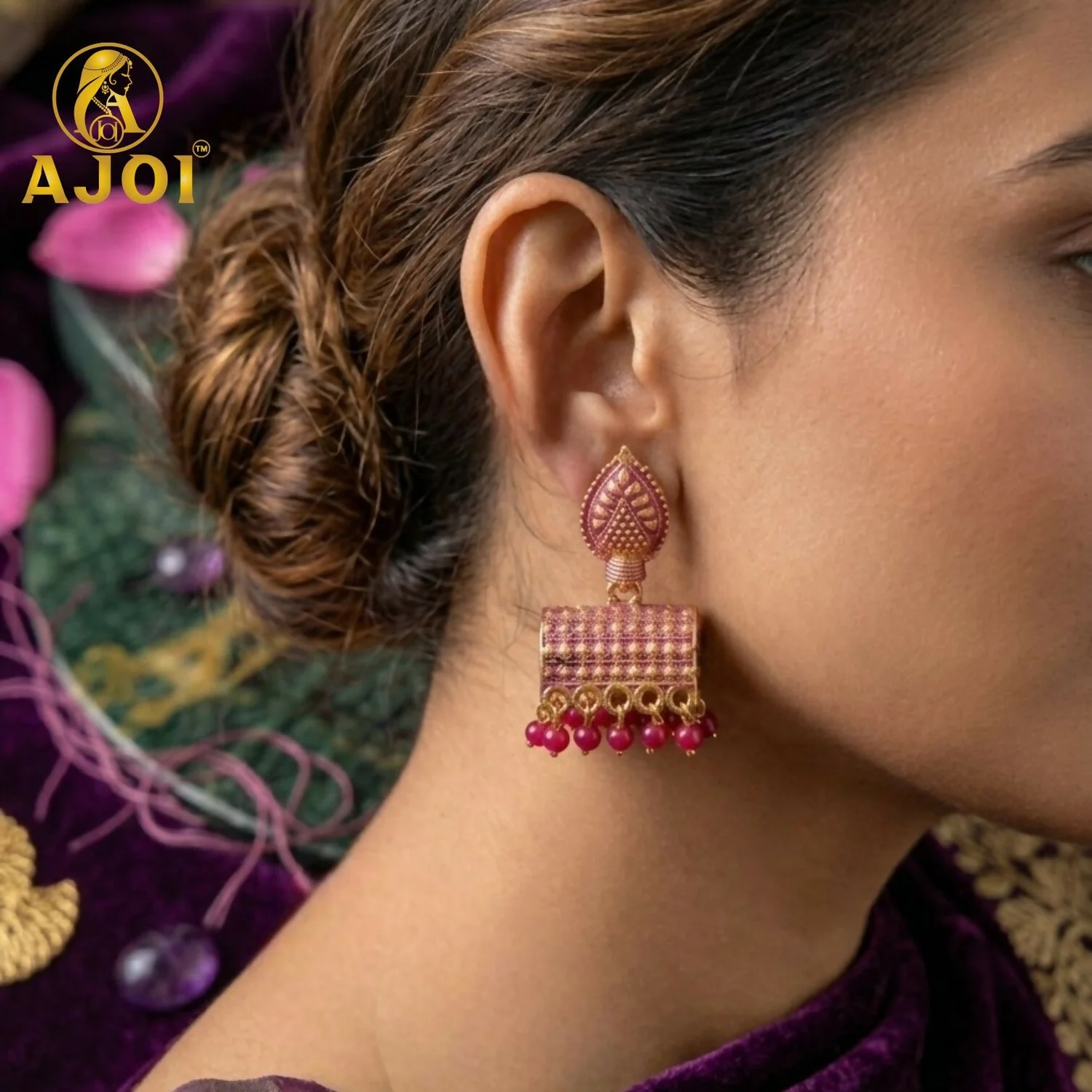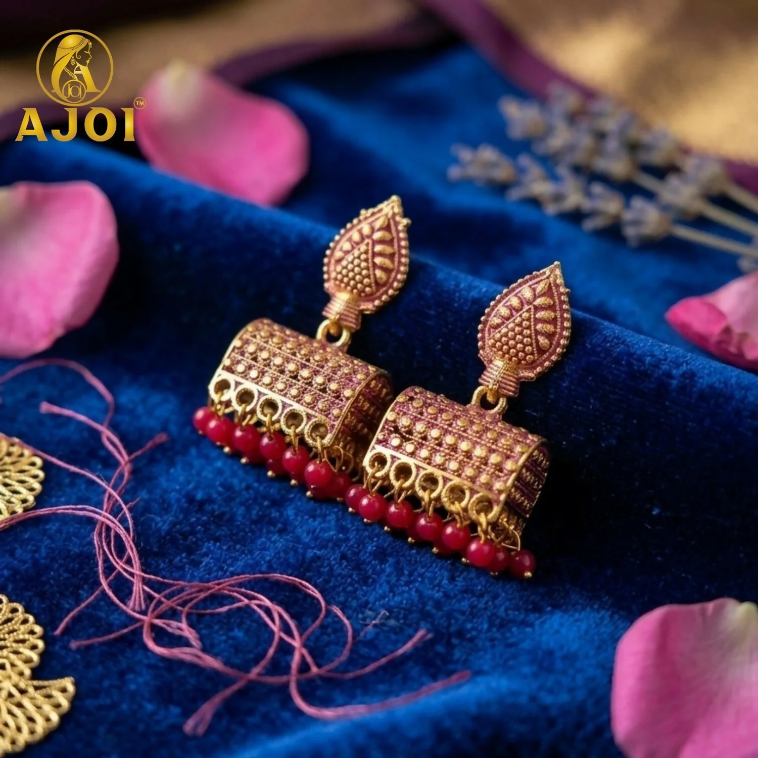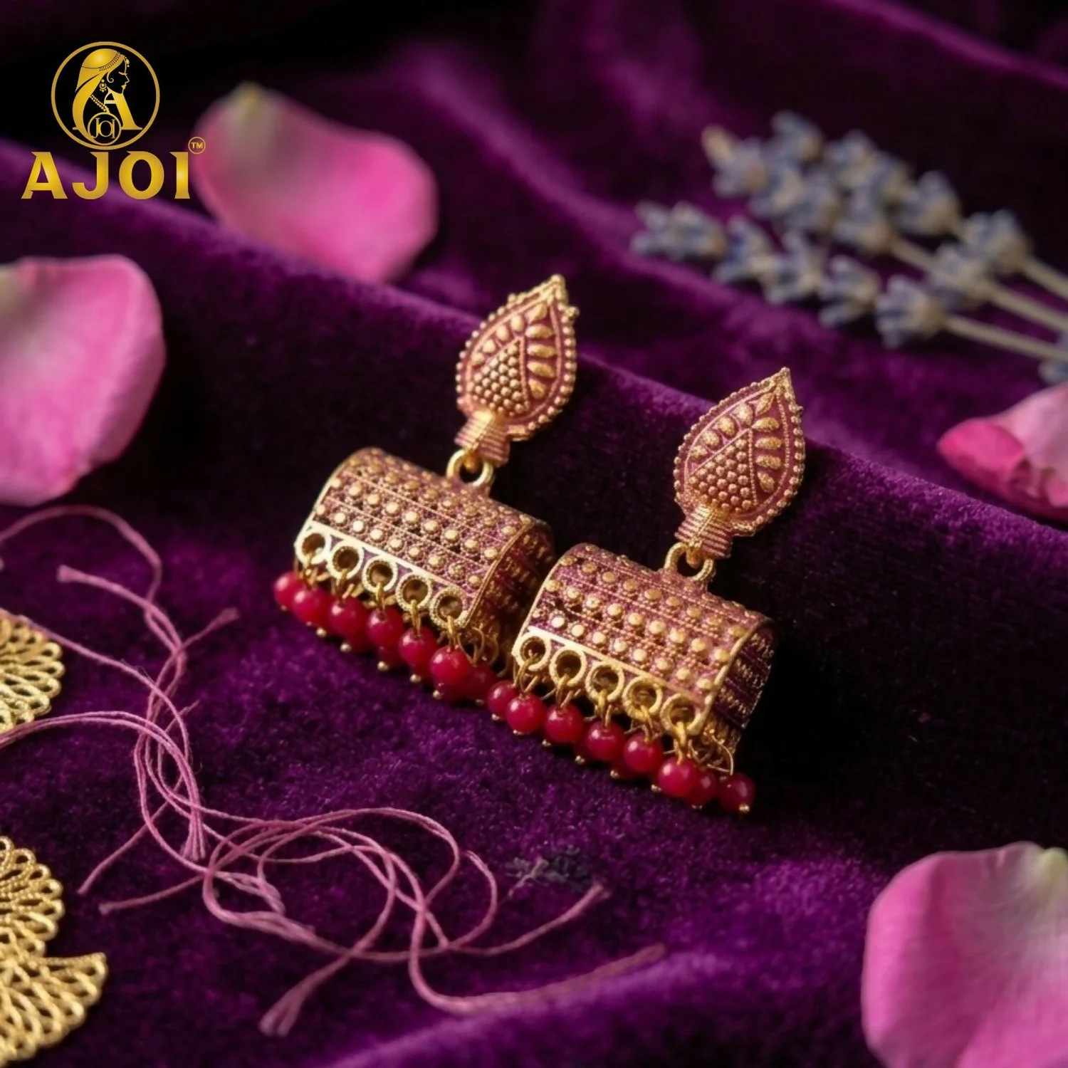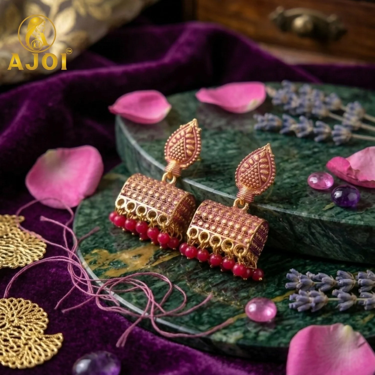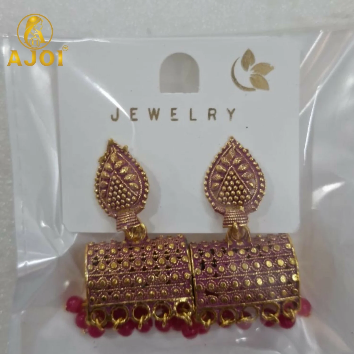 Be the first to review Antique Gold-Plated Leaf Design Jhumka Earrings with Pink Bead Drops!