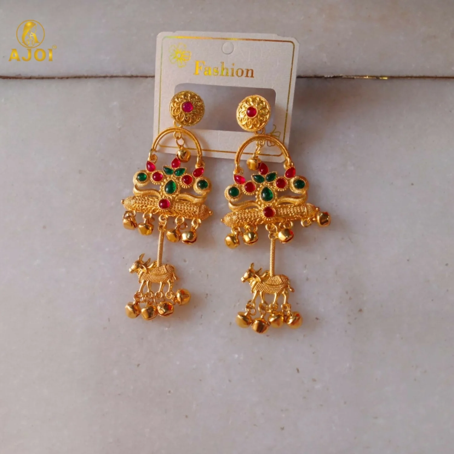 Be the first to review Antique Gold-Plated Red & Green Stone Tribal Drop Earrings with Cow Earrings!
