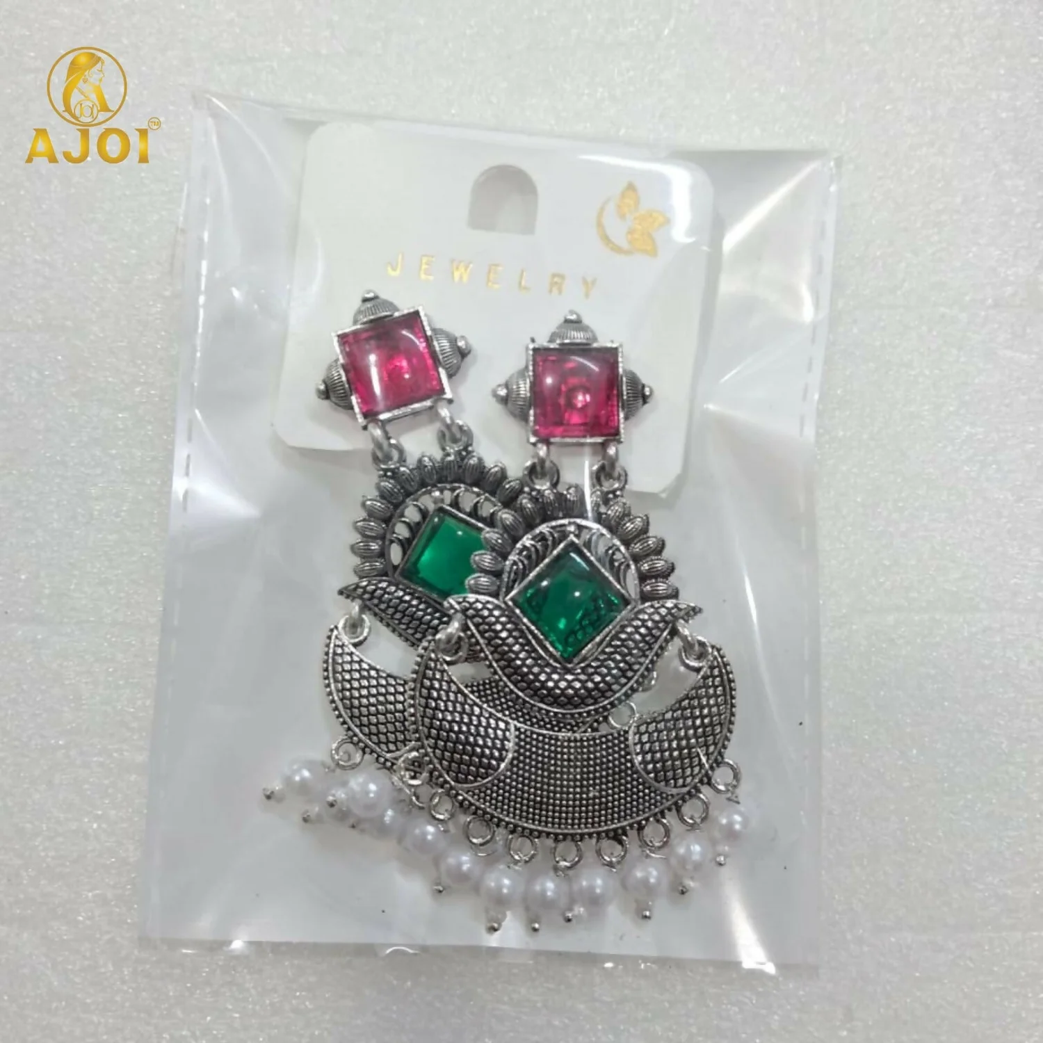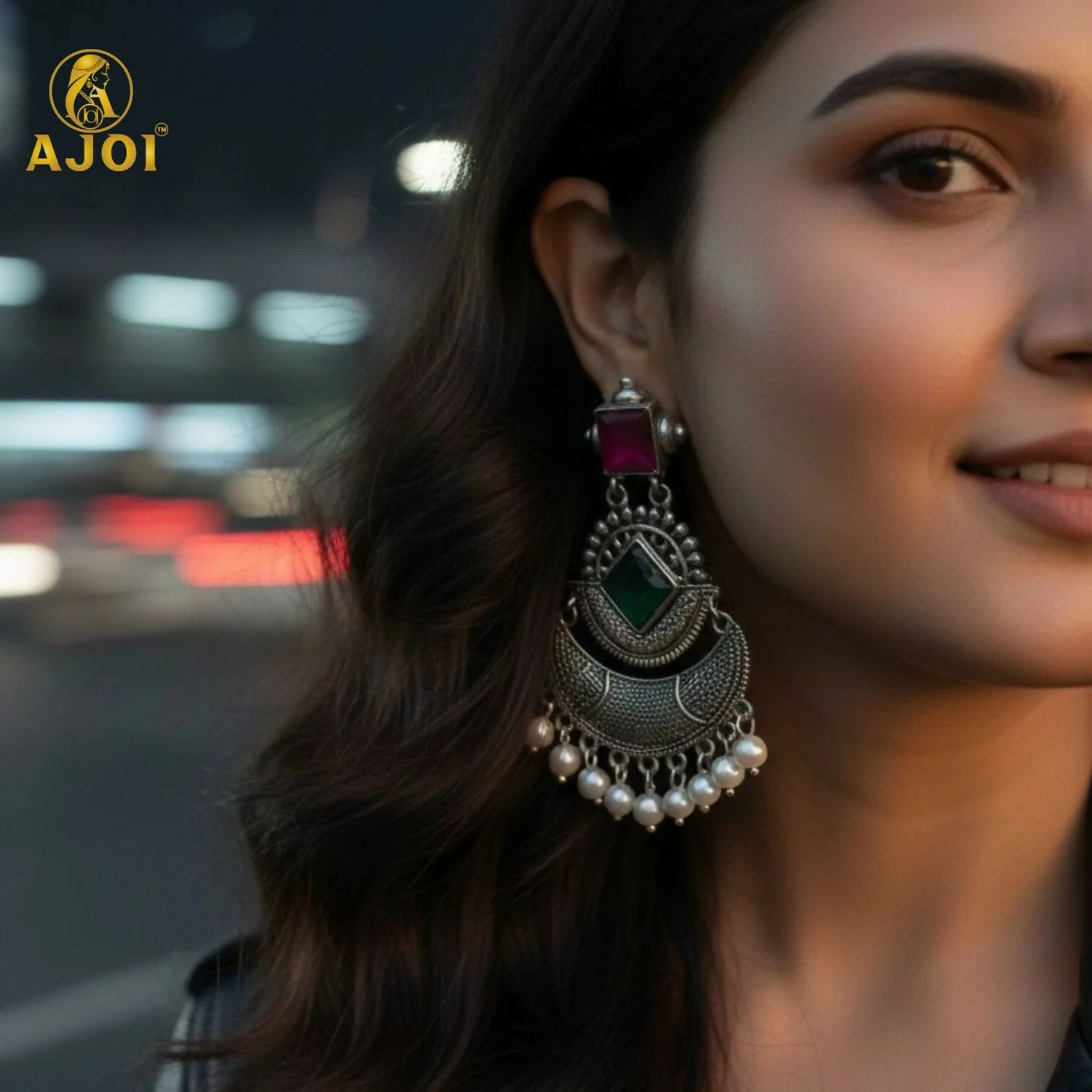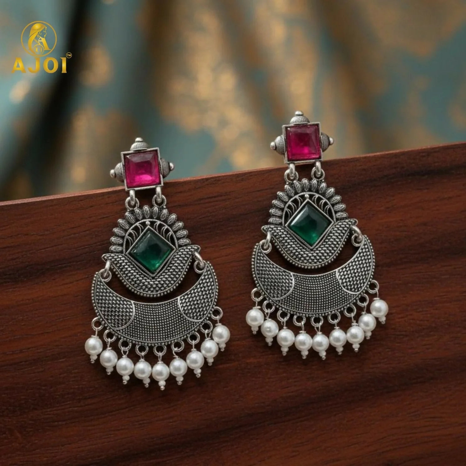 Elevate your traditional look with these exquisitely crafted antique silver-finish chandbali earrings, inspired by timeless Indian heritage design. The earrings feature a striking square ruby-tone stone at the top, gracefully leading to a deep green gemstone centerpiece that adds royal charm and richness.