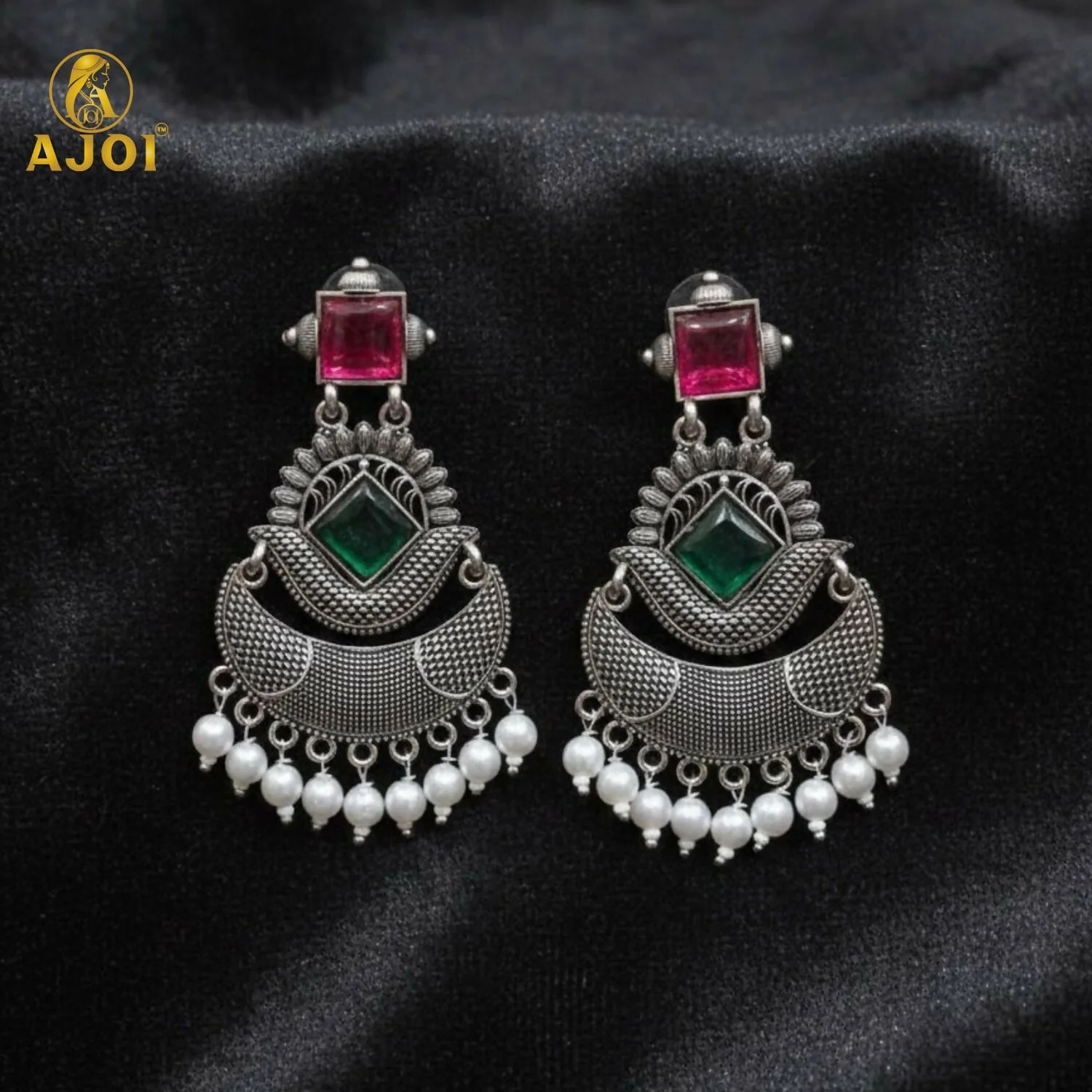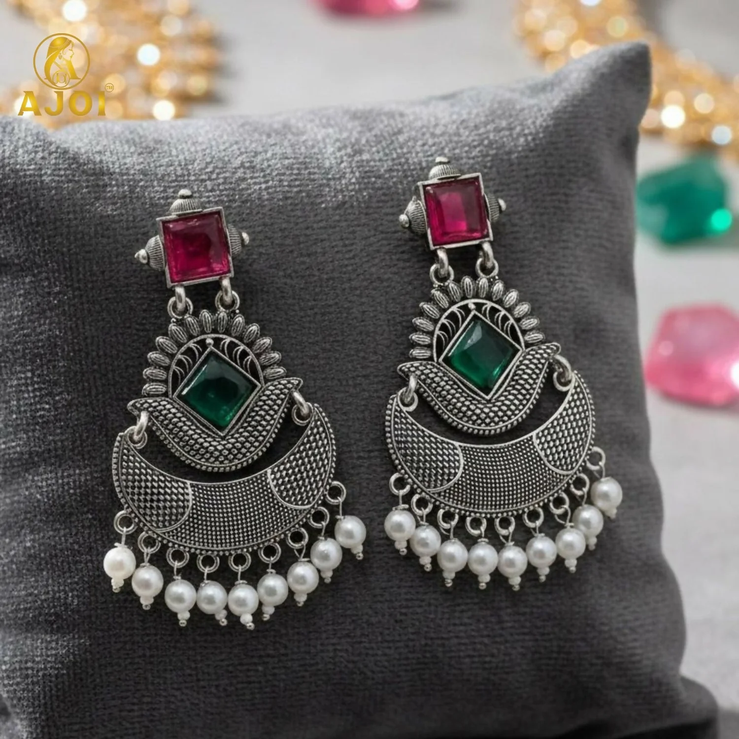 Be the first to review Antique Silver-Finish Chandbali Earrings with Green & Ruby-Tone Stones and Pearl Drops!
