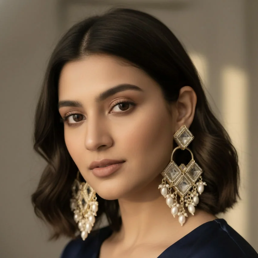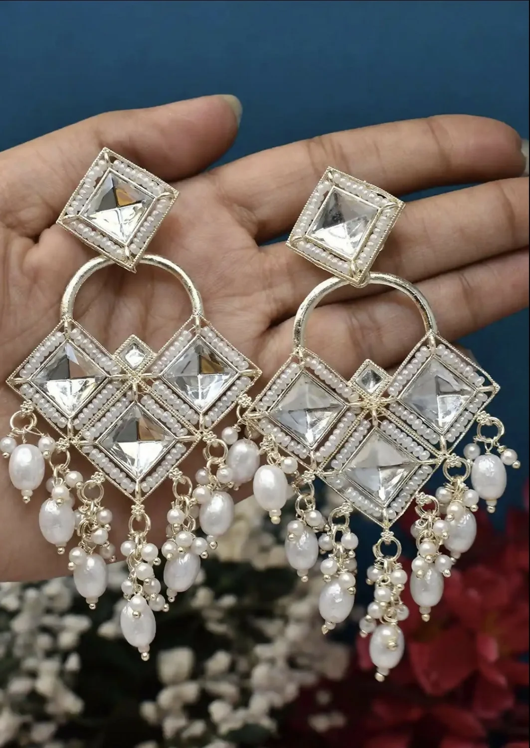Be the first to review Antique Silver-Toned Floral Kundan Chandbali Jhumka Earrings with Seed Pearl Clusters!