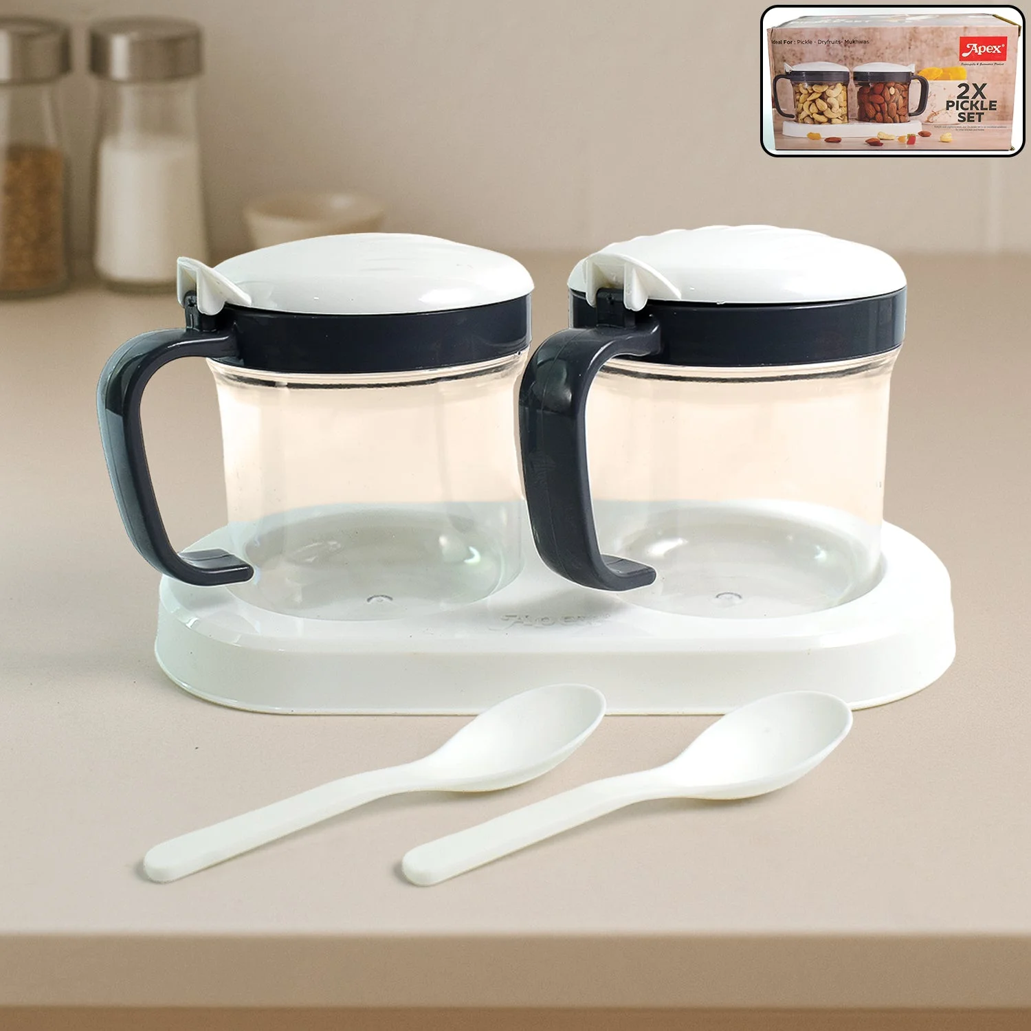 Apex 2-Container Pickle and Dry Fruit Set with Tray and Spoon – Unbreakable Polycarbonate Jars with Airtight Lids, Ergonomic Handles & Storage Base – Ideal for Pickles, Dry Fruits, Mukhwas & Spices