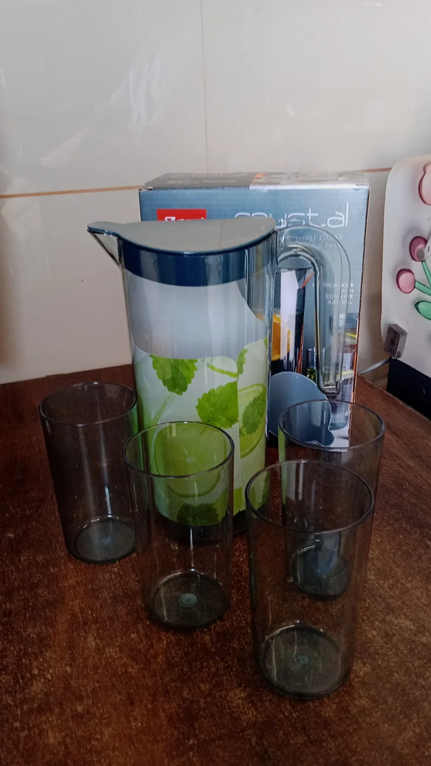 Crystal Premium Jug – 1500ml & 4 Pcs Glass (1500 ML / 300 ML Approx) Food-Grade, BPA-Free, Unbreakable Plastic Jug with Lid and Easy-Pour Design (5 Pcs Set)