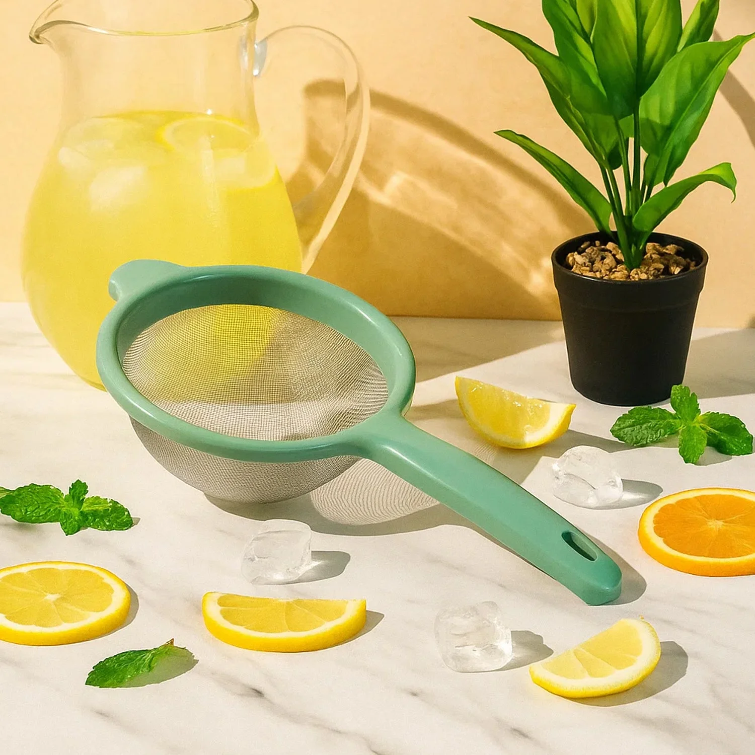 Make everyday prep faster and cleaner with this Apex large, fine-mesh kitchen strainer. The tightly woven stainless-steel basket catches pulp, seeds, tea leaves and small impurities while allowing liquids to pass quickly for clear, smooth results. A broad rim with an easy-grip handle and resting ear lets the strainer sit securely on bowls, mugs or pans so you can pour with both hands. Lightweight yet sturdy, it rinses clean in seconds and hangs neatly after use—perfect for tea, coffee decoctions, citrus juice, rasam/soups, kheer, sauces and dusting flour or sugar.