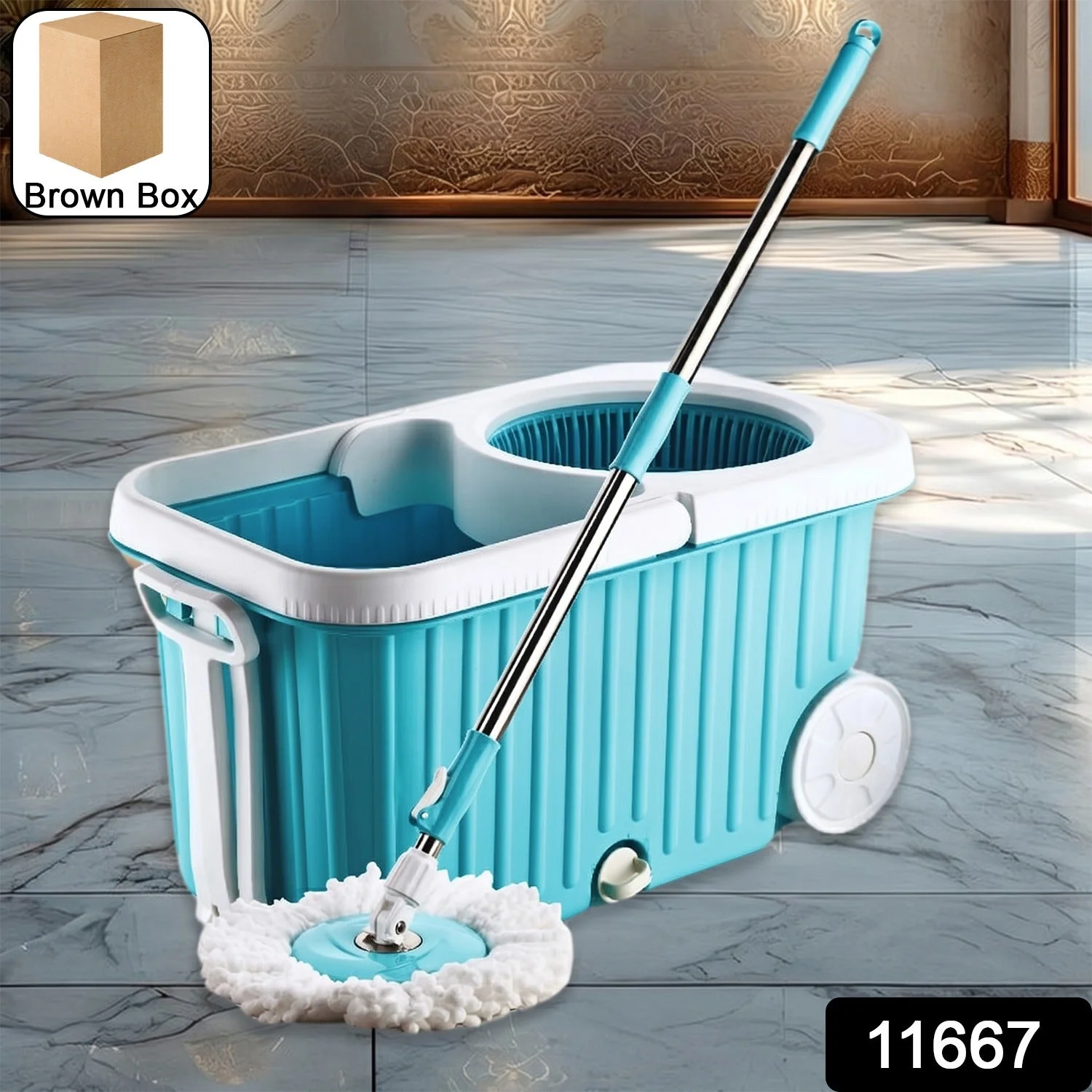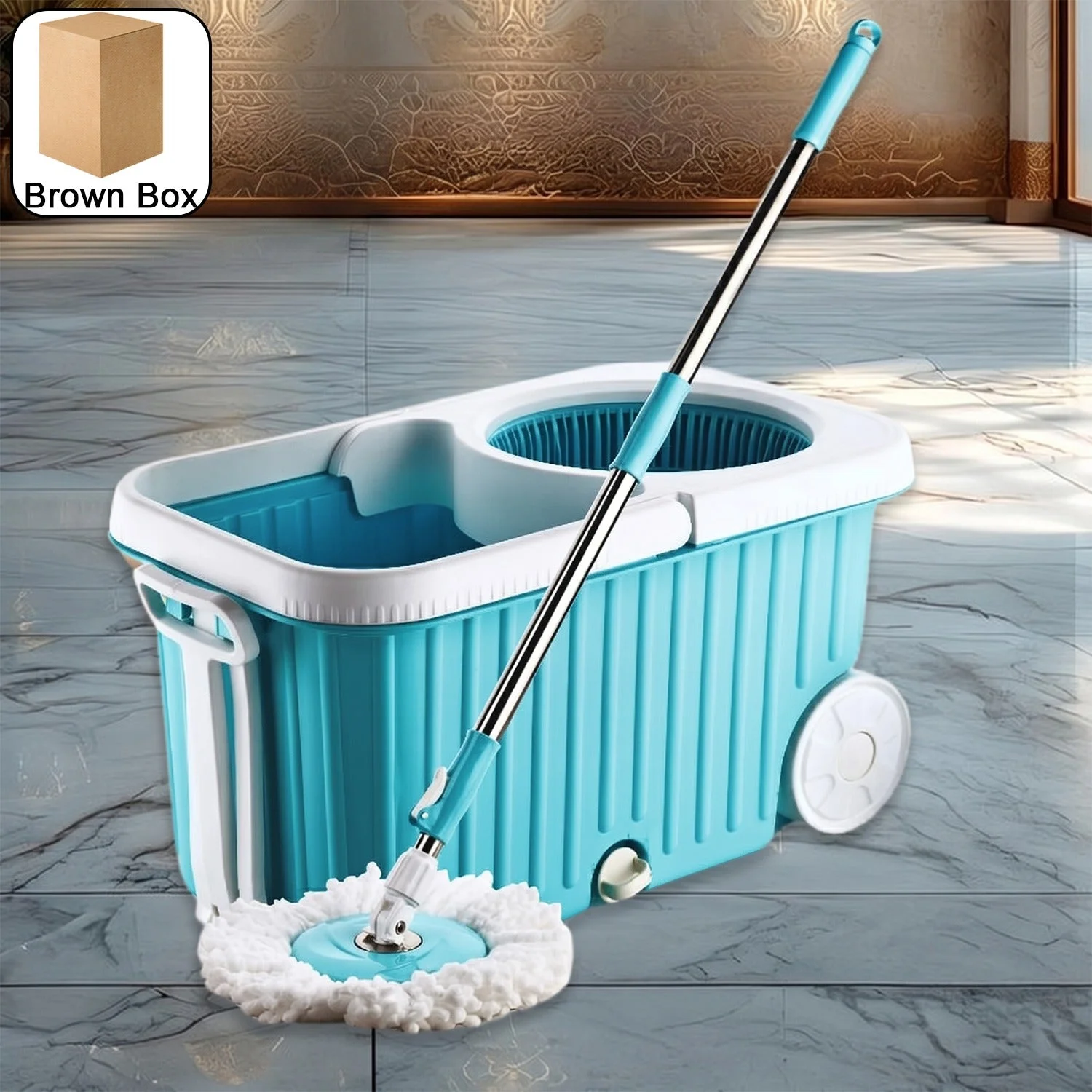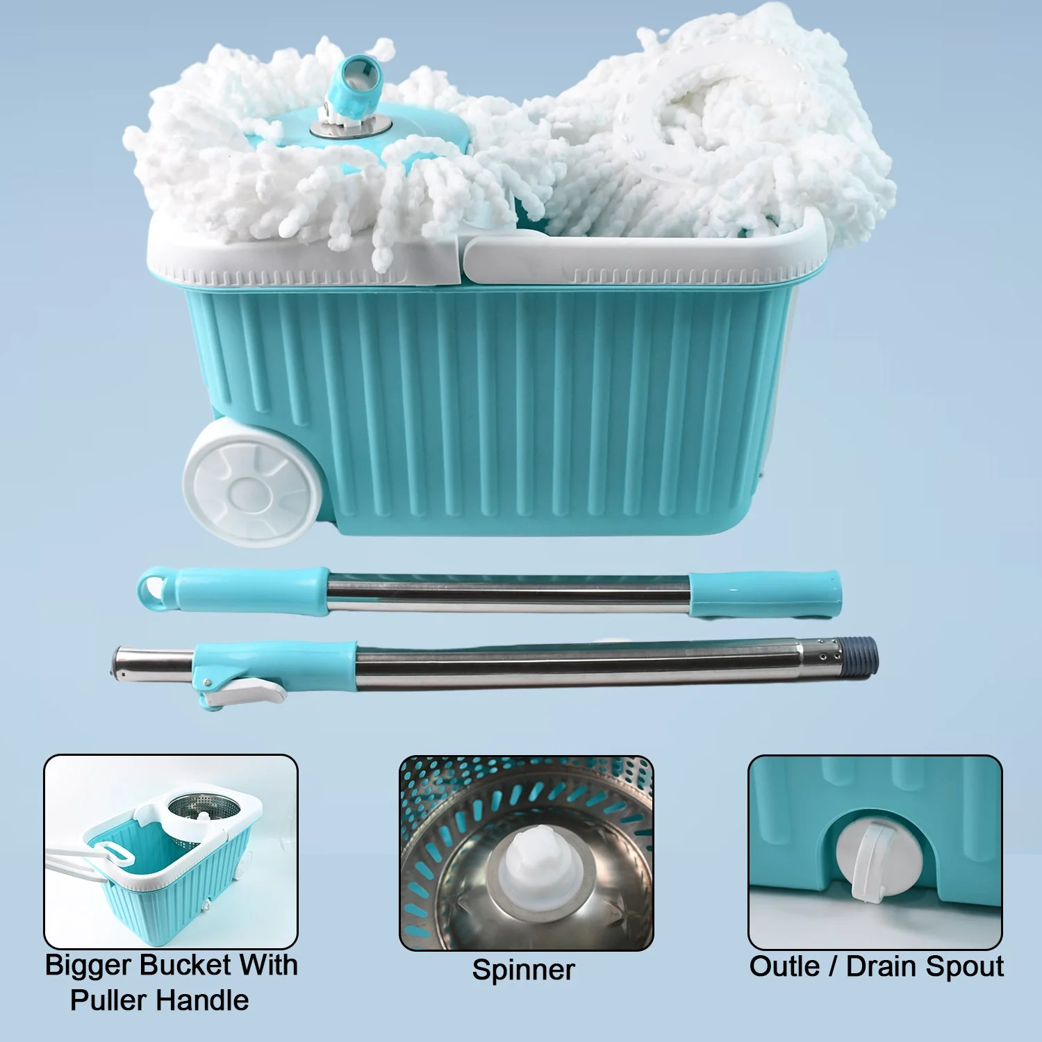 The bucket is built with large capacity compartments, smooth-rolling wheels, a steel wringer, and a convenient water outlet drain spout for quick disposal of dirty water. Whether you're cleaning tiles, marble, wooden floors, or laminate surfaces, this system is engineered to give your floors a sparkling clean finish in minutes.