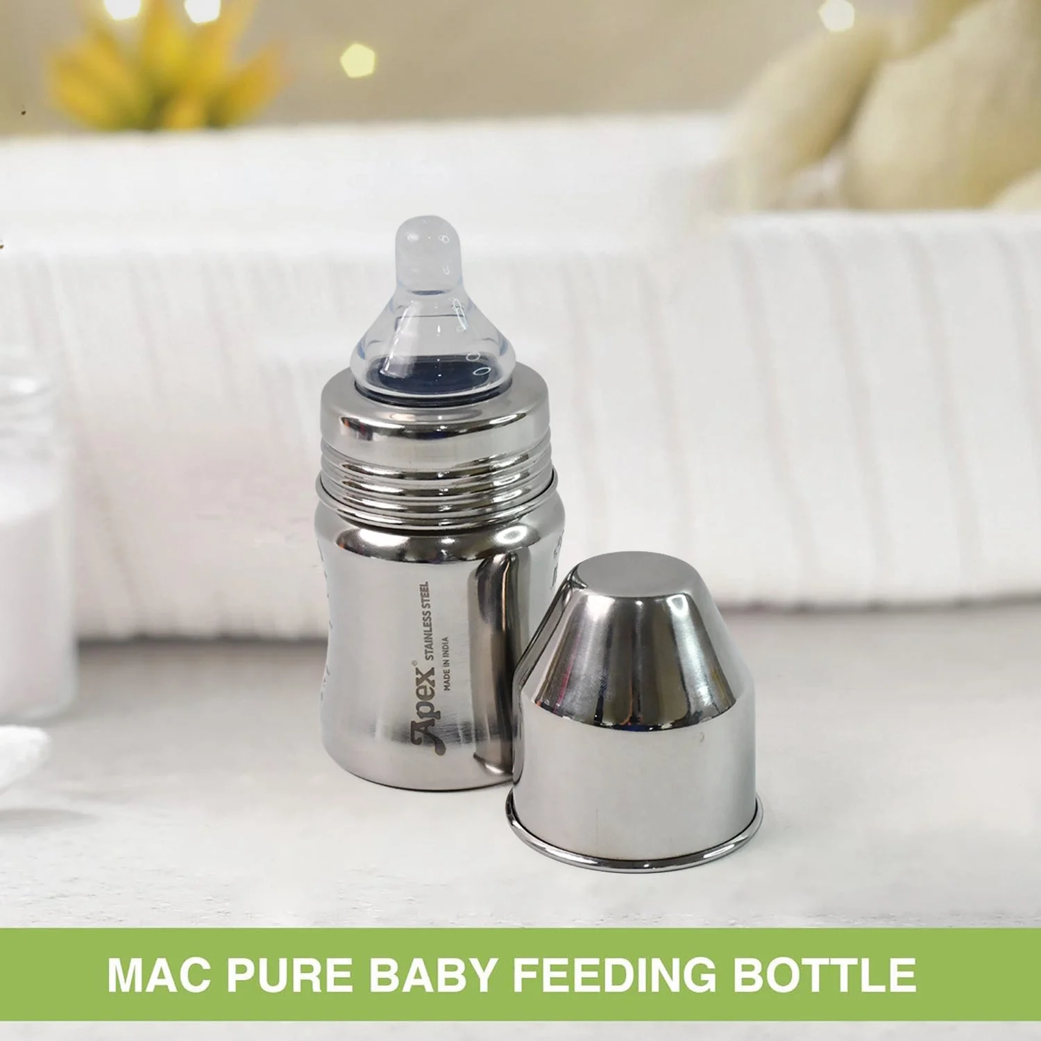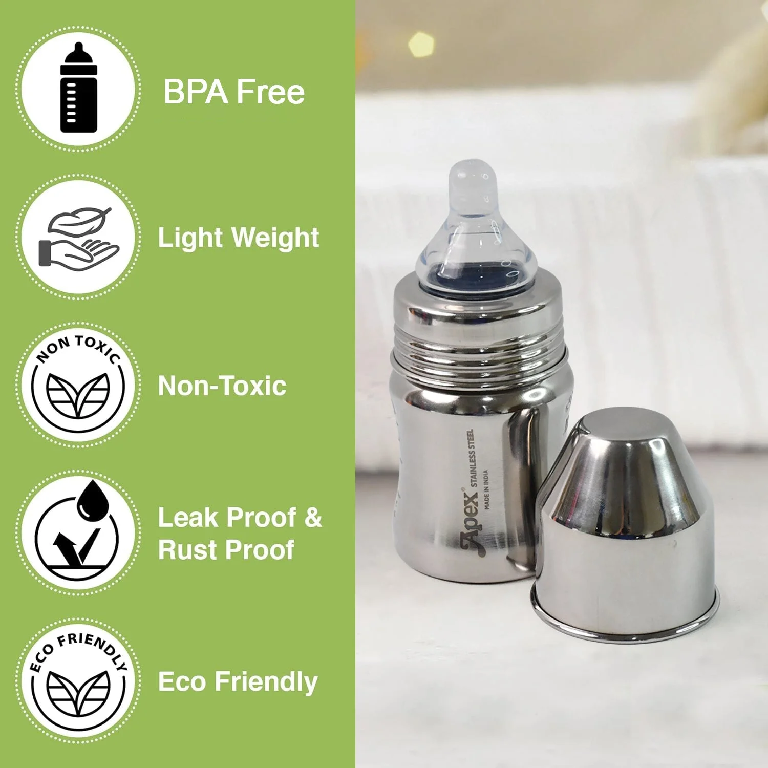 Apex Premium Stainless Steel Baby Feeding Bottle 125 ML with BPA-Free Nipple and Leak-Proof Cap | Safe, Durable, and Easy-to-Clean Feeding Bottle for Infants and Newborns