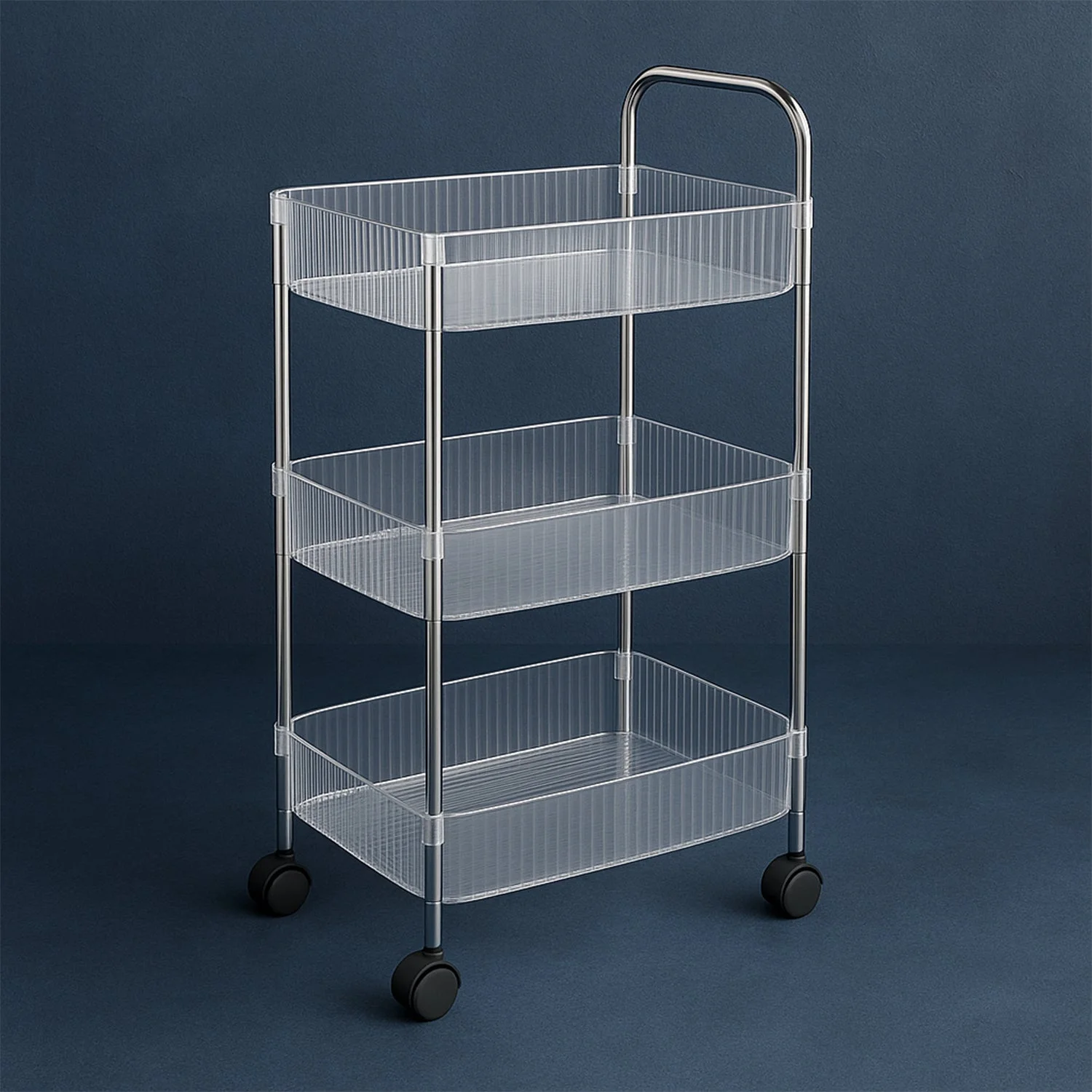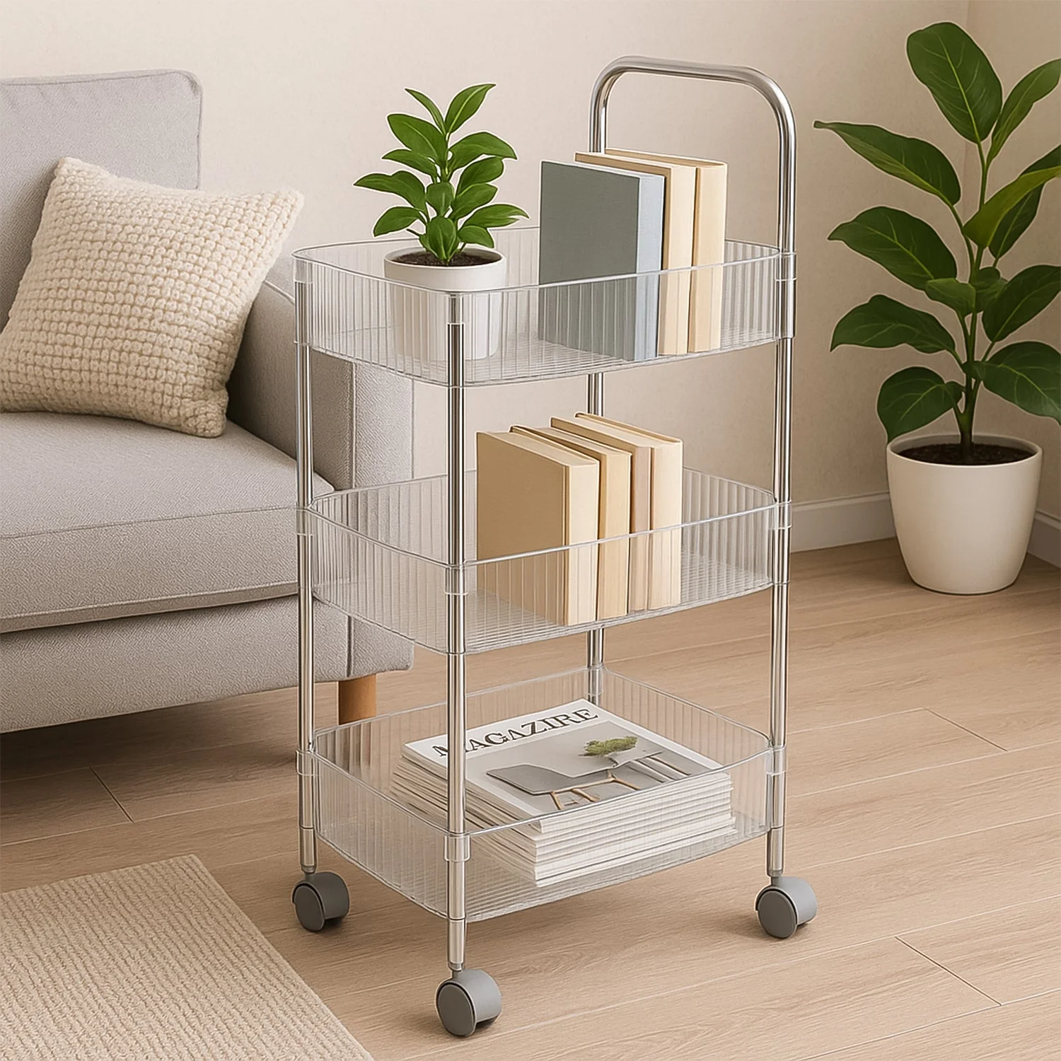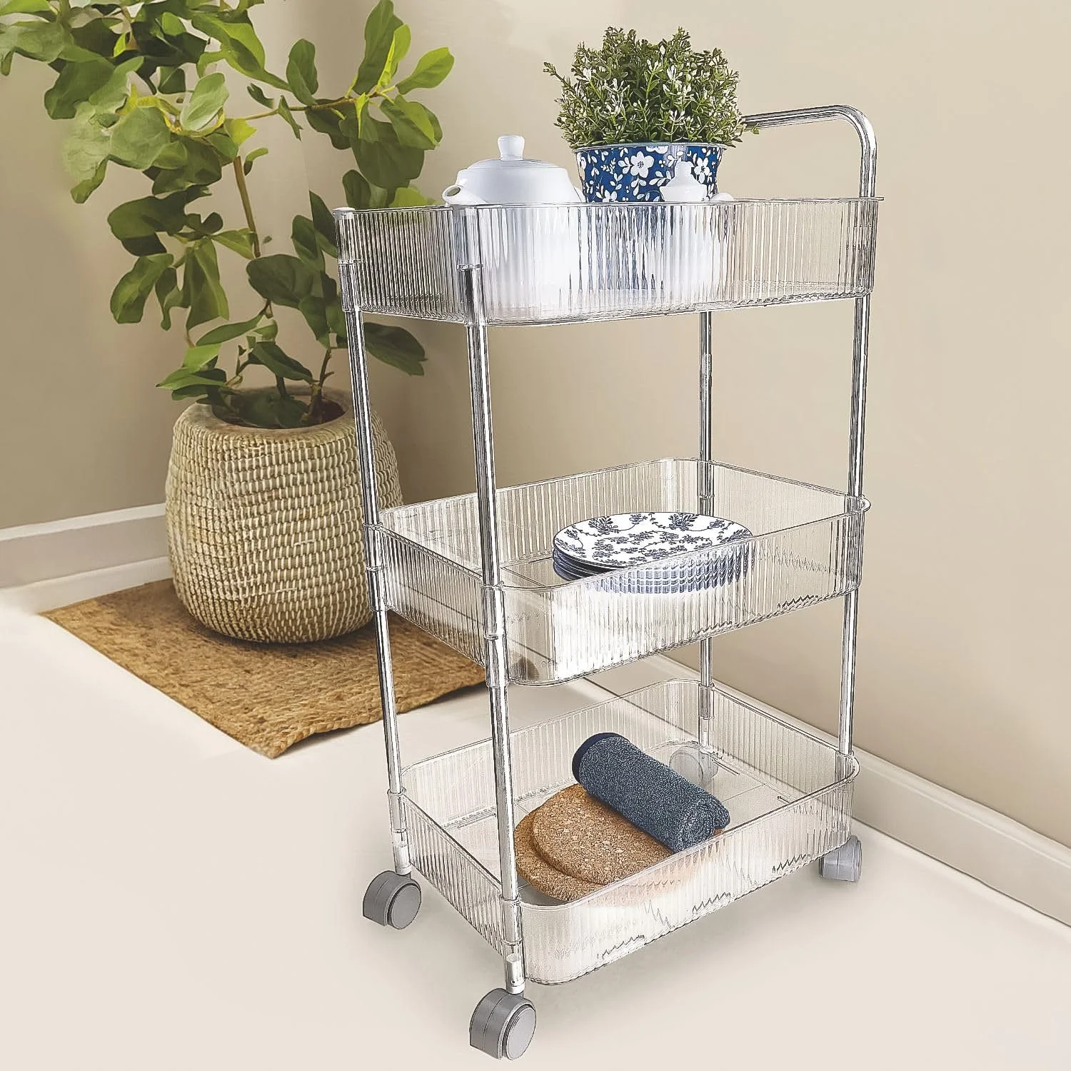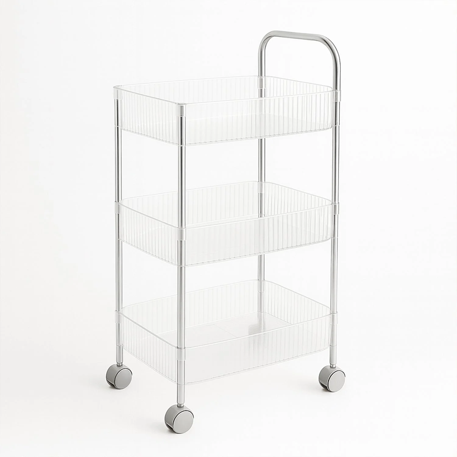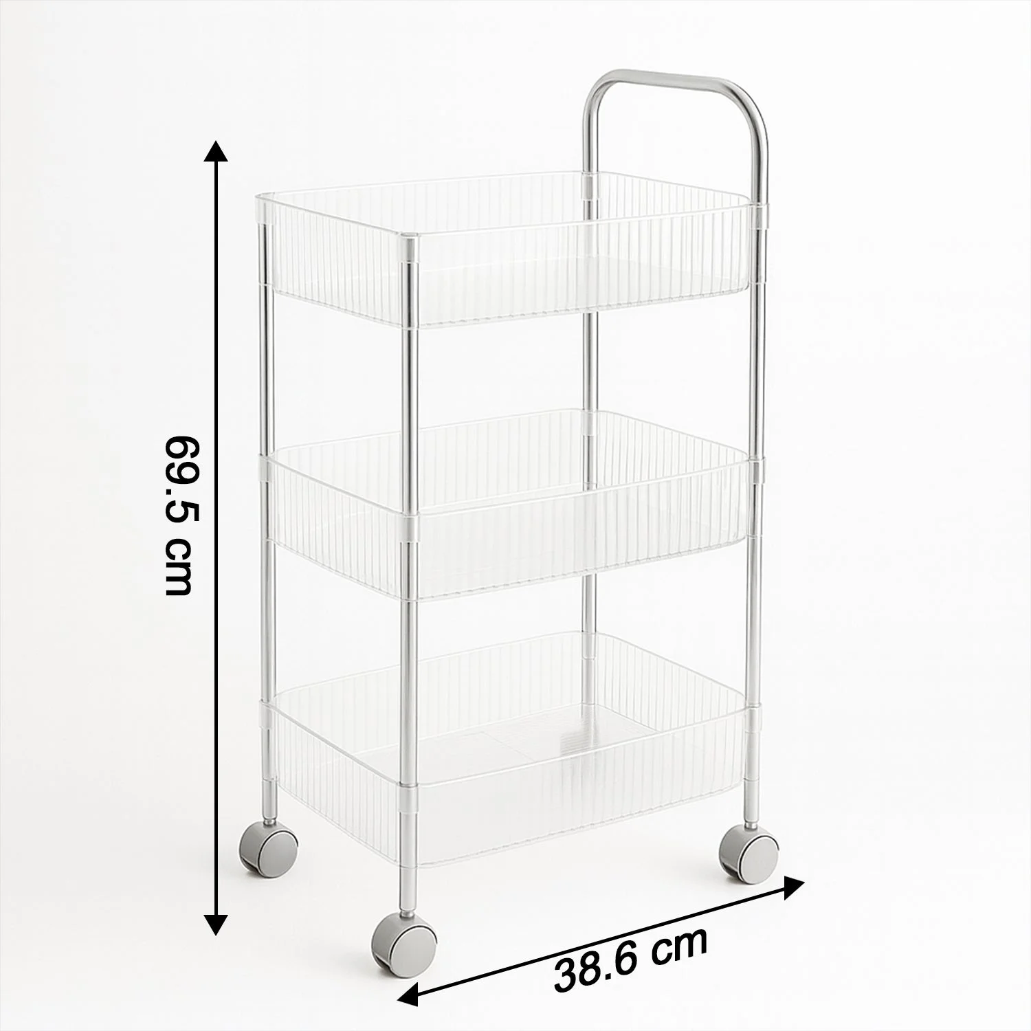Its smooth-rolling wheels allow effortless mobility, making it easy to move around the kitchen, bathroom, or office space. The tall handle design ensures comfortable handling and adds convenience. With a modern transparent basket look, this trolley blends seamlessly with any home décor while offering practical storage capacity.