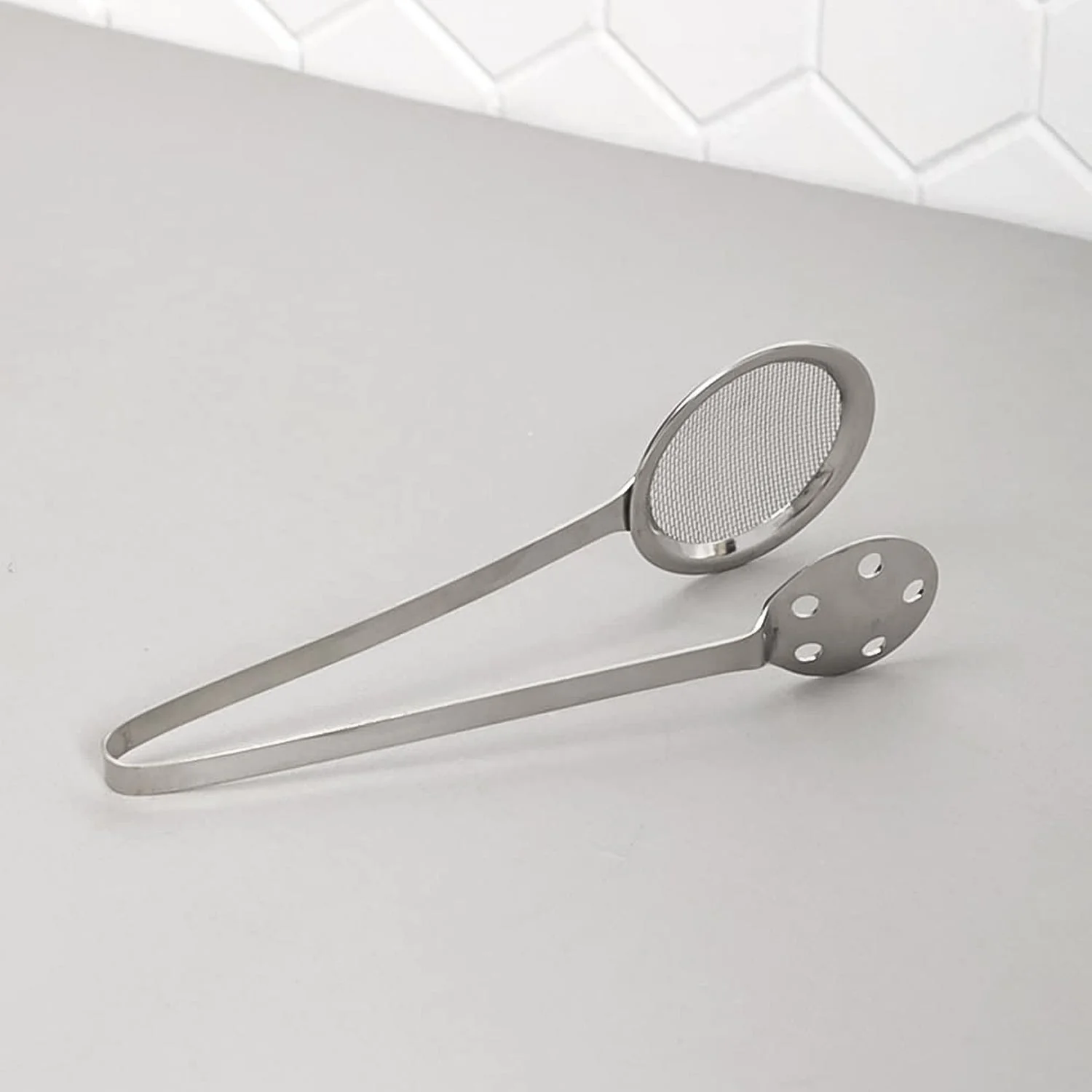 2-in-1 Design: Skimmer mesh on one side and tong plate with drain holes on the other.