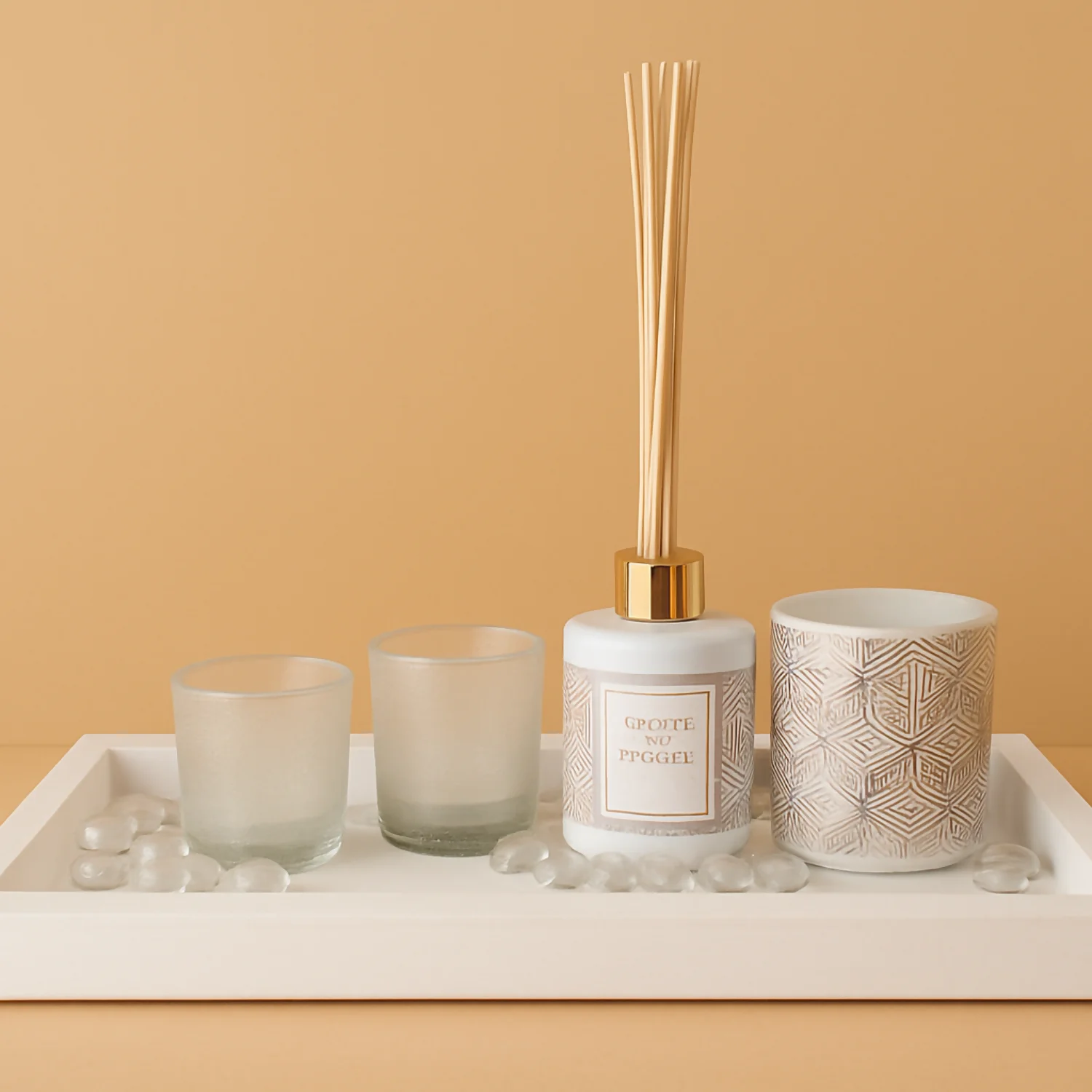 Complete 7-Piece Set: Includes 1 reed diffuser bottle, 5 natural sticks, 1 scented candle, 2 frosted tealight holders, and decorative glass beads.