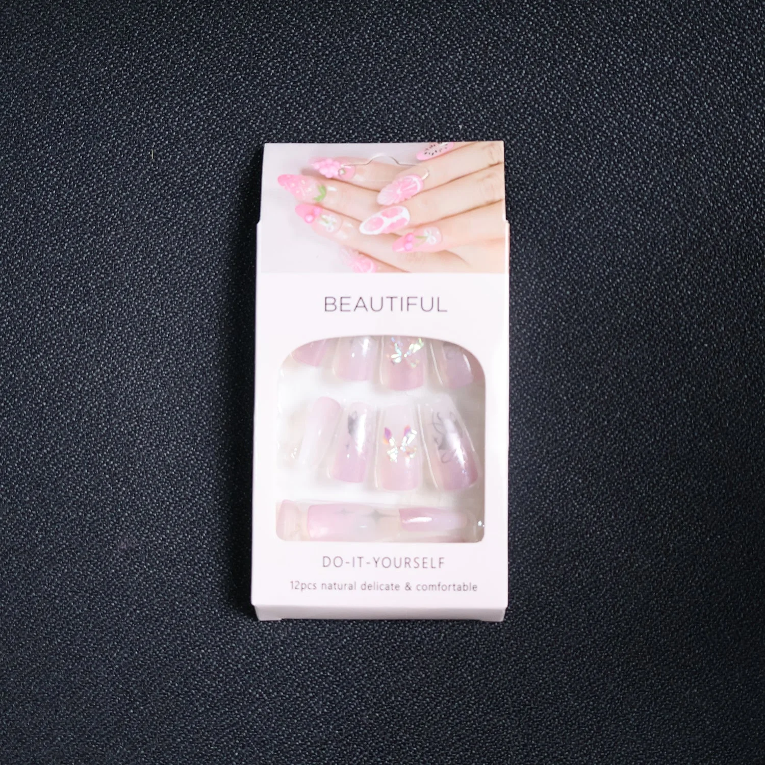 Get salon-style nails at home with this premium artificial false nail set featuring elegant mix designs in glossy finish with 3D embellishments. Designed in a long coffin shape, these press-on nails are easy to apply and remove, giving your hands an instant stylish upgrade without the time and cost of a salon visit. Made with high-quality material, they are lightweight, durable, and comfortable to wear. Perfect for parties, weddings, festive occasions, or daily wear, this nail set provides a professional manicure look in minutes.
