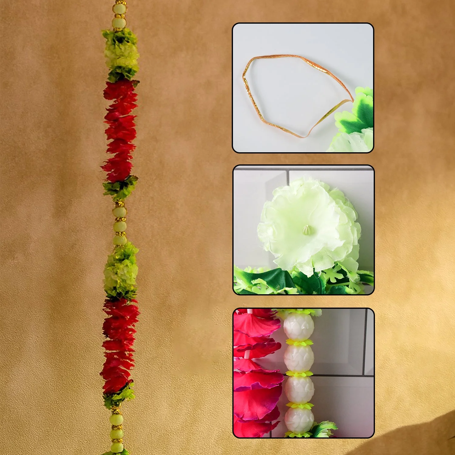 This beautifully crafted artificial flower garland toran is designed to bring positivity, color, and festive charm to your space. Adorned with vibrant artificial flowers in red, green, and white hues, it creates a welcoming and auspicious look at the entrance of your home, office, or temple. Traditionally used during festivals, weddings, and housewarming ceremonies, torans are a symbol of good fortune and prosperity. Lightweight, durable, and reusable, this decorative garland is perfect for daily use as well as special occasions, instantly enhancing the beauty of any doorway or wall.