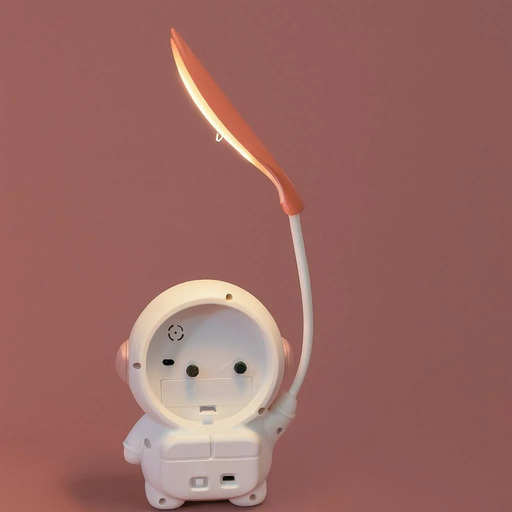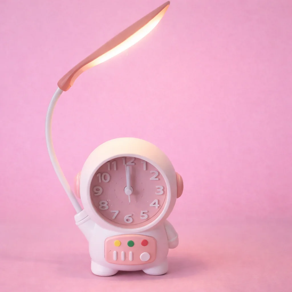 Make learning and bedtime more exciting with this cute astronaut desk lamp combined with an alarm clock. Designed especially for kids, this multifunctional piece works as a study light and a time-keeping companion. The flexible lamp head provides focused lighting for reading, homework, or bedtime use, while the easy-to-read clock dial helps children learn time management in a fun way. Perfect for kids’ rooms, study tables, and gifting.