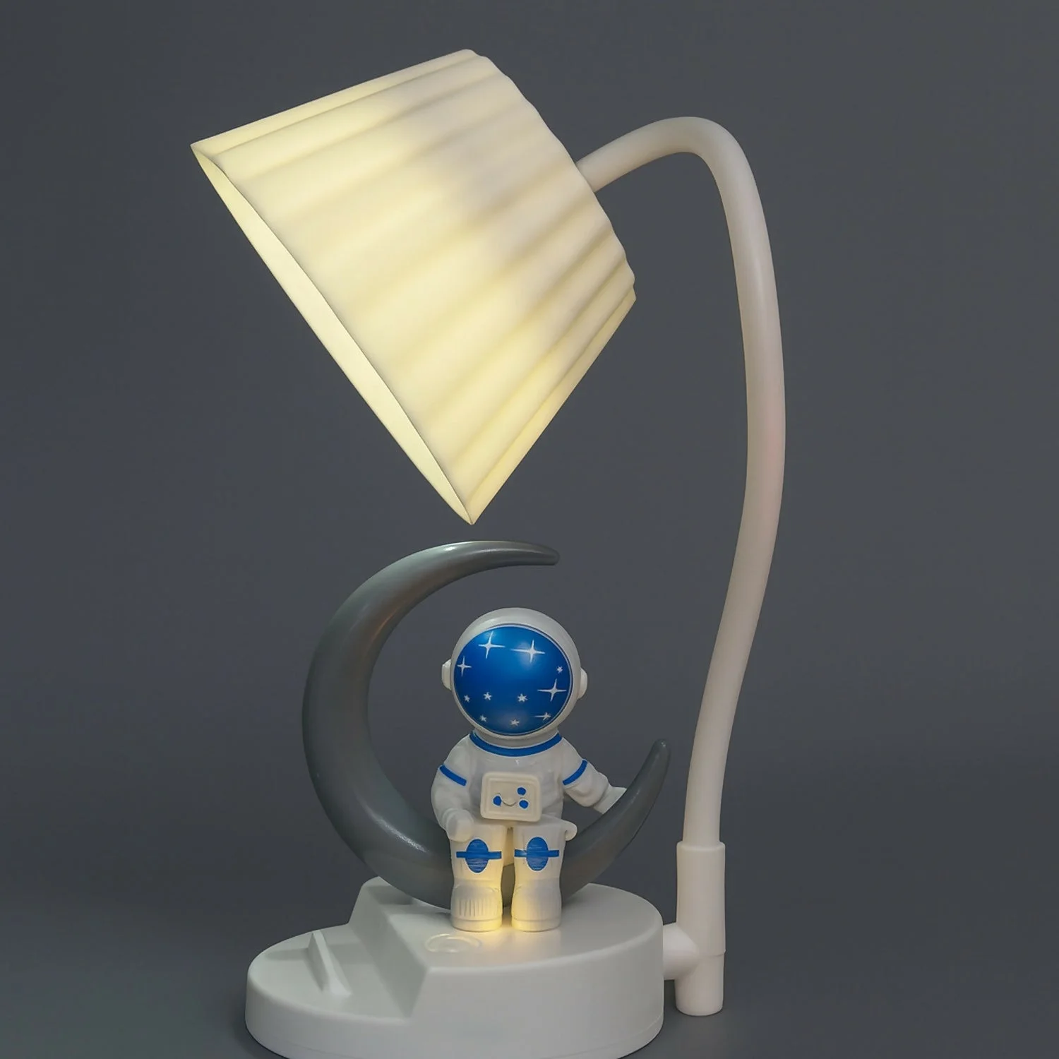 Bring a dreamy space vibe to your room with this adorable astronaut moon LED table lamp. Designed with a cute astronaut sitting on a crescent moon and a soft fabric-style lampshade, it emits a warm, soothing glow perfect for bedrooms, kids’ rooms, study tables, and bedside use. The adjustable neck allows you to direct light as needed, while the gentle LED illumination is easy on the eyes. Compact, decorative, and functional, this lamp is ideal for daily use and makes a perfect gift for kids, space lovers, and special occasions.