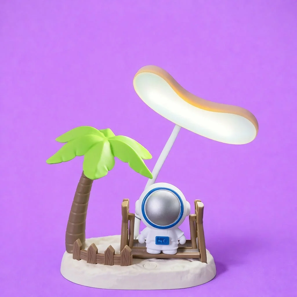 Bring creativity and fun to your desk with this unique astronaut swing desk lamp. Designed with a cute astronaut sitting on a swing beside a mini palm tree, this lamp adds a playful touch to any space. It features three functional modes – swing mode, light mode, and combined swing with light mode – offering both entertainment and practical lighting. The soft LED light is perfect for reading, studying, or as a night lamp, while the charming moving design makes it an eye-catching décor piece for kids’ rooms, study tables, or gifting.