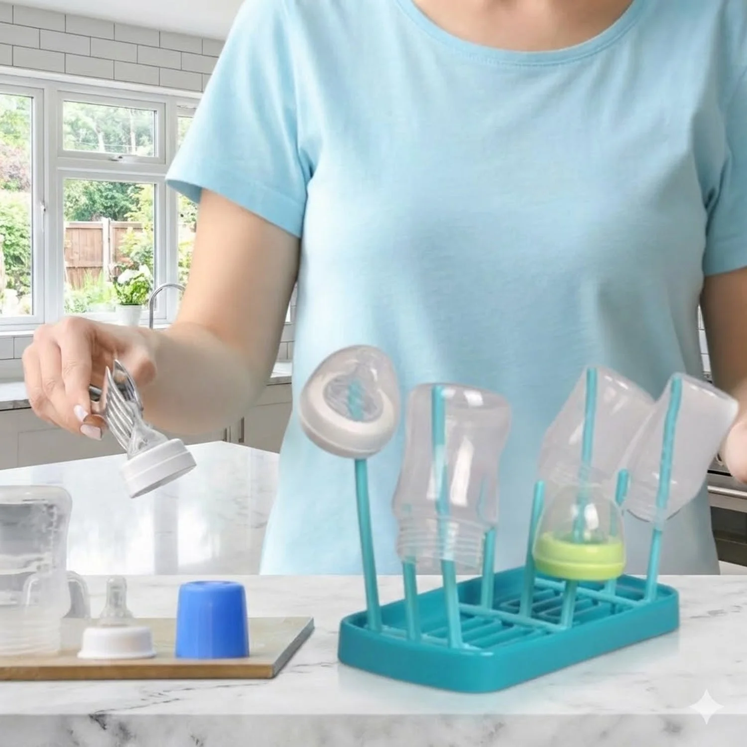 This baby feeding bottle drying rack is a hygienic and space-efficient solution for drying bottles, nipples, caps, and feeding accessories after washing. Designed with multiple vertical holders, it allows proper air circulation for faster drying while keeping items upright and organized. The removable base tray collects excess water, helping keep kitchen countertops clean and dry. Easy to assemble, disassemble, and clean, this drying rack is ideal for daily baby care routines and supports safe, organized storage of feeding essentials.