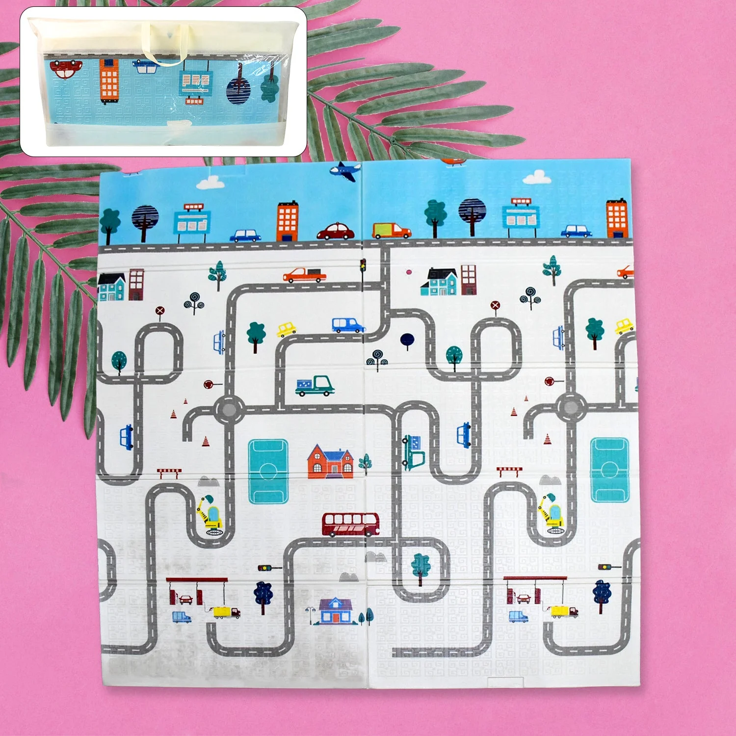 - Baby playmat has double sides patterns with colorful animals and train tracks. Foam puzzle play mat for toddler encourages children’s play in a creative way with room for friends to join in, baby play mats provide an area to racing and play. Floor foam playmat with a carrying case does not take up space, great for storing. Floor kid play-mat can easily be folded up and lightweight for travel or any outdoor activities. Perfect carpet for beach, picnic, lake or camping.