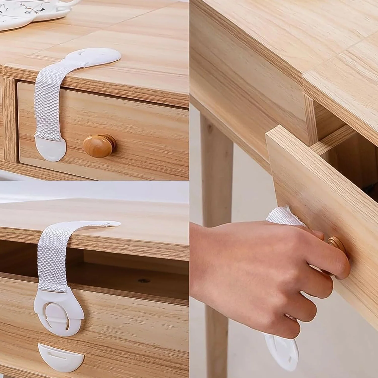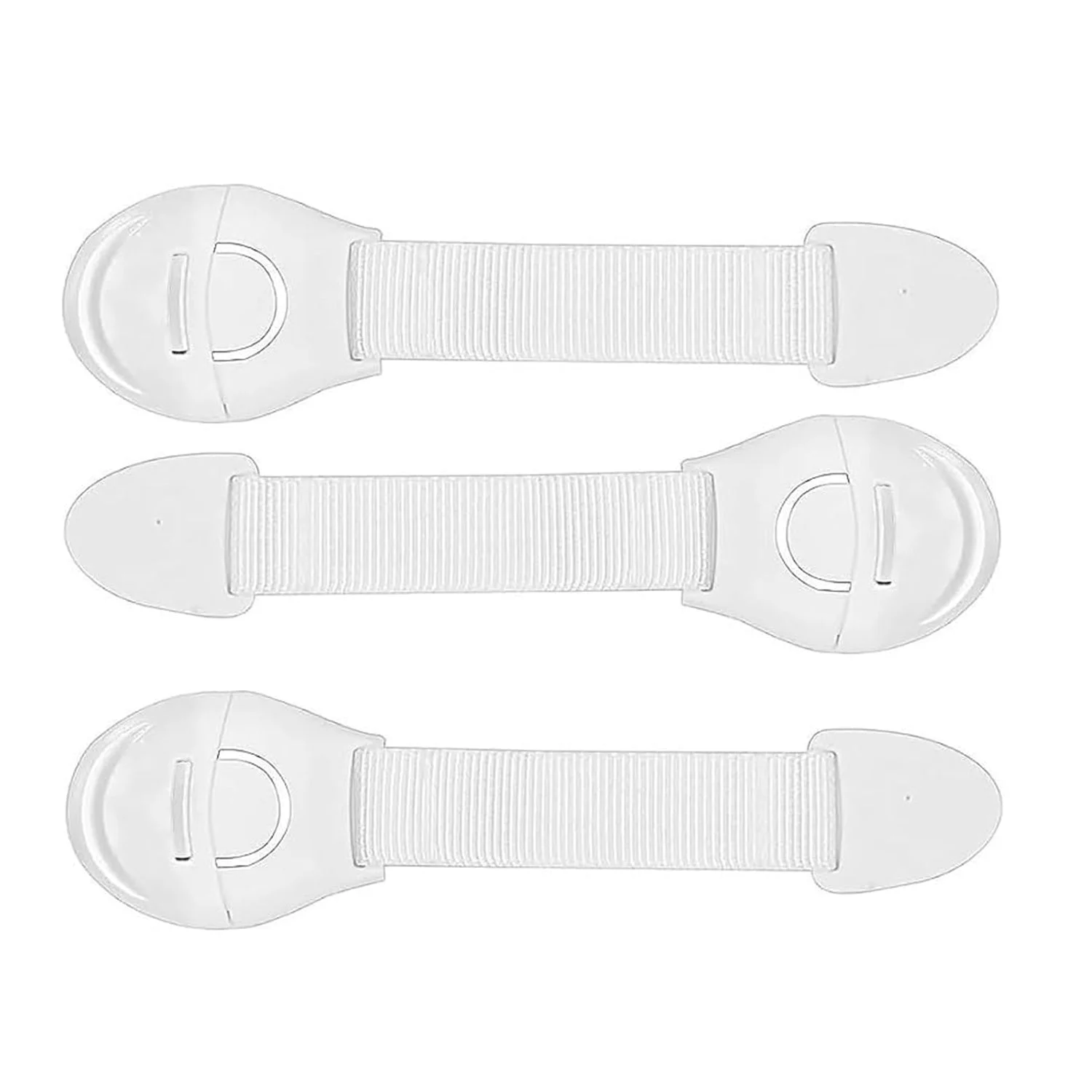 - Child safety strap locks are made of high-quality ABS plastic, and the strap can bear high tension force. Adhesive will hold toughly and does no damage to any furniture surface. Easy to remove later.