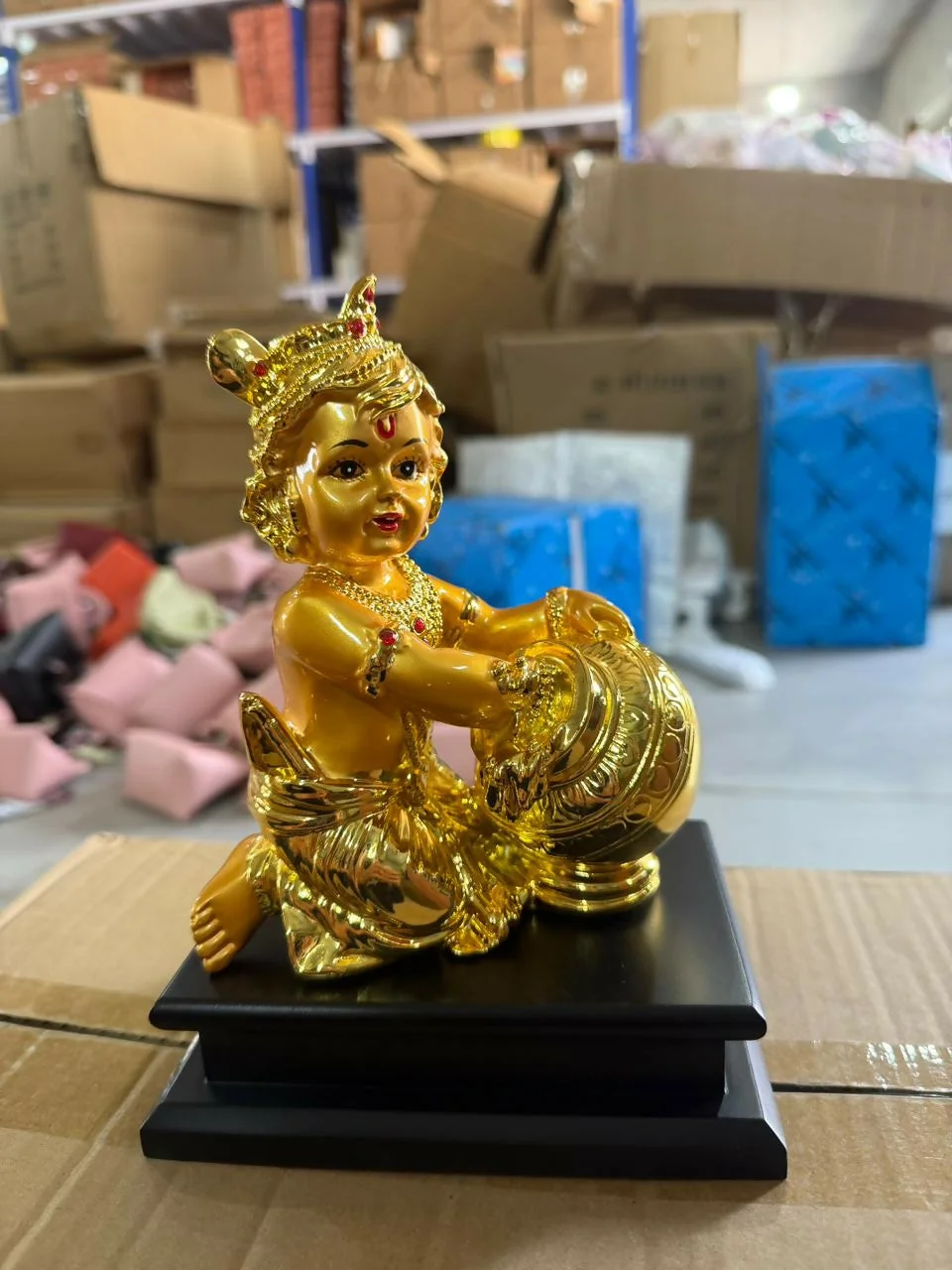 Add divine charm and spiritual positivity to your home with this beautifully crafted Bal Krishna idol holding a butter pot. The statue symbolizes innocence, happiness, and prosperity. Designed with intricate detailing and a radiant golden finish, this decorative piece enhances the beauty of home temples, living rooms, offices, and pooja spaces. Mounted on a sturdy base, it ensures stability while adding an elegant devotional touch. Ideal for daily worship, festive decoration, and gifting during occasions like Janmashtami, Diwali, housewarming ceremonies, and religious celebrations.