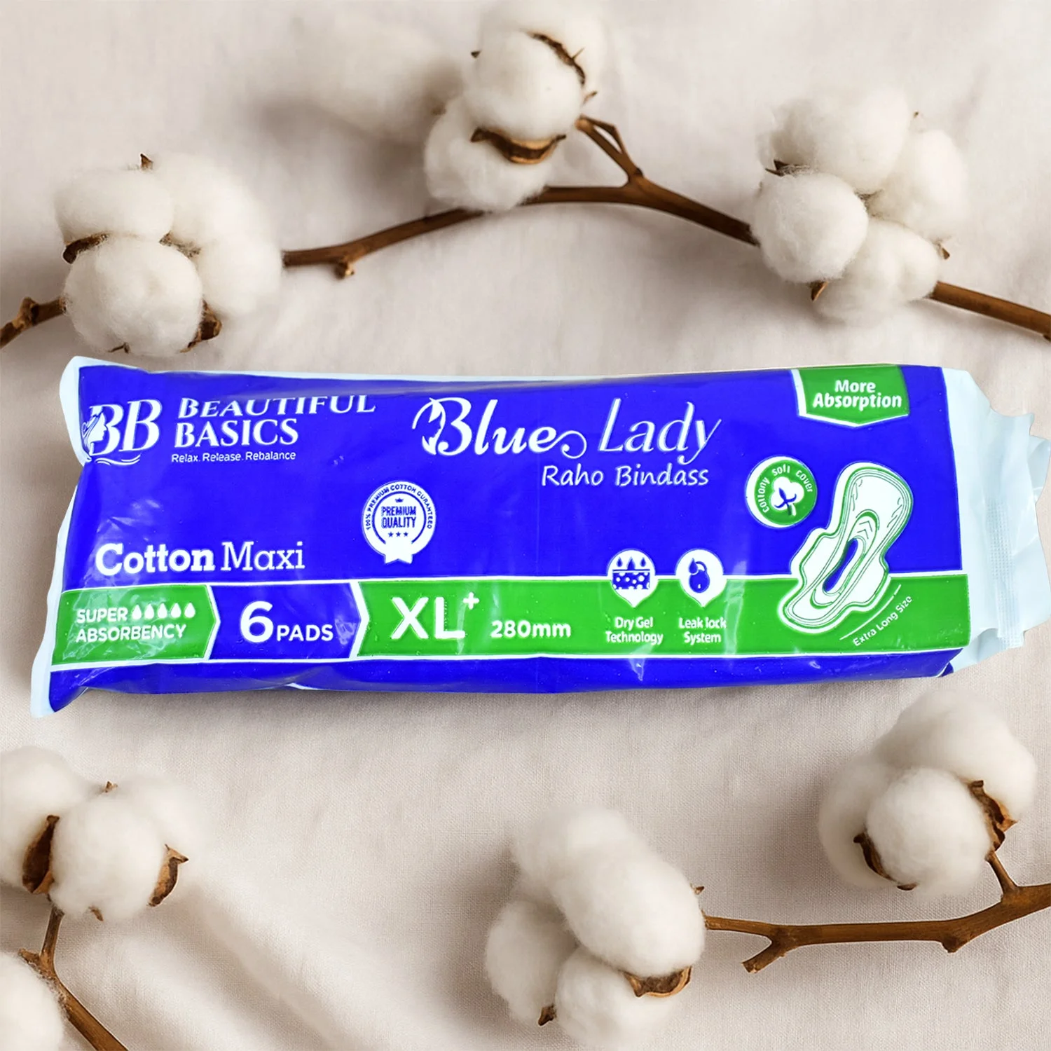 Beautiful Basics Blue Lady Sanitary Pads XL 280mm – Pack of 6 Cotton Maxi Pads with Super Absorbency, Leak Lock System, and Dry Gel Technology for Women