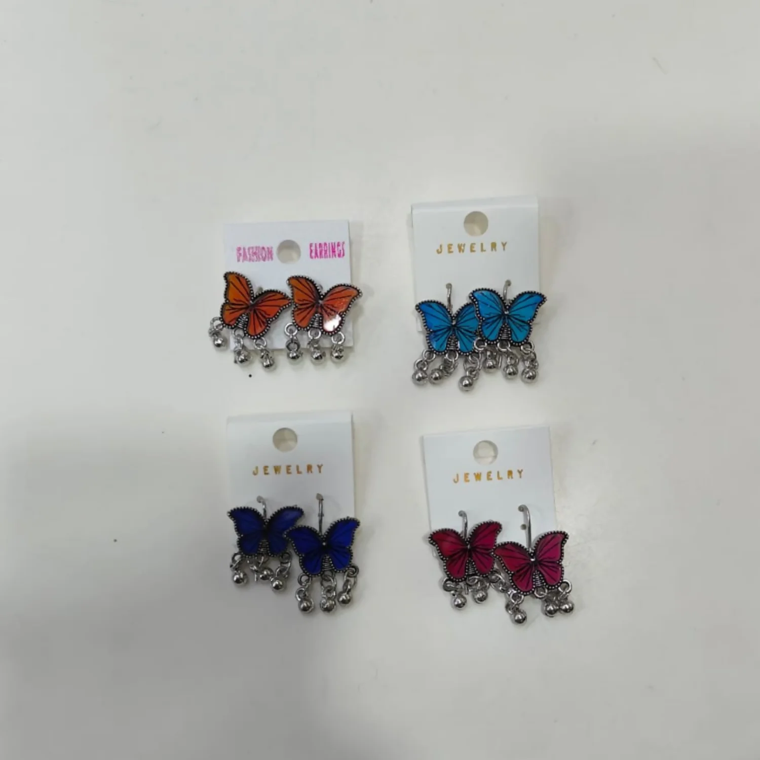 These beautiful butterfly earrings feature a delicate silver-tone outline with vibrant enamel wings in eye-catching colors. The set includes shades of royal blue, orange, sky blue, and bright pink, each designed with fine detailing that highlights the butterfly’s elegant shape. Hanging below each butterfly are small silver chains adorned with tiny metallic beads, adding graceful movement and a charming jingle effect. Lightweight and stylish, these earrings are perfect for adding a playful yet trendy touch to casual and festive outfits.
