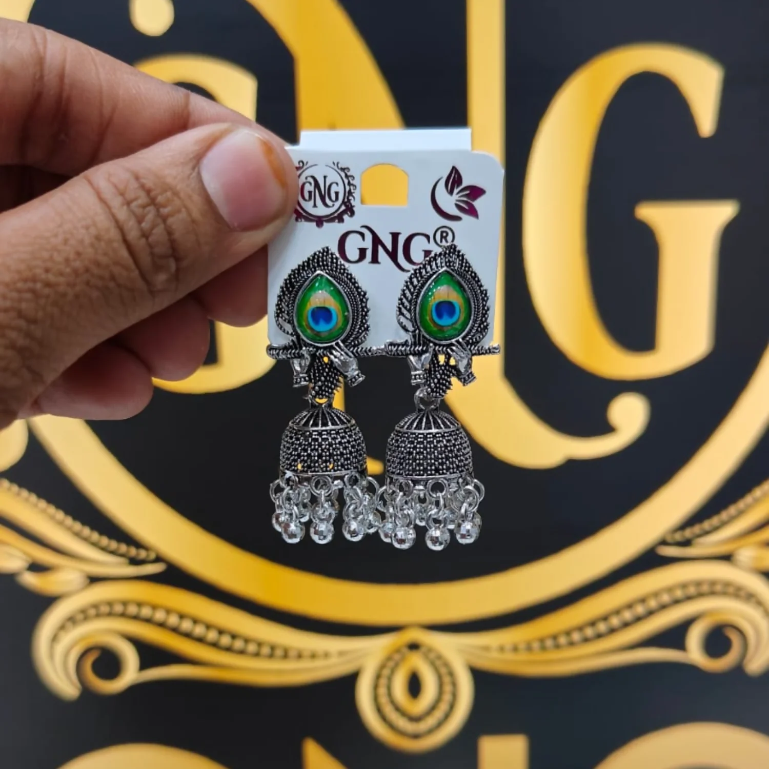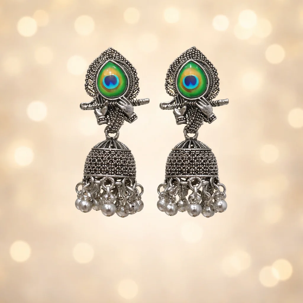These stunning oxidized silver jhumka earrings feature a beautifully crafted peacock-inspired motif at the top, highlighted with vibrant green and blue enamel detailing. The intricate antique finish and textured metalwork give them a rich traditional look. The dome-shaped jhumka is adorned with delicate pearl-like bead danglers that add graceful movement and charm. Perfect for festive occasions, weddings, and ethnic outfits, these earrings offer a timeless blend of elegance and cultural beauty.