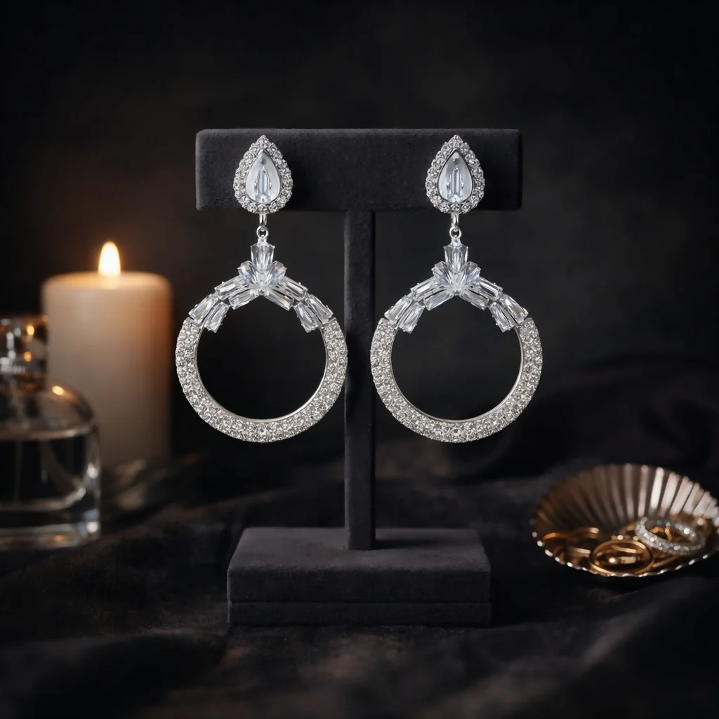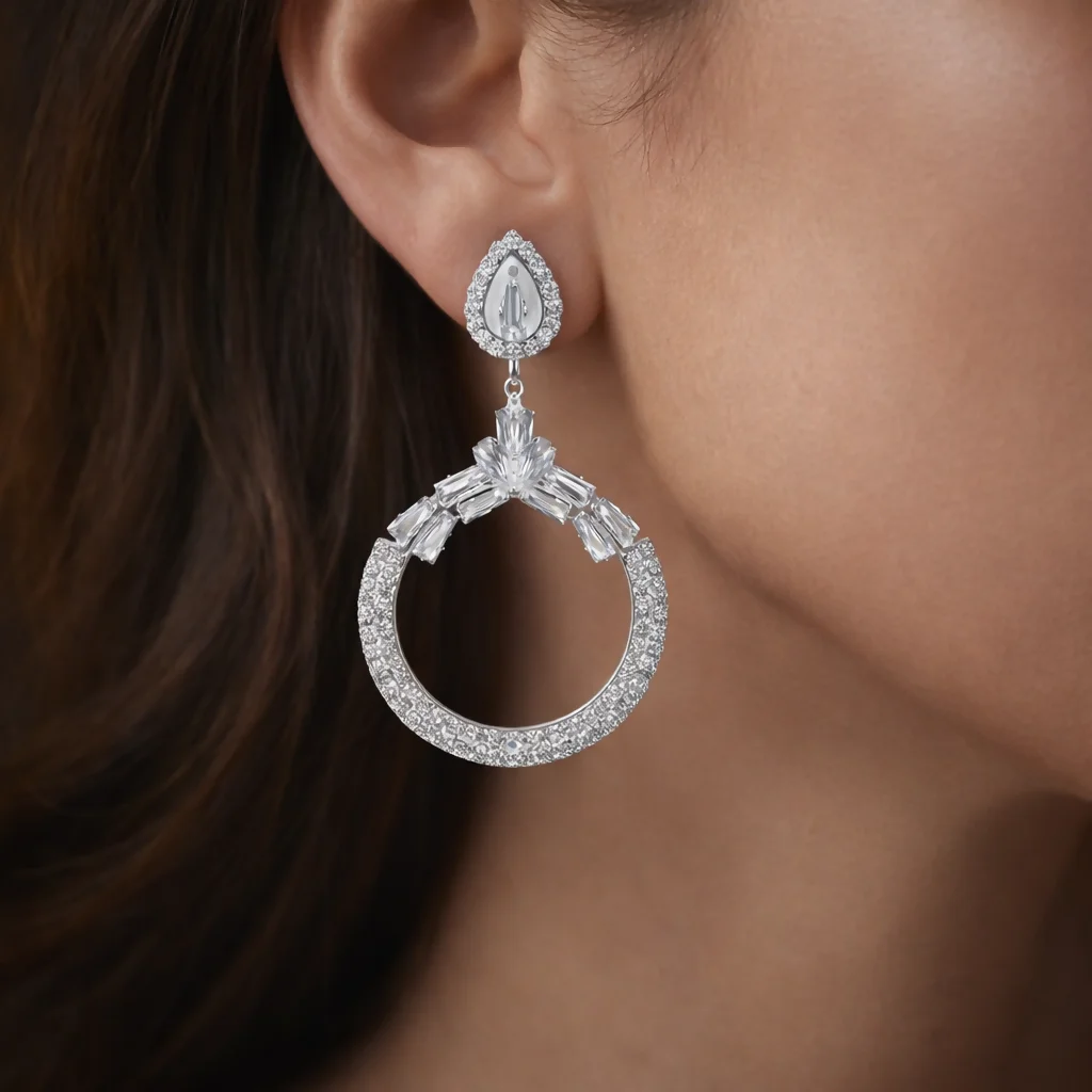 Elevate your elegance with these stunning silver-tone statement earrings, beautifully crafted in a luxurious circular drop design. The top features a delicate teardrop stud surrounded by shimmering stones, leading to a graceful hoop encrusted with fine crystals for maximum sparkle. At the center, a floral-inspired arrangement of baguette and marquise-cut stones adds a touch of sophistication and brilliance. Perfect for weddings, parties, and festive occasions, these glamorous earrings are designed to make you shine effortlessly.