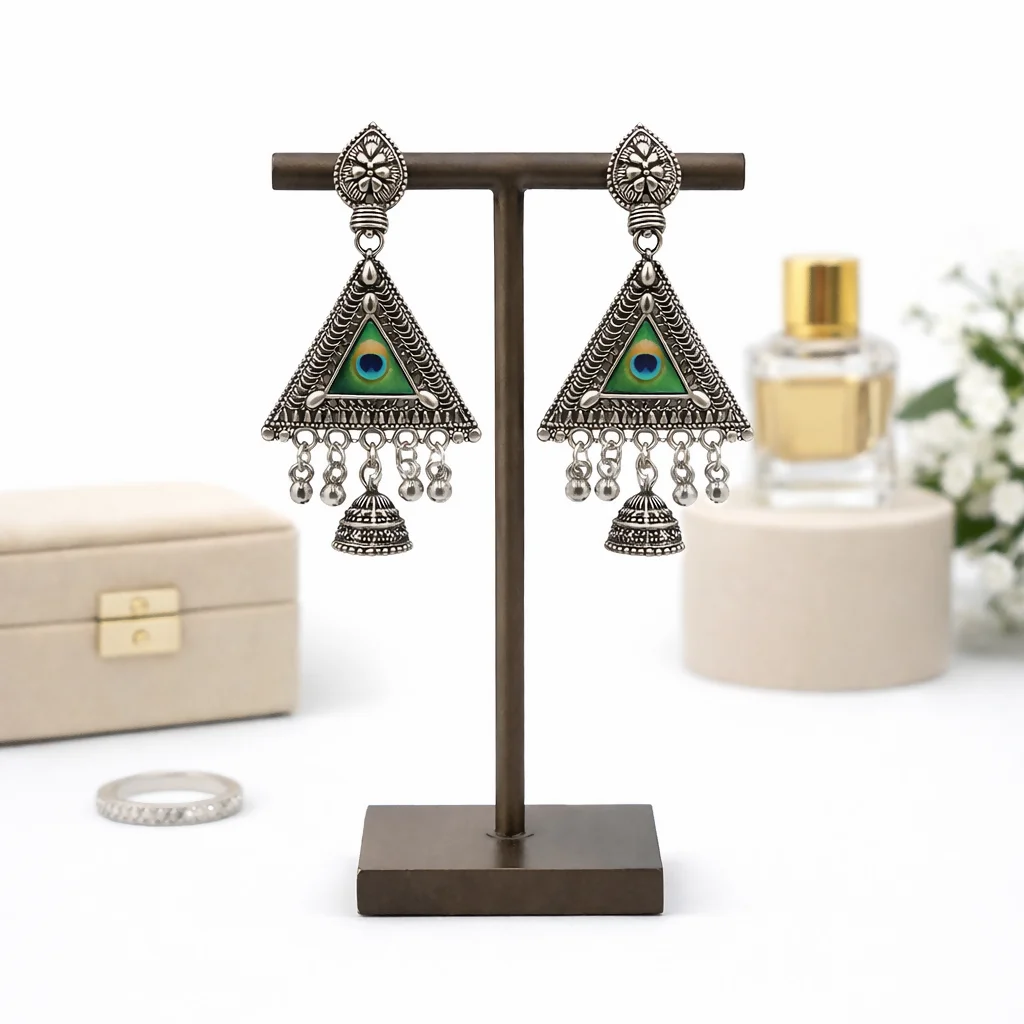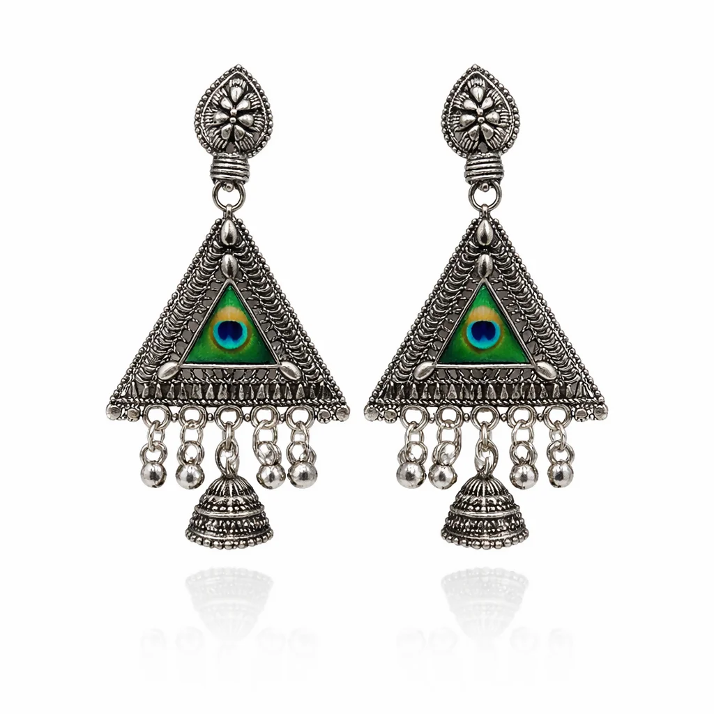 These stunning oxidized silver earrings feature a beautifully detailed teardrop stud connected to a bold triangular centerpiece adorned with a vibrant peacock-eye stone. The intricate tribal-inspired carvings enhance the traditional charm, while the delicate hanging beads and classic jhumka bell add graceful movement and elegance. Perfect for festive occasions, ethnic wear, and statement styling, these earrings blend traditional artistry with a modern touch, making them a must-have addition to any jewelry collection. ✨