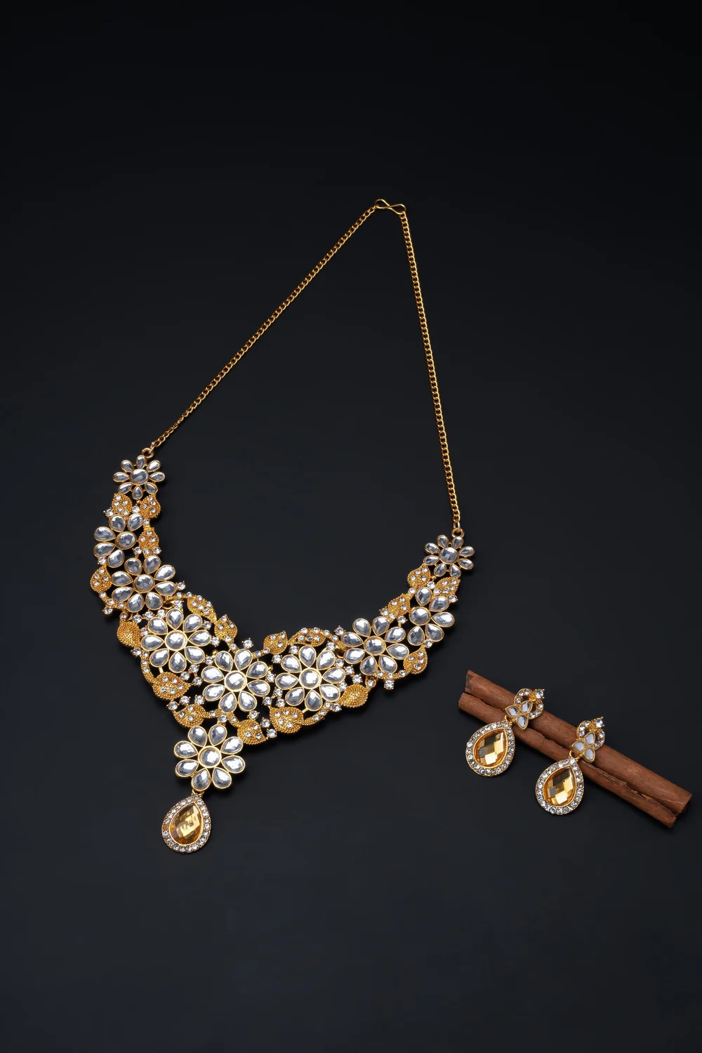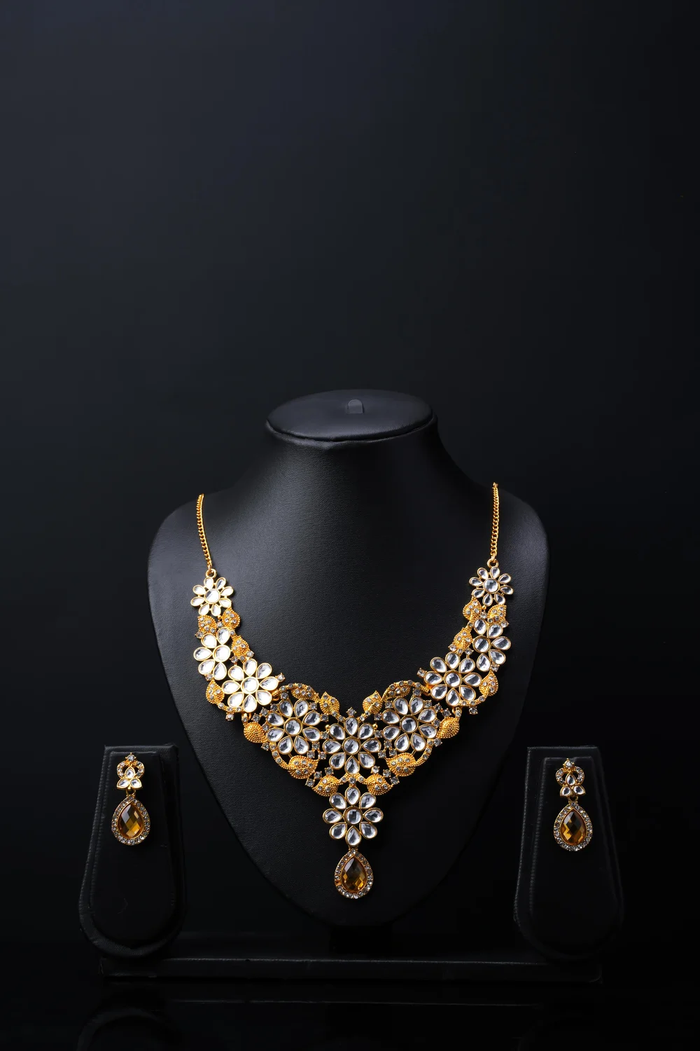 This exquisite flower design har (necklace) and earring set is a stunning blend of nature-inspired elegance and traditional craftsmanship. The necklace features delicate floral motifs, with sparkling gemstones and intricate detailing that create a graceful, feminine look. Paired with matching earrings, the set complements your style with a touch of sophistication and charm. Ideal for weddings, festive celebrations, or any special occasion, this set brings a fresh, floral-inspired twist to classic jewellery. Perfect for those who appreciate beauty, nature, and timeless design in one elegant piece.