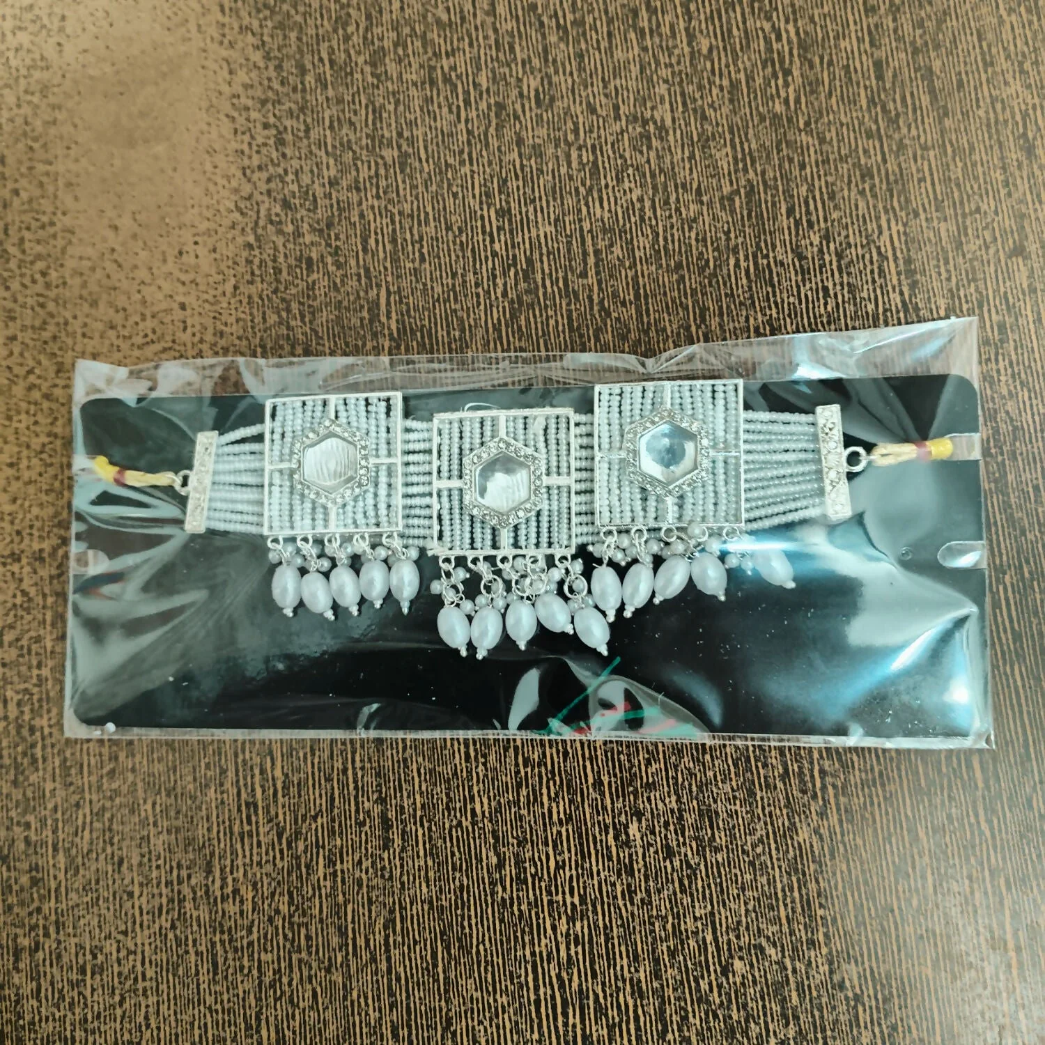Design: A multi-layered choker composed of tiny white seed beads, centered with a square-shaped, silver-toned floral pendant.