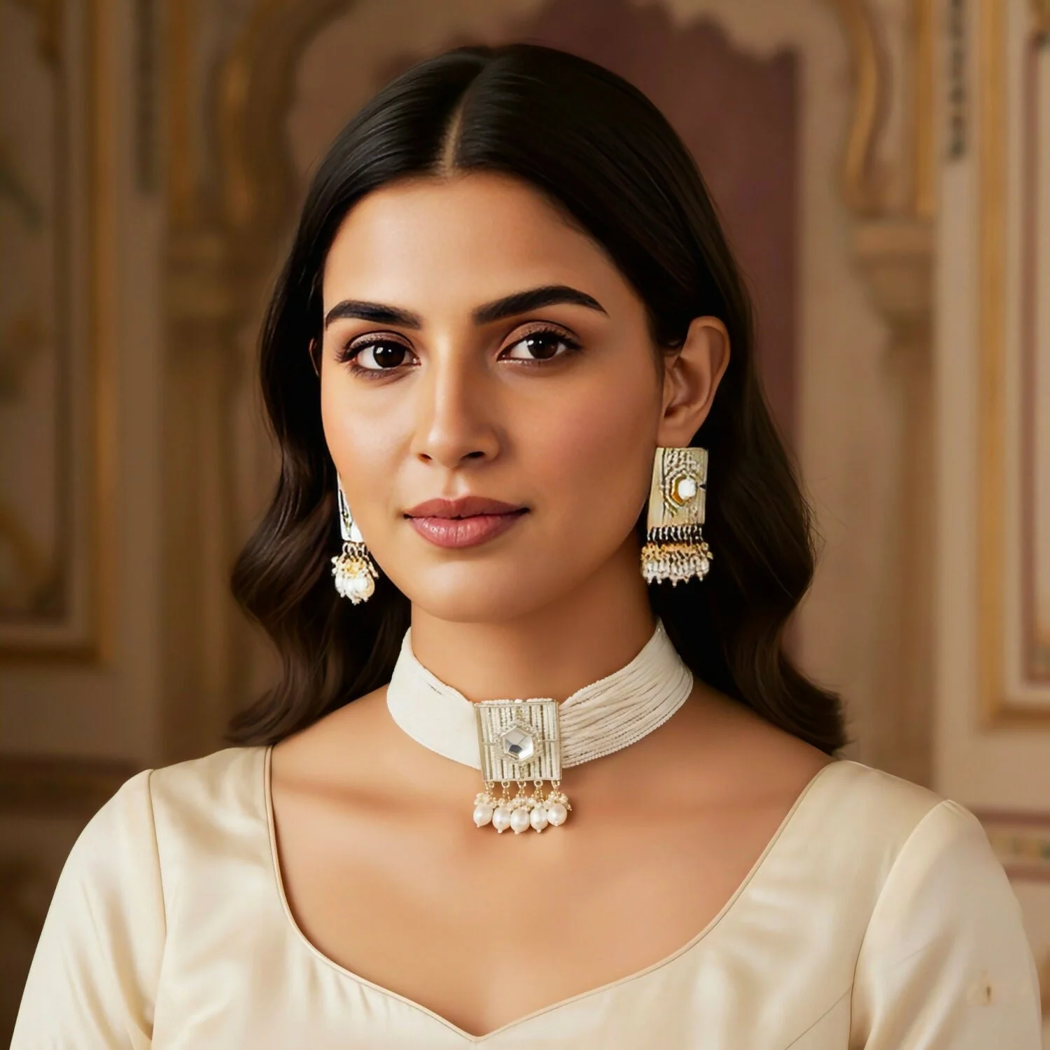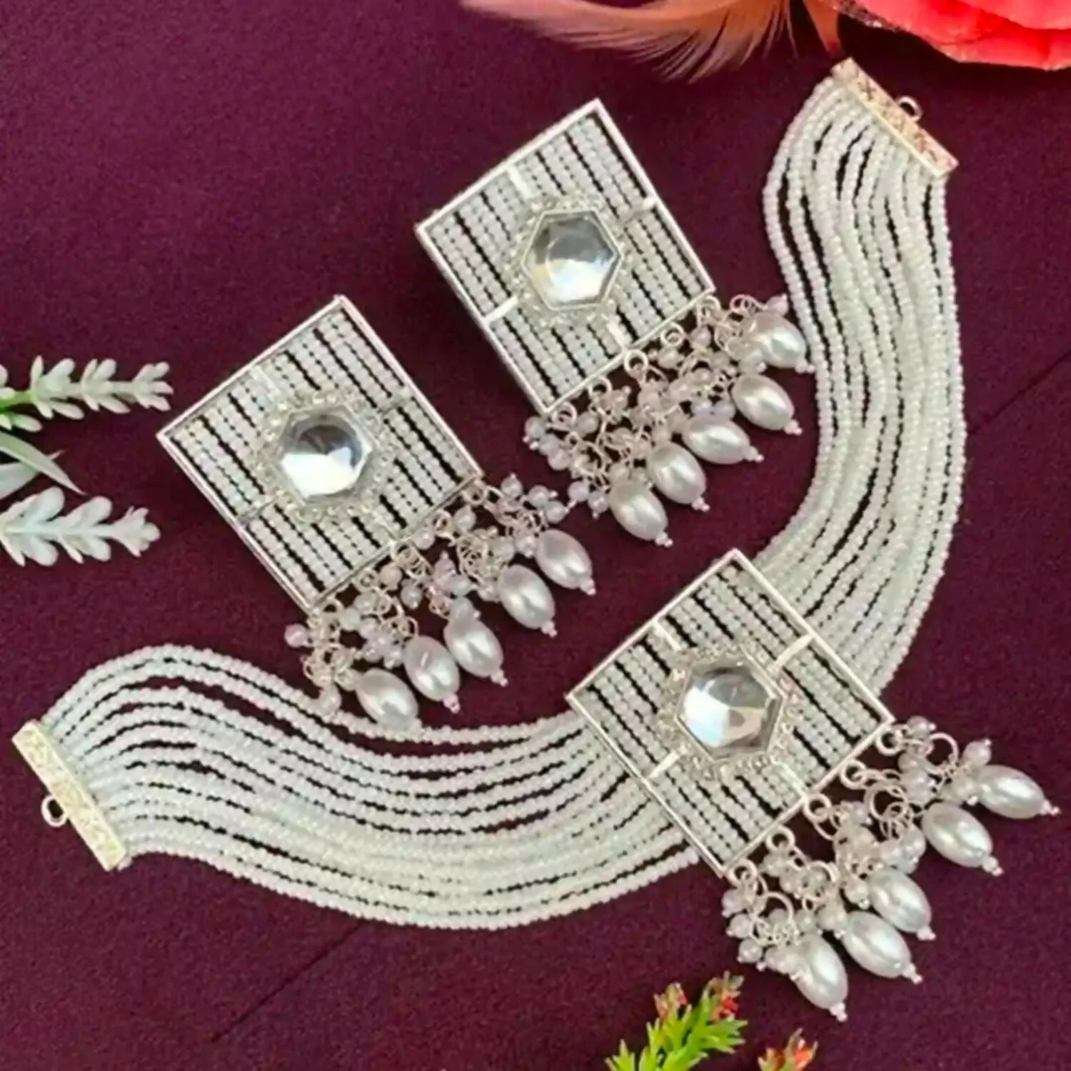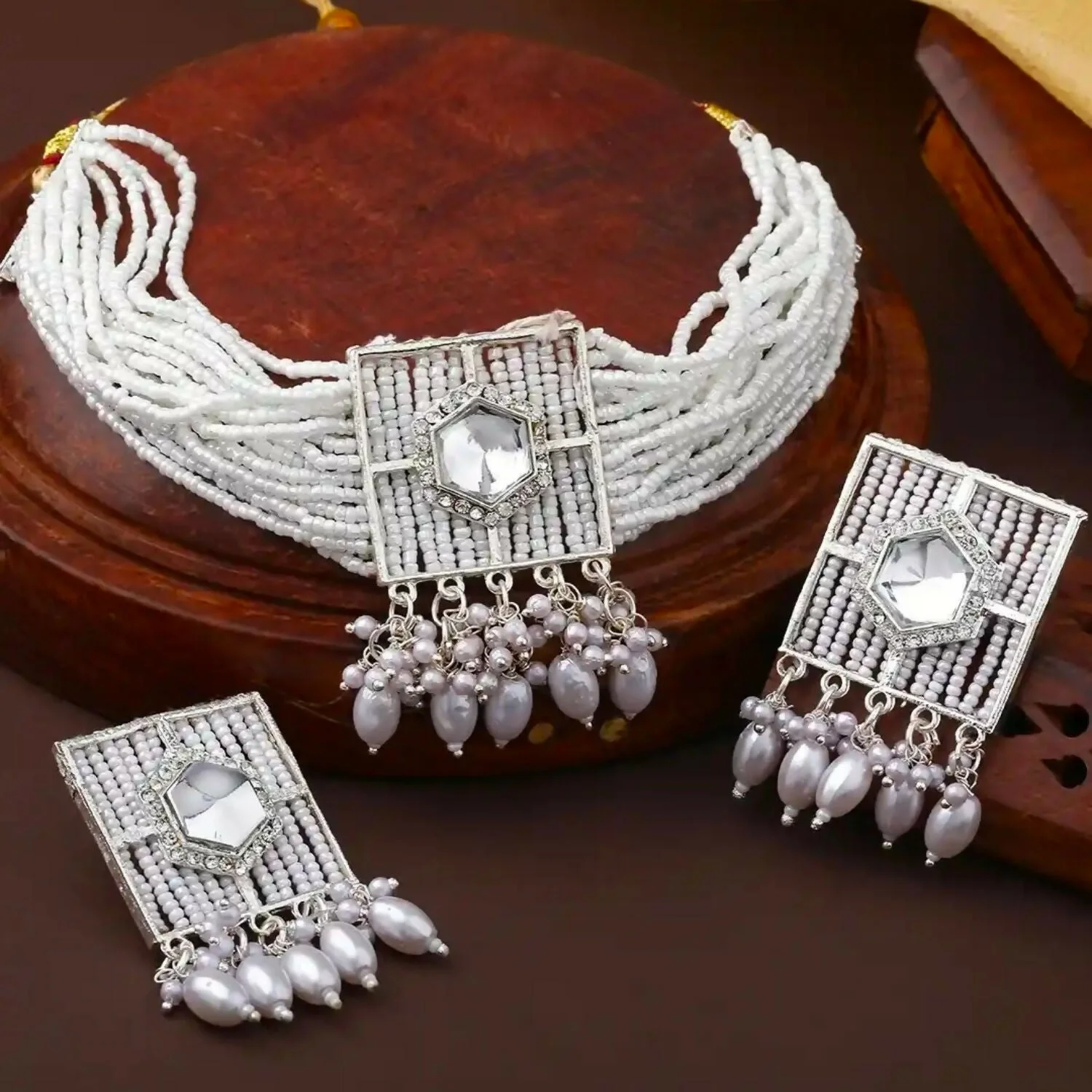 Pair this set with a deep-neck blouse, a pastel silk saree, or a floral lehenga to let the choker take center stage. Its neutral white and silver palette makes it incredibly versatile for both day and night events.