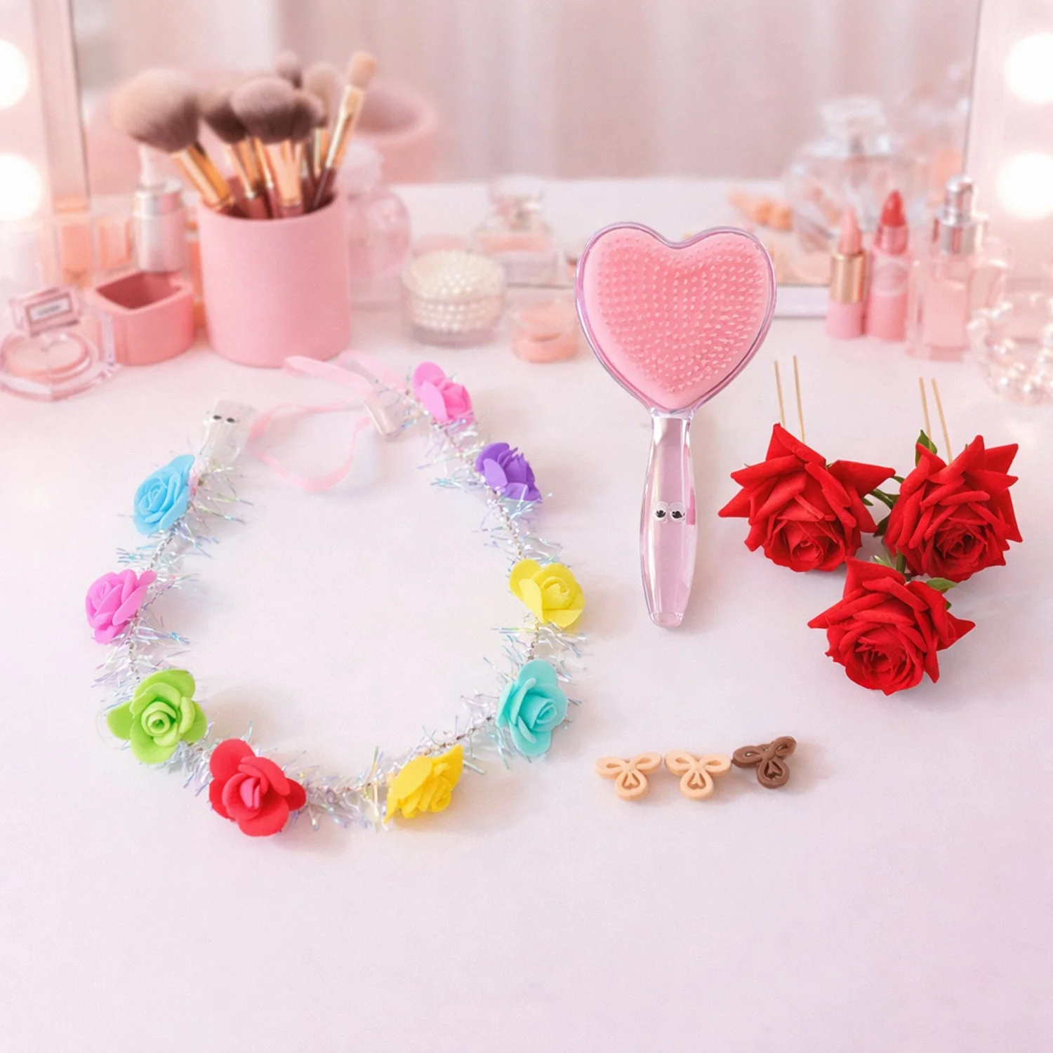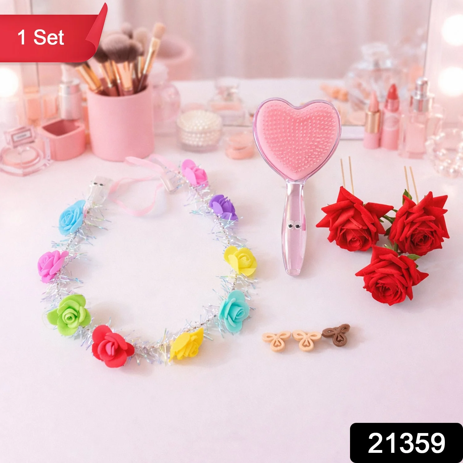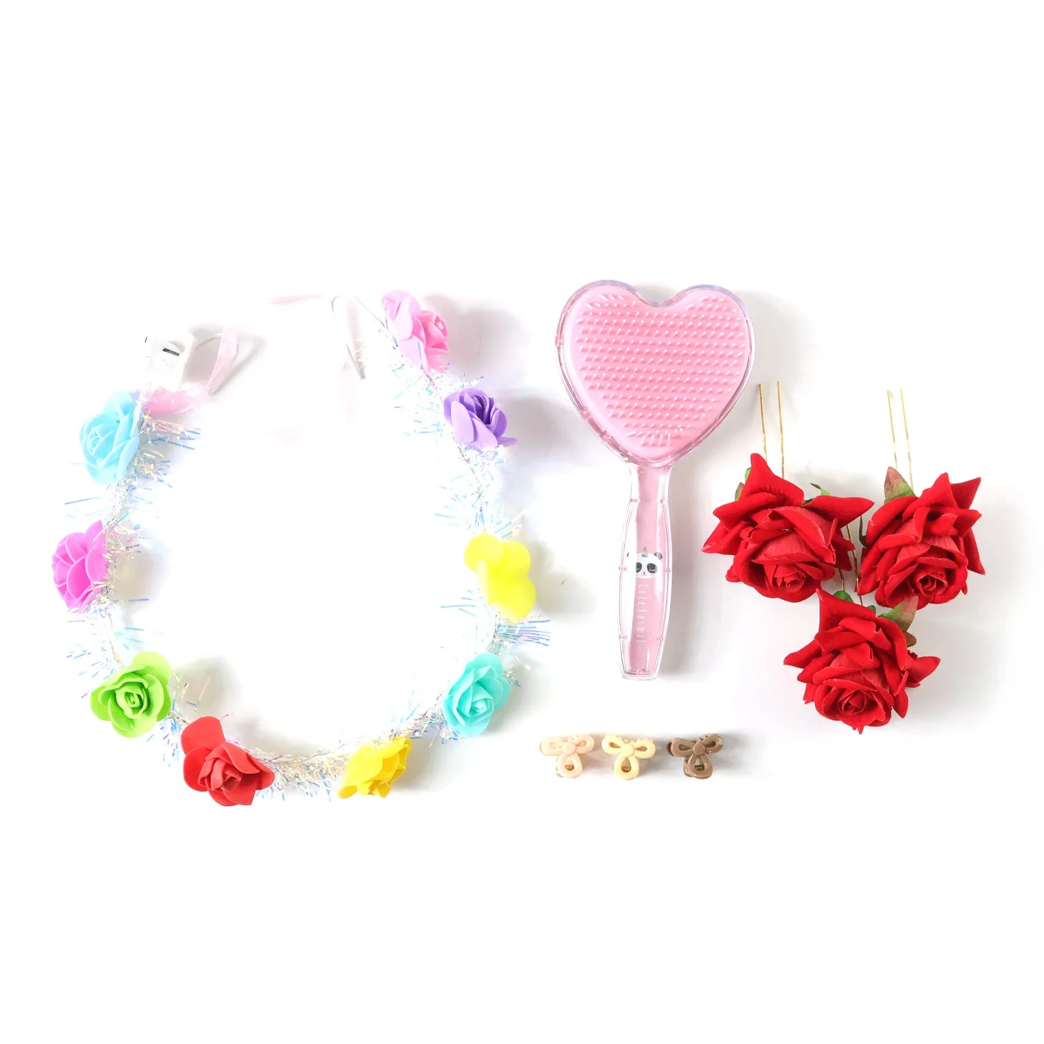 beauty and hair styling combo set, floral hair accessories set, decorative flower hair clips, heart shape detangling hair brush, cute paddle hair brush, artificial rose sticks set, makeup table accessory combo, girls beauty gift set, hair styling accessories kit, decorative vanity table set, gifting combo for girls, women beauty hamper set