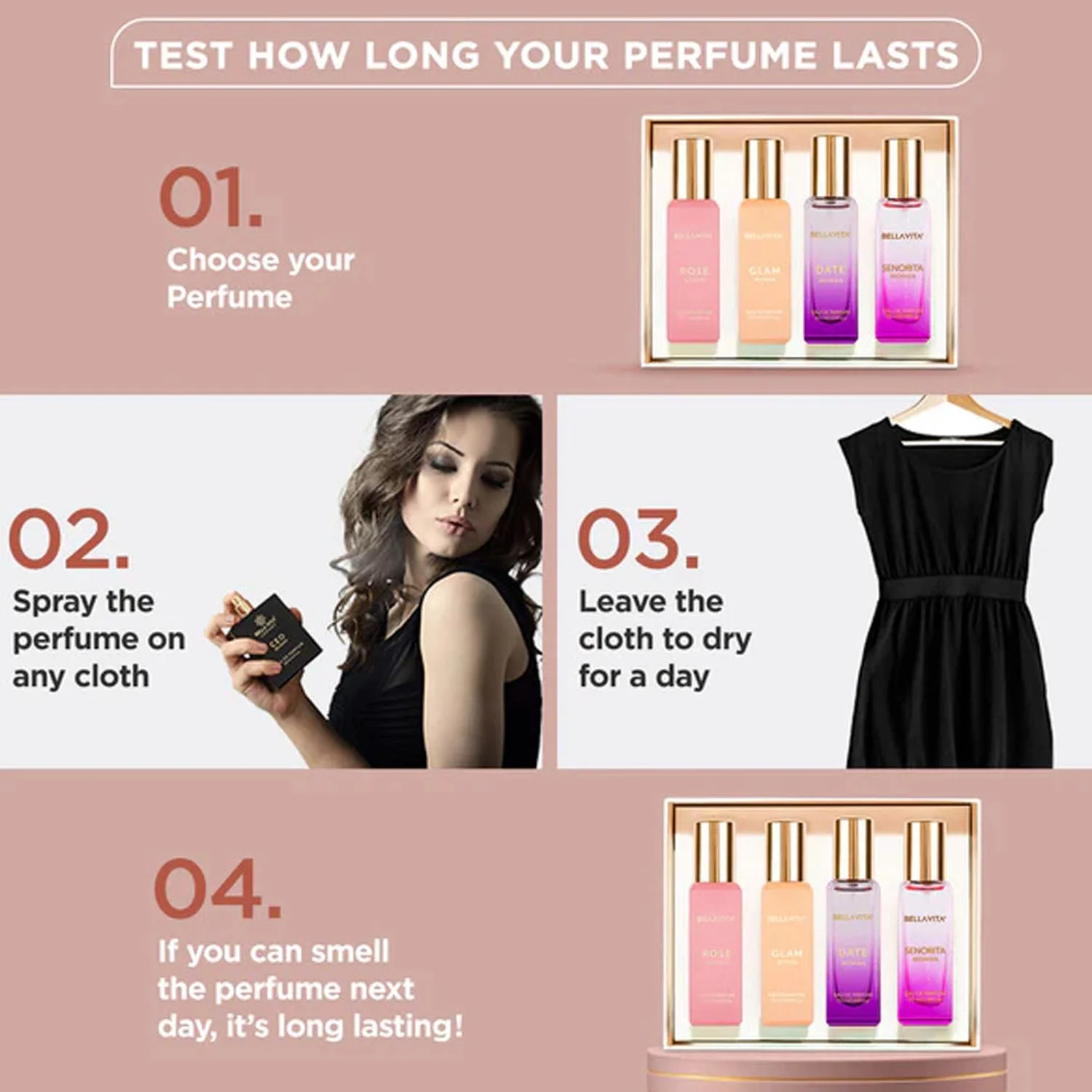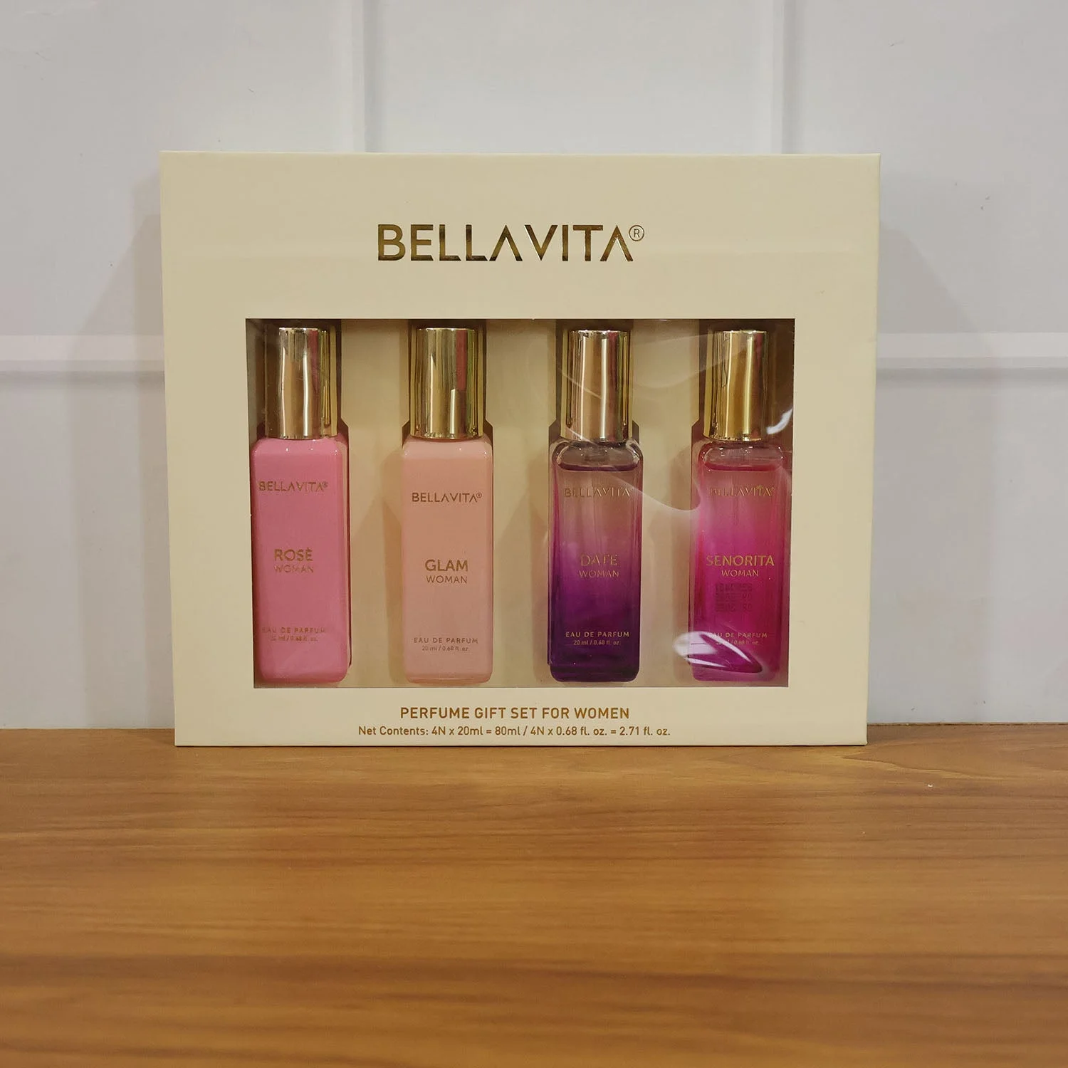 Bellavita Luxury Women Eau De Parfum Gift Set with Rose Woman, Glam Woman, Date Woman & Señorita Woman Long Lasting Premium Fragrance Collection for Daily Wear & Special Occasions 4 Pc 20 ML Each
