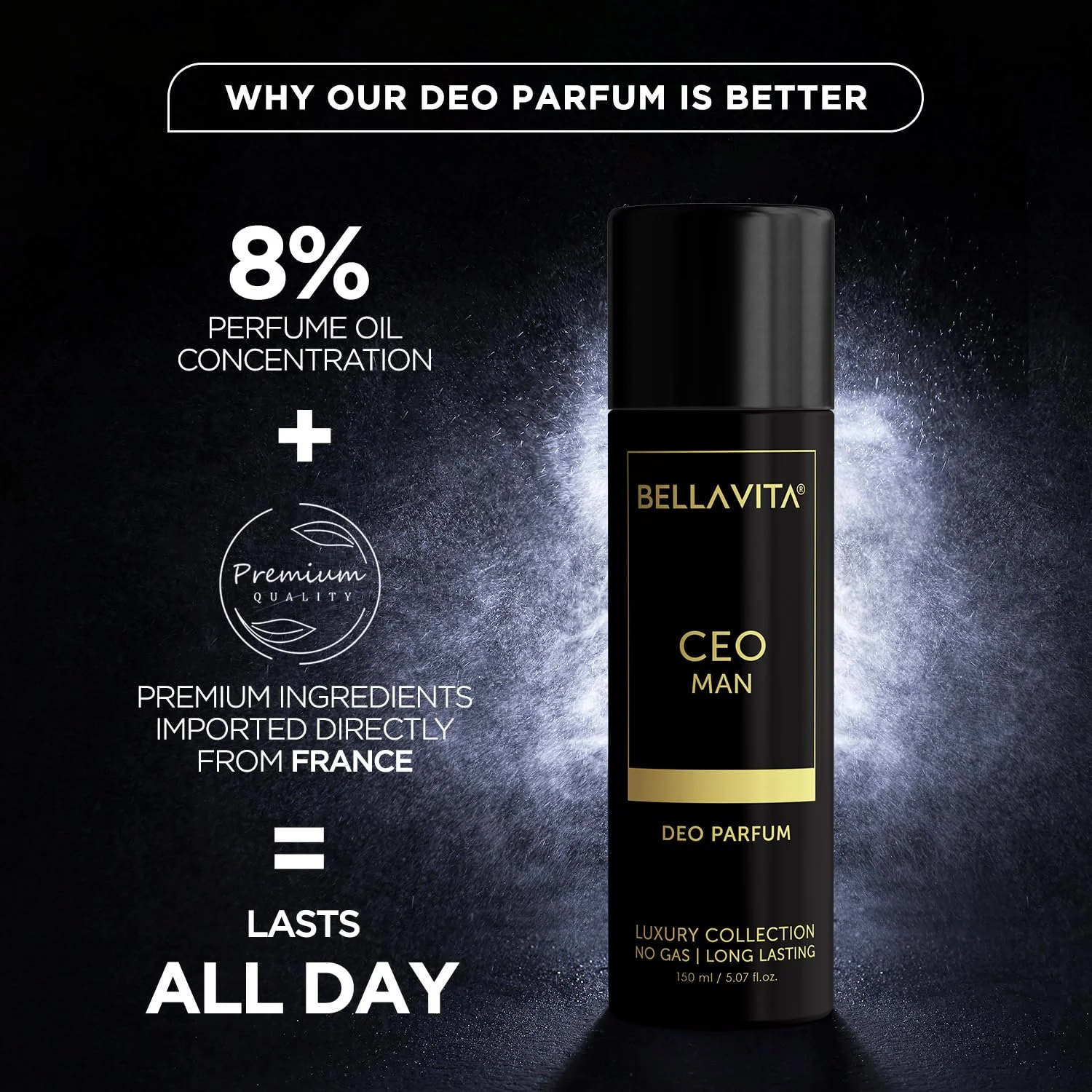 Bellavita Premium CEO Man Luxury Collection No Gas Long Lasting Deo Perfume Body Spray for Men with Premium Bold Masculine Fragrance for Office, Daily Wear & Special Occasions 150 ML