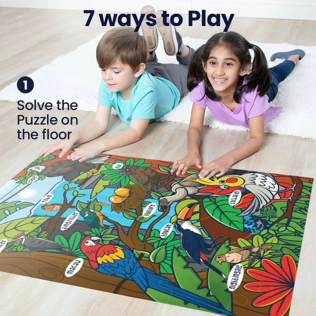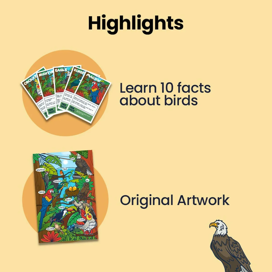 Embark on a vibrant journey through the rainforest canopy with our captivating Rainforest Birds Jigsaw Puzzle! This 38-piece puzzle features stunning illustrations of nine fascinating birds: woodpecker, robin, eagle, owl, macaw, vulture, toucan, nightingale, and cockatiel.