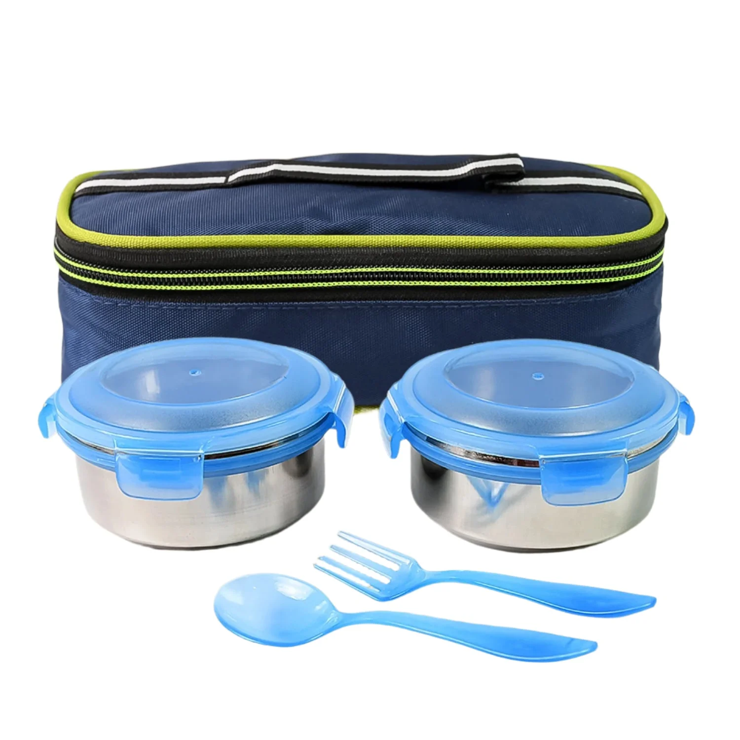 Bite Lunch Box, Stainless Steel Smart Lock N Lock Tiffin Box for Office School, Set of 2 Pcs, Airtight & Leak Proof Containers with Insulated Fabric Bag & Plastic Spoon, Fork, Lightweight Easy to Carry Leak Proof Tiffin Box with Jacket Leakproof Ideal for Office, School (2 Pc Set)