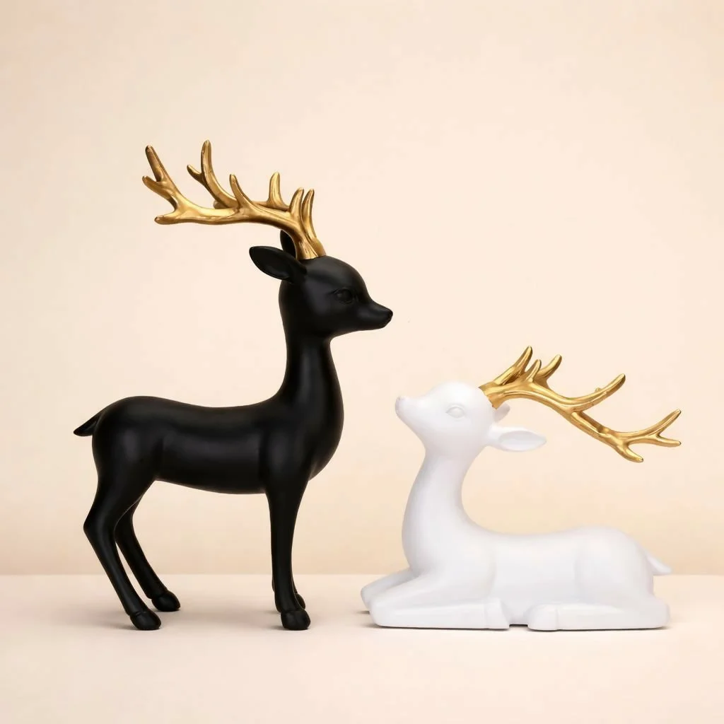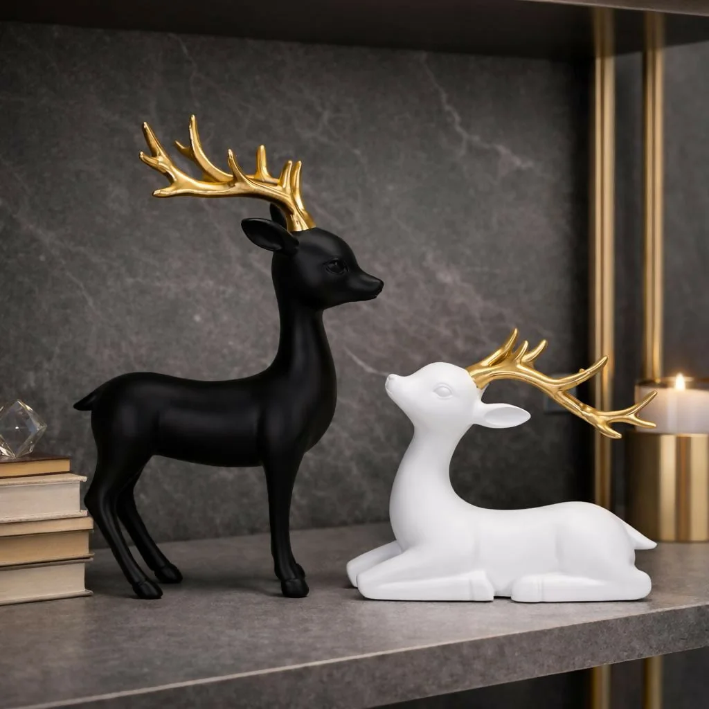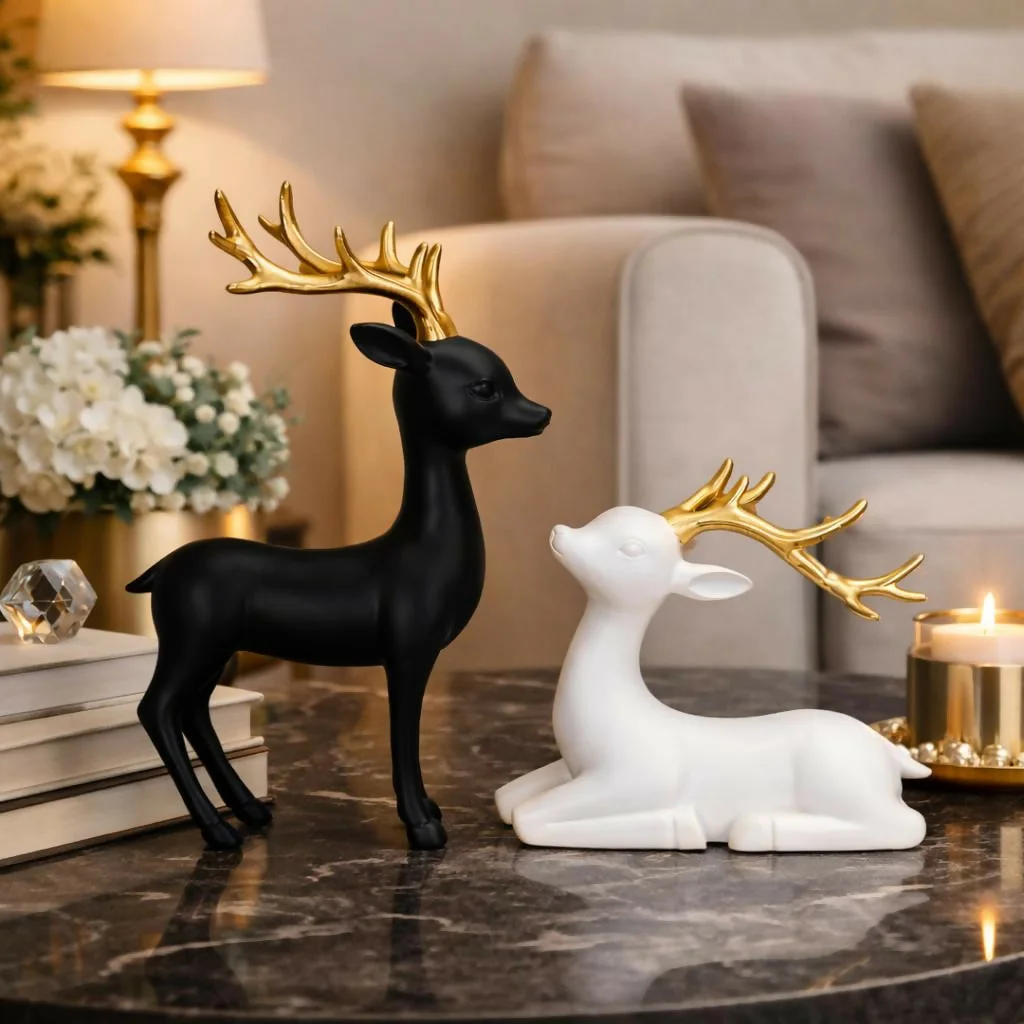 Enhance your décor with this elegant deer showpiece set featuring a modern design and luxurious golden antlers. The contrasting finish adds a premium and stylish touch, making it a perfect addition to living rooms, bedrooms, or office spaces. With one standing deer and one resting deer, this set creates a balanced and artistic display. Ideal for tabletops, shelves, or showcases, it brings charm and sophistication to any interior setting.