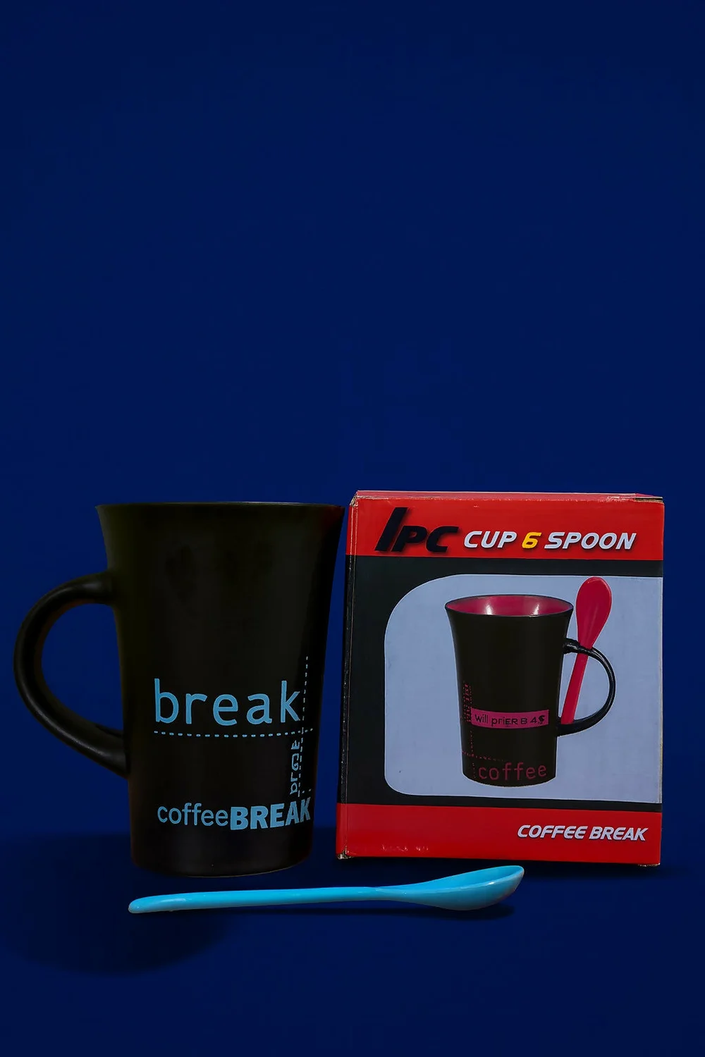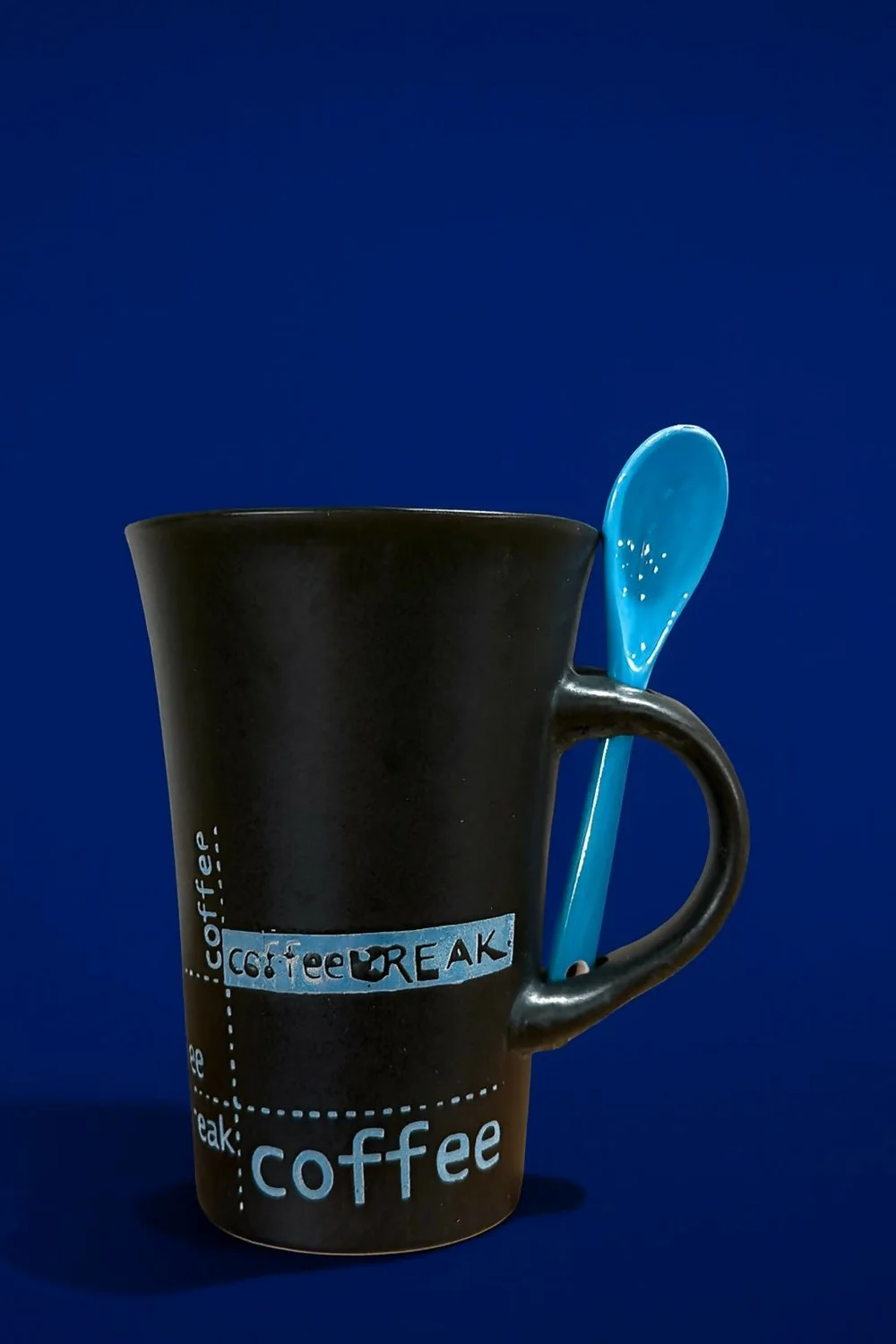 Black coffee mug, ceramic coffee mug with spoon, stylish coffee cup, tea cup with spoon, printed coffee mug, coffee break mug, coffee mug for office, microwave safe mug, dishwasher safe mug, ceramic coffee cup, hot chocolate mug, daily use mug, unique coffee mug, coffee mug gift, modern coffee mug for men and women.
